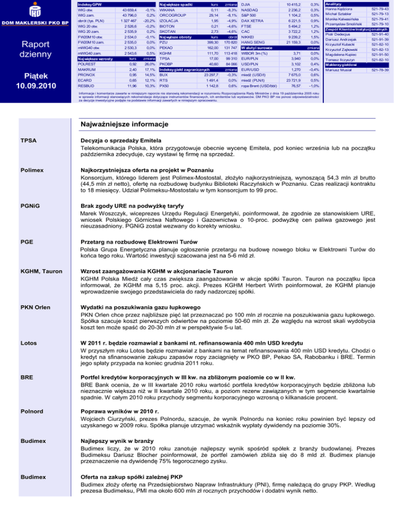 kurs zmiana 10 415,2 0,3% 0,11 -8,3% NASDAQ 2 236,2 0,3% 29,14 1,95 -8,1% -4,9% S&P 500 DAX XETRA 1 104,2 6 221,5 0,5% 0,9% 0,21 2,73 -4,6% -4,6% FTSE CAC 5 494,2 3 722,2 1,2% 1,2% Naj wyższe obroty PZU kurs 399,30 obrót 170 820 NIKKEI HANG SENG 9 239,2 21 159,3 1,5% 0,0% 0,0% 0,5% PEKAO KGHM 162,00 111,70 131 747 113 418 W aluty i surowce WIBOR 3m (%) 3,71 zmiana 0,0% kurs 0,92 zmiana 26,0% TPSA PKOBP 17,00 40,60 99 310 84 066 3,940 3,102 0,0% 0,4% MAKRUM 2,40 17,1% 0,95 0,65 14,5% 12,1% Indeksy giełd zagranicznych BUX 23 297,7 RTS 1 491,4 zmiana PRONOX ECARD RESBUD 11,96 10,3% PX50 Indeksy GPW WIG otw. DOM MAKLERSKI PKO BP Raport dzienny Piątek 10.09.2010 Naj większe spadki WIKANA 43 659,4 -0,1% 43 796,0 1 327 467 0,2% -20,2% WIG 20 otw. WIG 20 zam. 2 526,6 2 535,9 -0,2% 0,2% BIOTON SKOTAN FW20M10 otw. FW20M10 zam. 2 534,0 2 535,0 -0,1% 0,0% mWIG40 otw. mWIG40 zam. 2 530,3 2 543,6 Naj większe wzrosty POLREST WIG zam. obrót (tys. PLN) ORCOGROUP IZOLACJA 1 142,8 -0,3% 0,0% 0,6% DJIA EUR/PLN USD/PLN EUR/USD miedź (USD/t) miedź (PLN/t) ropa Brent (USD/bbl) 1,270 -0,4% 7 675,0 23 721,9 0,6% 0,5% 76,57 -1,0% Analitycy Hanna Kędziora Michał Sztabler 521-79-43 521-79-13 Monika Kalwasińska 521-79-41 Przemysław Smoliński 521-79-10 Zespół Klientów Instytucjonalnych Piotr Dedecjus 521-91-40 Dariusz Andrzejak Krzysztof Kubacki 521-91-39 521-82-10 Krzysztof Zajkowski 521-82-13 Magdalena Kupiec 521-91-50 Tomasz Ilczyszyn 521-82-10 Maklerzy giełdowi Mariusz Musiał 521-78-39 Informacje i komentarze zawarte w niniejszym raporcie nie stanowią rekomendacji w rozumieniu Rozporządzenia Rady Ministrów z dnia 19 października 2005 roku w sprawie informacji stanowiących rekomendacje dotyczące instrumentów finansowych, ich emitentów lub wystawców. DM PKO BP nie ponosi odpowiedzialności za decyzje inwestycyjne podjęte na podstawie informacji zawartych w niniejszym opracowaniu. Najważniejsze informacje TPSA Decyzja o sprzedaży Emitela Telekomunikacja Polska, która przygotowuje obecnie wycenę Emitela, pod koniec września lub na początku października zdecyduje, czy wystawi tę firmę na sprzedaż. Polimex Najkorzystniejsza oferta na projekt w Poznaniu Konsorcjum, którego liderem jest Polimex-Mostostal, złożyło najkorzystniejszą, wynoszącą 54,3 mln zł brutto (44,5 mln zł netto), ofertę na rozbudowę budynku Biblioteki Raczyńskich w Poznaniu. Czas realizacji kontraktu to 18 miesięcy. Udział Polimeksu-Mostostalu w tym konsorcjum to 99 proc. PGNiG Brak zgody URE na podwyżkę taryfy Marek Woszczyk, wiceprezes Urzędu Regulacji Energetyki, poinformował, że zgodnie ze stanowiskiem URE, wniosek Polskiego Górnictwa Naftowego i Gazownictwa o 10-proc. podwyżkę cen paliwa gazowego jest nieuzasadniony. PGNiG został wezwany do korekty wniosku. PGE Przetarg na rozbudowę Elektrowni Turów Polska Grupa Energetyczna planuje ogłoszenie przetargu na budowę nowego bloku w Elektrowni Turów do końca tego roku. Wartość inwestycji szacowana jest na 5-6 mld zł. KGHM, Tauron Wzrost zaangażowania KGHM w akcjonariacie Tauron KGHM Polska Miedź cały czas zwiększa zaangażowanie w akcje spółki Tauron. Tauron na początku lipca informował, że KGHM ma 5,15 proc. akcji. Prezes KGHM Herbert Wirth poinformował, że KGHM planuje wprowadzenie swojego przedstawiciela do rady nadzorczej spółki. PKN Orlen Wydatki na poszukiwania gazu łupkowego PKN Orlen chce przez najbliższe pięć lat przeznaczać po 100 mln zł rocznie na poszukiwania gazu łupkowego. Spółka szacuje koszt pierwszych odwiertów na poziomie 50-60 mln zł. Ze względu na wzrost skali wydobycia koszt ten może spaść do 20-30 mln zł w perspektywie 5-u lat. Lotos W 2011 r. będzie rozmawiał z bankami nt. refinansowania 400 mln USD kredytu W przyszłym roku Lotos będzie rozmawiał z bankami na temat refinansowania 400 mln USD kredytu. Chodzi o kredyt na sfinansowanie zakupu zapasów ropy zaciągnięty w PKO BP, Pekao SA, Rabobanku i BRE. Termin jego spłaty przypada na koniec grudnia 2011 roku. BRE Portfel kredytów korporacyjnych w III kw. na zbliżonym poziomie co w II kw. BRE Bank ocenia, że w III kwartale 2010 roku wartość portfela kredytów korporacyjnych będzie zbliżona lub nieznacznie większa niż w II kwartale 2010 roku, a poziom rezerw zawiązanych w tym segmencie kwartalnie spadnie. W całym 2010 roku przychody segmentu korporacyjnego wzrosną o kilkanaście procent. Polnord Poprawa wyników w 2010 r. Wojciech Ciurzyński, prezes Polnordu, szacuje, że wynik Polnordu na koniec roku powinien być lepszy od uzyskanego w 2009 roku. Spółka planuje utrzymać wskaźnik wypłaty dywidendy na poziomie 30%. Budimex Najlepszy wynik w branży Budimex liczy, że w 2010 roku zanotuje najlepszy wynik spośród spółek z branży budowlanej. Prezes Budimeksu Dariusz Blocher poinformował, że portfel zamówień zbliża się do 8 mld zł. Budimex planuje przeznaczenie na dywidendę 75% tegorocznego zysku. Budimex Oferta na zakup spółki zależnej PKP Budimex złoży ofertę na Przedsiębiorstwo Napraw Infrastruktury (PNI), firmę należącą do grupy PKP. Według prezesa Budimeksu, PMI ma około 600 mln zł rocznych przychodów i dodatni wynik netto. RAPORT DZIENNY DOM MAKLERSKI PKO BP 10.09.2010 Budimex Wybór oferty na budowę drogi ekspresowej S17 GDDKiA wybrała ofertę konsorcjum Budimeksu i Ferrovial Agroman w przetargu na budowę odcinka drogi ekspresowej S17. Wartość kontraktu to 327 mln zł netto Mostostal W-wa Kontrakt w Elektrowni Ostrołęka o wartości 36,1 mln zł Konsorcjum z Mostostalem Warszawa na czele zawarło umowę z Energa Elektrownie Ostrołęka o wartości 36,1 mln zł netto. Przedmiotem umowy jest zaprojektowanie i budowa pozamłynowej instalacji podawania biomasy do kotłów. W skład konsorcjum, poza Mostostalem Warszawa, który stoi na jego czele, wchodzi Instytut Energetyki Jednostka Badawczo-Rozwojowa i Remak. Prace mają zostać zrealizowane do listopada 2011 roku. Introl Wzro