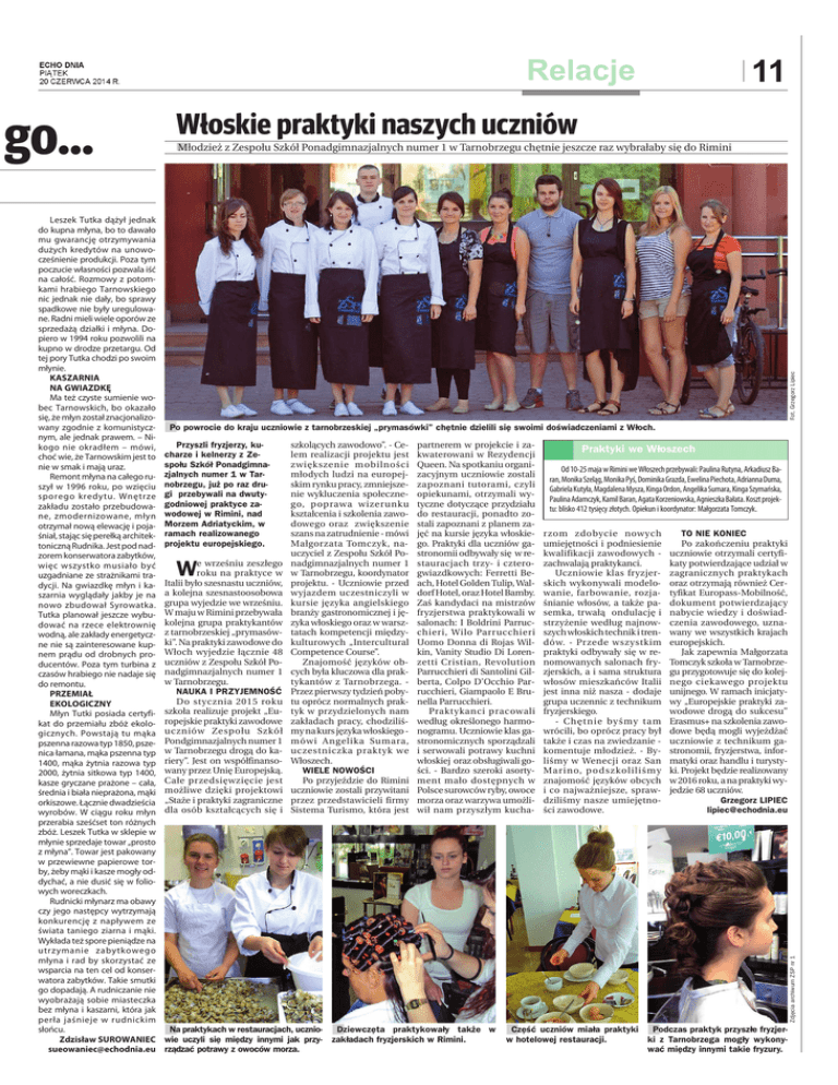 11 Relacje Fot. Grzegorz Lipiec Leszek Tutka d¹¿y³ jednak do kupna m³yna, bo to dawa³o mu gwarancjê otrzymywania du¿ych kredytów na unowoczeœnienie produkcji. Poza tym poczucie w³asnoœci pozwala iœæ na ca³oœæ. Rozmowy z potomkami hrabiego Tarnowskiego nic jednak nie da³y, bo sprawy spadkowe nie by³y uregulowane. Radni mieli wiele oporów ze sprzeda¿¹ dzia³ki i m³yna. Dopiero w 1994 roku pozwolili na kupno w drodze przetargu. Od tej pory Tutka chodzi po swoim m³ynie. KASZARNIA NA GWIAZDKÊ Ma te¿ czyste sumienie wobec Tarnowskich, bo okaza³o siê, ¿e m³yn zosta³ znacjonalizowany zgodnie z komunistycznym, ale jednak prawem. – Nikogo nie okrad³em – mówi, choæ wie, ¿e Tarnowskim jest to nie w smak i maj¹ uraz. Remont m³yna na ca³ego ruszy³ w 1996 roku, po wziêciu sporego kredytu. Wnêtrze zak³adu zosta³o przebudowane, zmodernizowane, m³yn otrzyma³ now¹ elewacjê i pojaœnia³, staj¹c siê pere³k¹ architektoniczn¹ Rudnika. Jest pod nadzorem konserwatora zabytków, wiêc wszystko musia³o byæ uzgadniane ze stra¿nikami tradycji. Na gwiazdkê m³yn i kaszarnia wygl¹da³y jakby je na nowo zbudowa³ Syrowatka. Tutka planowa³ jeszcze wybudowaæ na rzece elektrowniê wodn¹, ale zak³ady energetyczne nie s¹ zainteresowane kupnem pr¹du od drobnych producentów. Poza tym turbina z czasów hrabiego nie nadaje siê do remontu. PRZEMIA£ EKOLOGICZNY M³yn Tutki posiada certyfikat do przemia³u zbó¿ ekologicznych. Powstaj¹ tu m¹ka pszenna razowa typ 1850, pszenica ³amana, m¹ka pszenna typ 1400, m¹ka ¿ytnia razowa typ 2000, ¿ytnia sitkowa typ 1400, kasze gryczane pra¿one – ca³a, œrednia i bia³a niepra¿ona, m¹ki orkiszowe. £¹cznie dwadzieœcia wyrobów. W ci¹gu roku m³yn przerabia szeœæset ton ró¿nych zbó¿. Leszek Tutka w sklepie w m³ynie sprzedaje towar „prosto z m³yna”. Towar jest pakowany w przewiewne papierowe torby, ¿eby m¹ki i kasze mog³y oddychaæ, a nie dusiæ siê w foliowych woreczkach. Rudnicki m³ynarz ma obawy czy jego nastêpcy wytrzymaj¹ konkurencjê z nap³ywem ze œwiata taniego ziarna i m¹ki. Wyk³ada te¿ spore pieni¹dze na utrzymanie zabytkowego m³yna i rad by skorzystaæ ze wsparcia na ten cel od konserwatora zabytków. Takie smutki go dopadaj¹. A rudniczanie nie wyobra¿aj¹ sobie miasteczka bez m³yna i kaszarni, która jak per³a jaœnieje w rudnickim s³oñcu. Zdzis³aw SUROWANIEC [email protected] M³odzie¿ z Zespo³u Szkó³ Ponadgimnazjalnych numer 1 w Tarnobrzegu chêtnie jeszcze raz wybra³aby siê do Rimini n nPo powrocie do kraju uczniowie z tarnobrzeskiej „prymasówki” chêtnie dzielili siê swoimi doœwiadczeniami z W³och. Przyszli fryzjerzy, kucharze i kelnerzy z Zespo³u Szkó³ Ponadgimnazjalnych numer 1 w Tarnobrzegu, ju¿ po raz drugi przebywali na dwutygodniowej praktyce zawodowej w Rimini, nad Morzem Adriatyckim, w ramach realizowanego projektu europejskiego. e wrzeœniu zesz³ego W roku na praktyce w Italii by³o szesnastu uczniów, a kolejna szesnastoosobowa grupa wyjedzie we wrzeœniu. W maju w Rimini przebywa³a kolejna grupa praktykantów z tarnobrzeskiej „prymasówki”. Na praktyki zawodowe do W³och wyjedzie ³¹cznie 48 uczniów z Zespo³u Szkó³ Ponadgimnazjalnych numer 1 w Tarnobrzegu. NAUKA I PRZYJEMNOŒÆ Do stycznia 2015 roku szko³a realizuje projekt „Europejskie praktyki zawodowe uczniów Zespo³u Szkó³ Pondgimnazjalnych numer 1 w Tarnobrzegu drog¹ do kariery”. Jest on wspó³finansowany przez Uniê Europejsk¹. Ca³e przedsiêwziêcie jest mo¿liwe dziêki projektowi „Sta¿e i praktyki zagraniczne dla osób kszta³c¹cych siê i n szkol¹cych zawodowo”. - Celem realizacji projektu jest zwiêkszenie mobilnoœci m³odych ludzi na europejskim rynku pracy, zmniejszenie wykluczenia spo³ecznego, poprawa wizerunku kszta³cenia i szkolenia zawodowego oraz zwiêkszenie szans na zatrudnienie - mówi Ma³gorzata Tomczyk, nauczyciel z Zespo³u Szkó³ Ponadgimnazjalnych numer 1 w Tarnobrzegu, koordynator projektu. - Uczniowie przed wyjazdem uczestniczyli w kursie jêzyka angielskiego bran¿y gastronomicznej i jêzyka w³oskiego oraz w warsztatach kompetencji miêdzykulturowych „Intercultural Competence Course”. Znajomoœæ jêzyków obcych by³a kluczowa dla praktykantów z Tarnobrzega. Przez pierwszy tydzieñ pobytu oprócz normalnych praktyk w przydzielonych nam zak³adach pracy, chodziliœmy na kurs jêzyka w³oskiego mówi Angelika Sumara, uczestniczka praktyk we W³oszech. WIELE NOWOŒCI Po przyjeŸdzie do Rimini uczniowie zostali przywitani przez przedstawicieli firmy Sistema Turismo, która jest Na praktykach w restauracjach, uczniowie uczyli siê miêdzy innymi jak przyrz¹dzaæ potrawy z owoców morza. n partnerem w projekcie i zakwaterowani w Rezydencji Queen. Na spotkaniu organizacyjnym uczniowie zostali zapoznani tutorami, czyli opiekunami, otrzymali wytyczne dotycz¹ce przydzia³u do restauracji, ponadto zostali zapoznani z planem zajêæ na kursie jêzyka w³oskiego. Praktyki dla uczniów gastronomii odbywa³y siê w restauracjach trzy- i czterogwiazdkowych: Ferretti Beach, Hotel Golden Tulip, Waldorf Hotel, oraz Hotel Bamby. Zaœ kandydaci na mistrzów fryzjerstwa praktykowali w salonach: I Boldrini Parrucchieri, Wilo Parrucchieri Uomo Donna di Rojas Wilkin, Vanity Studio Di Lorenzetti Cristian, Revolution Parrucchieri di Santolini Gilberta, Colpo D’Occhio Parrucchieri, Giampaolo E Brunella Parrucchieri. Praktykanci pracowali wed³ug okreœlonego harmonogramu. Uczniowie klas gastronomicznych sporz¹dzali i serwowali potrawy kuchni w³oskiej oraz obs³ugiwali goœci. - Bardzo szeroki asortyment ma³o dostêpnych w Polsce surowców ryby, owoce morza oraz warzywa umo¿liwi³ nam przysz³ym kucha- Dziewczêta praktykowa³y tak¿e w zak³adach fryzjerskich w Rimini. Praktyki we W³oszech Od 10-25 maja w Rimini we W³oszech przebywali: Paulina Rutyna, Arkadiusz Baran, Monika Szel¹g, Monika Pyœ, Dominika Grazda, Ewelina Piechota, 