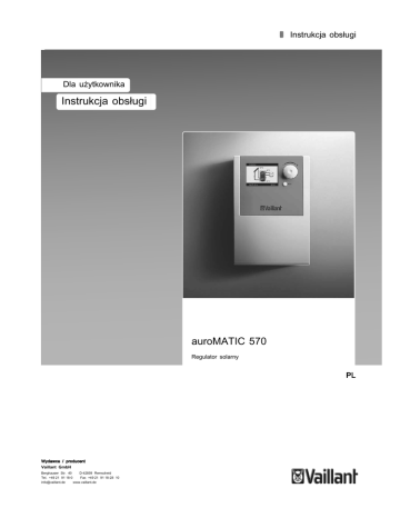 Instrukcja obsługi Dla użytkownika Instrukcja obsługi auroMATIC 570 Regulator solarny PL Wydawca / producent Vaillant GmbH Berghauser Str. 40 D-42859 Remscheid Tel. +49 21 91 18‑0 Fax +49 21 91 18‑28 10 [email protected] www.vaillant.de Spis treści Spis treści 1 1.1 1.2 2 2.1 2.2 2.3 3 3.1 3.2 3.3 3.4 3.5 4 4.1 4.2 4.3 4.4 4.5 4.6 4.7 4.8 4.9 4.10 4.11 4.12 4.13 4.14 4.15 4.16 5 5.1 5.2 2 6 Pielęgnacja i konserwacja.......... 10 6.1 Czyszczenie regulatora ............... 10 Bezpieczeństwo ........................... 3 7 Wycofanie z eksploatacji............ 10 Ogólne wskazówki 7.1 Okresowe wyłączenie bezpieczeństwa ............................. 3 produktu....................................... 10 Użytkowanie zgodne z 7.2 Ostateczne wyłączenie przeznaczeniem............................. 4 produktu z eksploatacji ................ 10 Wskazówki dotyczące 8 Recykling i usuwanie dokumentacji ................................ 5 odpadów .................................... 10 Przestrzegać dokumentacji 8.1 Recykling i usuwanie dodatkowej..................................... 5 odpadów ...................................... 10 Przechowywanie dokumentów ...... 5 9 Gwarancja i serwis ..................... 11 Zakres stosowalności instrukcji ..... 5 9.1 Gwarancja.................................... 11 Opis produktu............................... 5 9.2 Serwis techniczny ........................ 11 Budowa produktu........................... 5 Załącznik .............................................. 12 Pulpit sterowania pracą A Przegląd menu dla urządzenia ..................................... 5 użytkownika ............................... 12 Dane na tabliczce znamionowej .... 5 Numer seryjny................................ 5 Znak CE......................................... 6 Eksploatacja................................. 6 Ilości ciepła .................................... 6 Funkcja urlopu ............................... 6 Żądanie ogrzewania dodatkowego ................................. 6 Regulacja Delta-T i stałej T............ 6 Podniesienie powrotu .................... 6 Blokowanie dogrzewania ............... 6 Chłodzenie zasobnika.................... 6 Zasada obsługi .............................. 6 Ekran podstawowy......................... 7 Poziomy obsługi............................. 7 Uruchomienie produktu.................. 7 Włączanie produktu ....................... 7 Ustawianie języka .......................... 7 Ustawianie daty i godziny .............. 8 Odczyt informacji regulatora .......... 8 Konfiguracje systemu .................... 8 Usuwanie usterek ...................... 10 Sprawdzanie historii usterek........ 10 Rozpoznawanie i usuwanie usterek ......................................... 10 Instrukcja obsługi auroMATIC 570 0020202669_00 Bezpieczeństwo 1 1 Bezpieczeństwo 1.1 Ogólne wskazówki bezpieczeństwa 1.1.1 Niebezpieczeństwo związane z nieprawidłową obsługą Nieprawidłowa obsługa może spowodować zagrożenie dla użytkownika i innych osób oraz doprowadzić do strat materialnych. ▶ Należy dokładnie przeczytać niniejszą instrukcję oraz wszystkie obowiązujące z nią dokumenty dodatkowe, w szczególności rozdział "Bezpieczeństwo" i ostrzeżenia. wieku są narażone na niebezpieczeństwo już przy niższej temperaturze. ▶ Należy dobrać odpowiednią temperaturę zadaną. Jeżeli włączona jest funkcja ochrony przed bakteriami Legionella, należy zapytać instalatora: – kiedy uruchamia się funkcja ochrony przed bakteriami Legionella, – kiedy ciepła woda użytkowa ostygnie do temperatury zadanej, – czy w instalacji grzewczej jest zamontowany zawór mieszający dla ochrony przed poparzeniem, – o czym należy pamiętać, aby zapobiegać poparzeniom. 1.1.2 Zagrożenie życia z powodu Legionelli w wodzie pitnej ▶ Podgrzewać wodę w zasob1.1.4 Ryzyko szkód niku c.w.u. przez co najmniej materialnych jedną godzinę do temperatury spowodowane przez ponad 60 °C raz w tygodniu, mróz aby nie dopuścić do namnażania się bakterii Legionella. Pozostałości wody w kolektorze mogą zamarzać podczas 1.1.3 Niebezpieczeństwo mrozu, powodując uszkodzenie oparzenia gorącą wodą kolektora. użytkową ▶ Napełniać i płukać obieg soW miejscach poboru ciepłej larny wyłącznie naszym pływody użytkowej przy tempenem solarnym. raturze zadanej powyżej 60 °C ▶ Regularnie sprawdzać właistnieje ryzyko oparzeń. Małe sności niezamarzające płynu dzieci oraz osoby w starszym solarnego testerem. 0020202669_00 auroMATIC 570 Instrukcja obsługi 3 1 Bezpieczeństwo 1.2 Użytkowanie zgodne z przeznaczeniem Niefachowe lub niezgodne z przeznaczeniem zastosowanie produktu może spowodować zakłócenie działania produktu lub inne szkody materialne. Produkt reguluje instalację solarno-termiczną do generowania ciepłej wody. Użytkowanie zgodne z przeznaczeniem obejmuje – przestrzeganie dołączonych instrukcji obsługi produktu oraz wszystkich innych podzespołów instalacji – przestrzeganie wszystkich warunków przeglądów i konserwacji wyszczególnionych w instrukcjach. Niniejszy produkt może być używany przez dzieci od 8 lat oraz osoby o ograniczonych zdolnościach fizycznych, sensorycznych lub umysłowych lub o niewystarczającym doświadczeniu i wiedzy wyłącznie, jeżeli są one pod odpowiednią opieką lub zostały pouczone w zakresie bezpiecznej obsługi produktu i rozumieją związane z nim niebezpieczeństwa. Dzieciom nie wolno bawić się produktem. Dzieci bez opieki nie mogą czyścić ani konserwować urządzenia. 4 Zastosowanie inne od opisanego w niniejszej instrukcji lub wykraczające poza opisany zakres jest niezgodne z przeznaczeniem. Niezgodne z przeznaczeniem jest również każde bezpośrednie zastosowanie w celach komercyjnych lub przemysłowych. Uwaga! Zabrania się wszelkiego użytkowania niezgodnego z przeznaczeniem. Instrukcja obsługi auroMATIC 570 0020202669_00 Wskazówki dotyczą