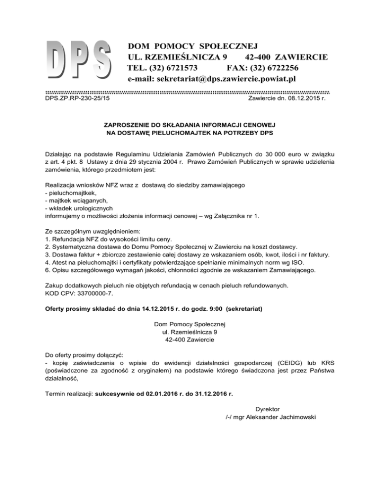 DOM POMOCY SPOŁECZNEJ UL. RZEMIEŚLNICZA 9 42-400 ZAWIERCIE T TEL. (32) 6721573 FAX: (32) 6722256 e-mail: [email protected] …………………………………………………………………………………………………………………….. DPS.ZP.RP-230-25/15 Zawiercie dn. 08.12.2015 r. ZAPROSZENIE DO SKŁADANIA INFORMACJI CENOWEJ NA DOSTAWĘ PIELUCHOMAJTEK NA POTRZEBY DPS Działając na podstawie Regulaminu Udzielania Zamówień Publicznych do 30 000 euro w związku z art. 4 pkt. 8 Ustawy z dnia 29 stycznia 2004 r. Prawo Zamówień Publicznych w sprawie udzielenia zamówienia, którego przedmiotem jest: Realizacja wniosków NFZ wraz z dostawą do siedziby zamawiającego - pieluchomajtkek, - majtkek wciąganych, - wkładek urologicznych informujemy o możliwości złożenia informacji cenowej – wg Załącznika nr 1. Ze szczególnym uwzględnieniem: 1. Refundacja NFZ do wysokości limitu ceny. 2. Systematyczna dostawa do Domu Pomocy Społecznej w Zawierciu na koszt dostawcy. 3. Dostawa faktur + zbiorcze zestawienie całej dostawy ze wskazaniem osób, kwot, ilości i nr faktury. 4. Atest na pieluchomajtki i certyfikaty potwierdzające spełnianie minimalnych norm wg ISO. 6. Opisu szczegółowego wymagań jakości, chłonności zgodnie ze wskazaniem Zamawiającego. Zakup dodatkowych pieluch nie objętych refundacją w cenach pieluch refundowanych. KOD CPV: 33700000-7. Oferty prosimy składać do dnia 14.12.2015 r. do godz. 9:00 (sekretariat) Dom Pomocy Społecznej ul. Rzemieślnicza 9 42-400 Zawiercie Do oferty prosimy dołączyć: - kopię zaświadczenia o wpisie do ewidencji działalności gospodarczej (CEIDG) lub KRS (poświadczone za zgodność z oryginałem) na podstawie którego świadczona jest przez Państwa działalność, Termin realizacji: sukcesywnie od 02.01.2016 r. do 31.12.2016 r. Dyrektor /-/ mgr Aleksander Jachimowski Załącznik nr 1 PIELUCHOMAJTKI NOCNE O PODWYŻSZONEJ CHŁONNOŚCI Cena jednostkowa netto Stawka VAT % Cena jednostkowa brutto Szacunkowa ilość LP. Nazwa 1. Pieluchomajtki roz. M Opis szczegółowy: Ad. 1 11 000 szt. 2. Pieluchomajtki roz. L Opis szczegółowy: Ad. 2 24 200 szt. 3. Majtki wciągane roz. M Opis szczegółowy: Ad. 3 18 000 szt. 4. Majtki wciągane roz. L Opis szczegółowy: Ad. 4 2 200 szt. 5. Wkładki urologiczne XL Opis szczegółowy: Ad. 5 4 500 szt. Wartość brutto Wartość zakupu po refundacji NFZ Zamawiający zastrzega sobie prawo realizacji zamówienia w mniejszej ilości niż podane ilości szacunkowe. Opisy szczegółowe: Ad. 1. Pieluchomajtki roz. M - Nocne o podwyższonej chłonności. Minimalna chłonność nie niższa niż 2800g. - Obwód w biodrach: min. 70-80 cm, max. 125-135 cm. - Elastyczne przylepce rzepy mocujące wielokrotnego zapinania i odpinania (więcej niż dwukrotnie), min. po dwie pary - Falbanki boczne zapobiegające wyciekom, ściśle przylegające, zamontowane do wewnątrz - Pakowane od 10 szt. w oryginalnym, zamkniętym opakowaniu rynkowym, konsumenckim z informacją w języku polskim zawierającą dane o: rozmiarze, instrukcji użytkowania, nazwie handlowej produktu, producencie. Ad. 2. Pieluchomajtki roz. L - Nocne o podwyższonej chłonności. Minimalna chłonność nie niższa niż 3000g. - Obwód w biodrach: min. 90-100cm, max. 150-160 cm. - Elastyczne przylepce rzepy mocujące wielokrotnego zapinania i odpinania (więcej niż dwukrotnie), min. po dwie pary - Falbanki boczne zapobiegające wyciekom, ściśle przylegające, zamontowane do wewnątrz - Pakowane od 10 szt. w oryginalnym, zamkniętym opakowaniu rynkowym, konsumenckim z informacją w języku polskim zawierającą dane o: rozmiarze, Ad. instrukcji użytkowania, nazwie handlowej produktu, producencie. Ad. 3. Majtki wciągane roz. M - Obwód w biodrach: min. 70-80cm, max. 110-120 cm. - Podwójny wkład chłonny według norm ISO - Pakowane od 10 szt. w oryginalnym, zamkniętym opakowaniu rynkowym, konsumenckim z informacją w języku polskim zawierającą dane o: rozmiarze, Ad. instrukcji użytkowania, nazwie handlowej produktu, producencie Ad. 4. Majtki wciągane roz. L - Obwód w biodrach: min. 90-100cm, max. 135-145 cm. - Podwójny wkład chłonny według norm ISO - Pakowane od 10 szt. w oryginalnym, zamkniętym opakowaniu rynkowym, konsumenckim z informacją w języku polskim zawierającą dane o: rozmiarze, Ad. instrukcji użytkowania, nazwie handlowej produktu, producencie Ad. 5 Wkładki urologiczne XL - Wymiar min.: 15 szer, 35 dł. - posiadające szeroki pasek klejowy zapewniający łatwe i pewne mocowanie, - Pakowane od 10 szt. w oryginalnym, zamkniętym opakowaniu rynkowym, konsumenckim z informacją w języku polskim zawierającą dane o: rozmiarze, Ad. instrukcji użytkowania, nazwie handlowej produktu, producencie Wszystkie ww. produkty winny posiadać: - tekstylną powłokę zewnętrzną, miękką i delikatną dla skóry, zapewniającą prawidłową cyrkulację powietrza przy jednoczesnym zabezpieczeniu przed przeciekaniem, - anatomiczny kształt produktu, - dla osób z tendencją do uczuleń nie zawierające elementów lateksowych - system neutralizujący zapach moczu, - wskaźnik wilgotności, zmieniający kolor w miarę napełniania produktu moczem, - warstwę chłonną i materiał absorpcyjny, które mają zapewnić szybkie wchłanianie i zatrzymanie moczu wewnątrz produktu, przez co mają zapewnić skórze suchość i ochronę przed podrażnieniami i odparzeniam, - chłonność żądanych produktów podana wg minimalnej normy ISO 11948-1 lub wyższych wskazanych przez Zamawiającego.