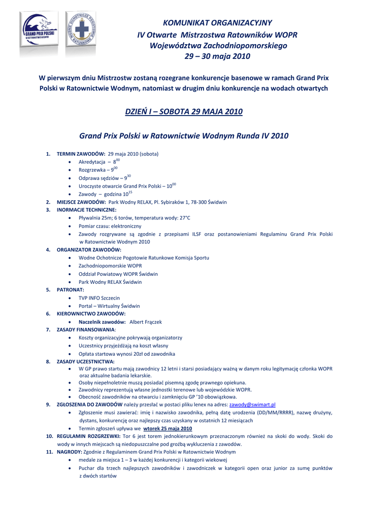 KOMUNIKAT ORGANIZACYJNY IV Otwarte Mistrzostwa Ratowników WOPR Województwa Zachodniopomorskiego 29 – 30 maja 2010 W pierwszym dniu Mistrzostw zostaną rozegrane konkurencje basenowe w ramach Grand Prix Polski w Ratownictwie Wodnym, natomiast w drugim dniu konkurencje na wodach otwartych DZIEŃ I – SOBOTA 29 MAJA 2010 Grand Prix Polski w Ratownictwie Wodnym Runda IV 2010 1. TERMIN ZAWODÓW: 29 maja 2010 (sobota) 00 Akredytacja – 8 00 Rozgrzewka – 9 30 Odprawa sędziów – 9 00 Uroczyste otwarcie Grand Prix Polski – 10 15 Zawody – godzina 10 2. MIEJSCE ZAWODÓW: Park Wodny RELAX, Pl. Sybiraków 1, 78-300 Świdwin 3. INORMACJE TECHNICZNE: Pływalnia 25m; 6 torów, temperatura wody: 27°C Pomiar czasu: elektroniczny Zawody rozgrywane są zgodnie z przepisami ILSF oraz postanowieniami Regulaminu Grand Prix Polski w Ratownictwie Wodnym 2010 4. ORGANIZATOR ZAWODÓW: Wodne Ochotnicze Pogotowie Ratunkowe Komisja Sportu Zachodniopomorskie WOPR Oddział Powiatowy WOPR Świdwin Park Wodny RELAX Świdwin 5. PATRONAT: TVP INFO Szczecin Portal – Wirtualny Świdwin 6. KIEROWNICTWO ZAWODÓW: Naczelnik zawodów: Albert Frączek 7. ZASADY FINANSOWANIA: Koszty organizacyjne pokrywają organizatorzy Uczestnicy przyjeżdżają na koszt własny Opłata startowa wynosi 20zł od zawodnika 8. ZASADY UCZESTNICTWA: W GP prawo startu mają zawodnicy 12 letni i starsi posiadający ważną w danym roku legitymację członka WOPR oraz aktualne badania lekarskie. Osoby niepełnoletnie muszą posiadad pisemną zgodę prawnego opiekuna. Zawodnicy reprezentują własne jednostki terenowe lub wojewódzkie WOPR. Obecnośd zawodników na otwarciu i zamknięciu GP ’10 obowiązkowa. 9. ZGŁOSZENIA DO ZAWODÓW należy przesład w postaci pliku lenex na adres: [email protected] Zgłoszenie musi zawierad: imię i nazwisko zawodnika, pełną datę urodzenia (DD/MM/RRRR), nazwę drużyny, dystans, konkurencję oraz najlepszy czas uzyskany w ostatnich 12 miesiącach Termin zgłoszeo upływa we wtorek 25 maja 2010 10. REGULAMIN ROZGRZEWKI: Tor 6 jest torem jednokierunkowym przeznaczonym również na skoki do wody. Skoki do wody w innych miejscach są niedopuszczalne pod groźbą wykluczenia z zawodów. 11. NAGRODY: Zgodnie z Regulaminem Grand Prix Polski w Ratownictwie Wodnym medale za miejsca 1 – 3 w każdej konkurencji i kategorii wiekowej Puchar dla trzech najlepszych zawodników i zawodniczek w kategorii open oraz junior za sumę punktów z dwóch startów 12. PROGRAM ZAWODÓW: Kobiety 1 200m z przeszkodami 3 100m z przeszkodami (tylko 11-13lat) 5 50m holowanie manekina 7 25m holowanie manekina (tylko 11-13lat) 9 100m ratowanie w płetwach 11 100m ratownik 13 4x25m sztafeta holowanie manekina 2 4 6 8 10 12 14 Mężczyźni 200m z przeszkodami 100m z przeszkodami (tylko 11-13lat) 50m holowanie manekina 25m holowanie manekina (tylko 11-13lat) 100m ratowanie w płetwach 100m ratownik 4x25m sztafeta holowanie manekina 13. POSTANOWIENIA KOOCOWE: zgłoszenie do zawodów jest równoznaczne z akceptacją postanowieo niniejszego komunikatu oraz Regulaminu Grand Prix Polski w Ratownictwie Wodnym 2010 Prawo interpretacji Regulaminu Grand Prix w Ratownictwie Wodnym przysługuje organizatorom W sprawach nie uregulowanych regulaminem decyduje przedstawiciel Komisji Sportu WOPR Organizator zastrzega sobie prawo do korekty czasowo – programowej zawodów. DZIEŃ II – NIEDIELA 30 MAJA 2010 Mistrzostwa Ratowników WOPR Województwa Zachodniopomorskiego na Wodach Otwartych 14. TERMIN ZAWODÓW: 30 maja 2010 (niedziela) 00 Zbiórka nad jeziorem Bukowiec – 10 30 Rozgrzewka – 10 30 Odprawa techniczna kierowników drużyn i sędziów – 10 00 Uroczyste otwarcie zawodów – 11 15 Zawody – godzina 11 00 Uroczyste zamknięcie zawodów – godzina 15 15. MIEJSCE ZAWODÓW: Piaszczysta plaża nad jeziorem Bukowiec 16. INORMACJE TECHNICZNE: Piaszczysta plaża o szerokości 100m z pomostem drewnianym i łagodnym dnem Pomiar czasu: ręczny Zawody rozgrywane są zgodnie z opisem konkurencji w pkt. 24 niniejszego komunikatu 17. ORGANIZATOR ZAWODÓW: Zachodniopomorskie WOPR Oddział Powiatowy WOPR Świdwin Park Wodny RELAX Świdwin 18. PATRONAT: TVP INFO Szczecin Portal – Wirtualny Świdwin 19. KIEROWNICTWO ZAWODÓW: Naczelnik zawodów: Albert Frączek 20. ZASADY FINANSOWANIA: Koszty organizacyjne pokrywają organizatorzy Uczestnicy przyjeżdżają na koszt własny Opłata startowa wynosi 20zł od zawodnika 21. ZASADY UCZESTNICTWA: W zawodach prawo startu mają drużyny 6 - osobowe WOPR Warunkiem uczestnictwa jest ważna legitymacja ratownika WOPR ZGŁOSZENIA DO ZAWODÓW należy przesład na załączonym formularzu (pkt. 6) na adres: [email protected] w nieprzekraczalnym terminie do wtorku 25 maja 2010 22. NAGRODY: medale za najlepsze wyniki indywidualne puchar dla trzech najlepszych drużyn dyplomy dla wszystkich uczestników 23. PROGRAM ZAWODÓW: NAZWA KONKURENCJI 1 Wyścig łodzi wiosłowych 2 Akcja z kołowrotem 3 Rzut rzutką do pozoranta 4 Akcja kombinowana (bieg 200m – pływanie 100m – bieg 200m – RKO na fantomie) 24. OPIS KONKURENCJI ROZGRYWANYCH NA JEZIORZE Wyścig łodzi wiosłowych W konkurencji bierze udział dwóch wiosłujących ratowników. Ratownicy stoją w odległości 5m od łodzi i na sygnał startera podbiegają do łodzi, wypychają ją do wody, zajmują miejsca w łodzi i płyną po wyznaczonym torze w kształcie trójkąta prostokątnego. Start i meta w tym samym miejscu. Czas jest zatrzymywany po wyciągnięciu łodzi rufą na linie startu. Akcja z kołowrotem W konkurencji udział bierze4 ratowników - pozorant, ratownik płynący z liną asekuracyjną i dwóch ściągających liną ratowników. Zespół stoi w wyznaczonym sektorze startu. Na sygnał startera pozorant wbiega do wody i płynie do wyznaczonej boi. Po dopłynięciu do boi podnosi rękę i jest to jednocześnie znak do startu dla ratownika płynącego z liną asekuracyjną. Po dopłynięciu do pozoranta chwyta go i podnosi rękę. Na ten s