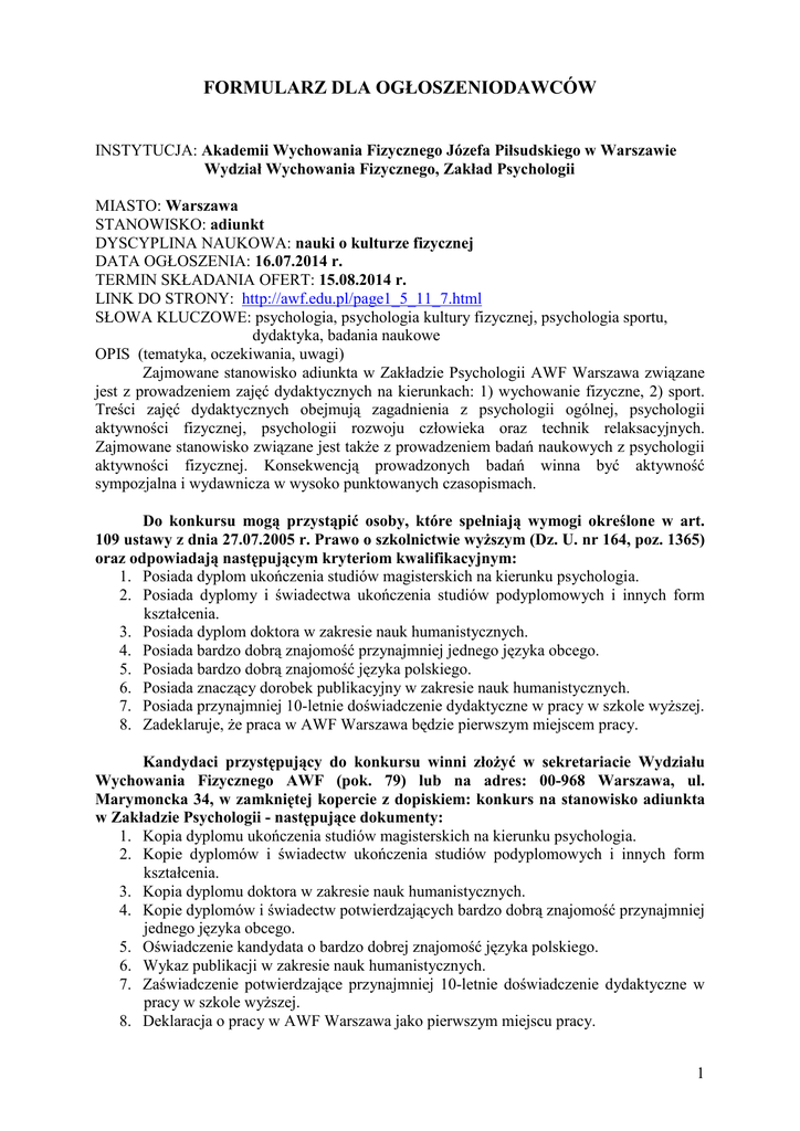 FORMULARZ DLA OGŁOSZENIODAWCÓW INSTYTUCJA: Akademii Wychowania Fizycznego Józefa Piłsudskiego w Warszawie Wydział Wychowania Fizycznego, Zakład Psychologii MIASTO: Warszawa STANOWISKO: adiunkt DYSCYPLINA NAUKOWA: nauki o kulturze fizycznej DATA OGŁOSZENIA: 16.07.2014 r. TERMIN SKŁADANIA OFERT: 15.08.2014 r. LINK DO STRONY: http://awf.edu.pl/page1_5_11_7.html SŁOWA KLUCZOWE: psychologia, psychologia kultury fizycznej, psychologia sportu, dydaktyka, badania naukowe OPIS (tematyka, oczekiwania, uwagi) Zajmowane stanowisko adiunkta w Zakładzie Psychologii AWF Warszawa związane jest z prowadzeniem zajęć dydaktycznych na kierunkach: 1) wychowanie fizyczne, 2) sport. Treści zajęć dydaktycznych obejmują zagadnienia z psychologii ogólnej, psychologii aktywności fizycznej, psychologii rozwoju człowieka oraz technik relaksacyjnych. Zajmowane stanowisko związane jest takŜe z prowadzeniem badań naukowych z psychologii aktywności fizycznej. Konsekwencją prowadzonych badań winna być aktywność sympozjalna i wydawnicza w wysoko punktowanych czasopismach. Do konkursu mogą przystąpić osoby, które spełniają wymogi określone w art. 109 ustawy z dnia 27.07.2005 r. Prawo o szkolnictwie wyŜszym (Dz. U. nr 164, poz. 1365) oraz odpowiadają następującym kryteriom kwalifikacyjnym: 1. Posiada dyplom ukończenia studiów magisterskich na kierunku psychologia. 2. Posiada dyplomy i świadectwa ukończenia studiów podyplomowych i innych form kształcenia. 3. Posiada dyplom doktora w zakresie nauk humanistycznych. 4. Posiada bardzo dobrą znajomość przynajmniej jednego języka obcego. 5. Posiada bardzo dobrą znajomość języka polskiego. 6. Posiada znaczący dorobek publikacyjny w zakresie nauk humanistycznych. 7. Posiada przynajmniej 10-letnie doświadczenie dydaktyczne w pracy w szkole wyŜszej. 8. Zadeklaruje, Ŝe praca w AWF Warszawa będzie pierwszym miejscem pracy. Kandydaci przystępujący do konkursu winni złoŜyć w sekretariacie Wydziału Wychowania Fizycznego AWF (pok. 79) lub na adres: 00-968 Warszawa, ul. Marymoncka 34, w zamkniętej kopercie z dopiskiem: konkurs na stanowisko adiunkta w Zakładzie Psychologii - następujące dokumenty: 1. Kopia dyplomu ukończenia studiów magisterskich na kierunku psychologia. 2. Kopie dyplomów i świadectw ukończenia studiów podyplomowych i innych form kształcenia. 3. Kopia dyplomu doktora w zakresie nauk humanistycznych. 4. Kopie dyplomów i świadectw potwierdzających bardzo dobrą znajomość przynajmniej jednego języka obcego. 5. Oświadczenie kandydata o bardzo dobrej znajomość języka polskiego. 6. Wykaz publikacji w zakresie nauk humanistycznych. 7. Zaświadczenie potwierdzające przynajmniej 10-letnie doświadczenie dydaktyczne w pracy w szkole wyŜszej. 8. Deklaracja o pracy w AWF Warszawa jako pierwszym miejscu pracy. 1