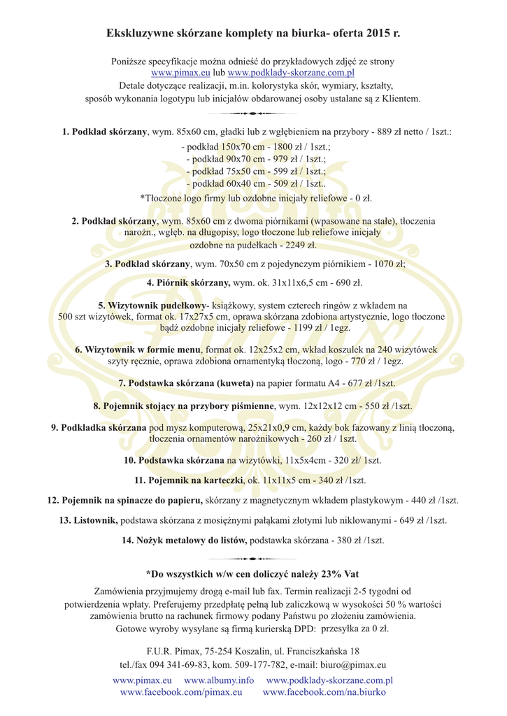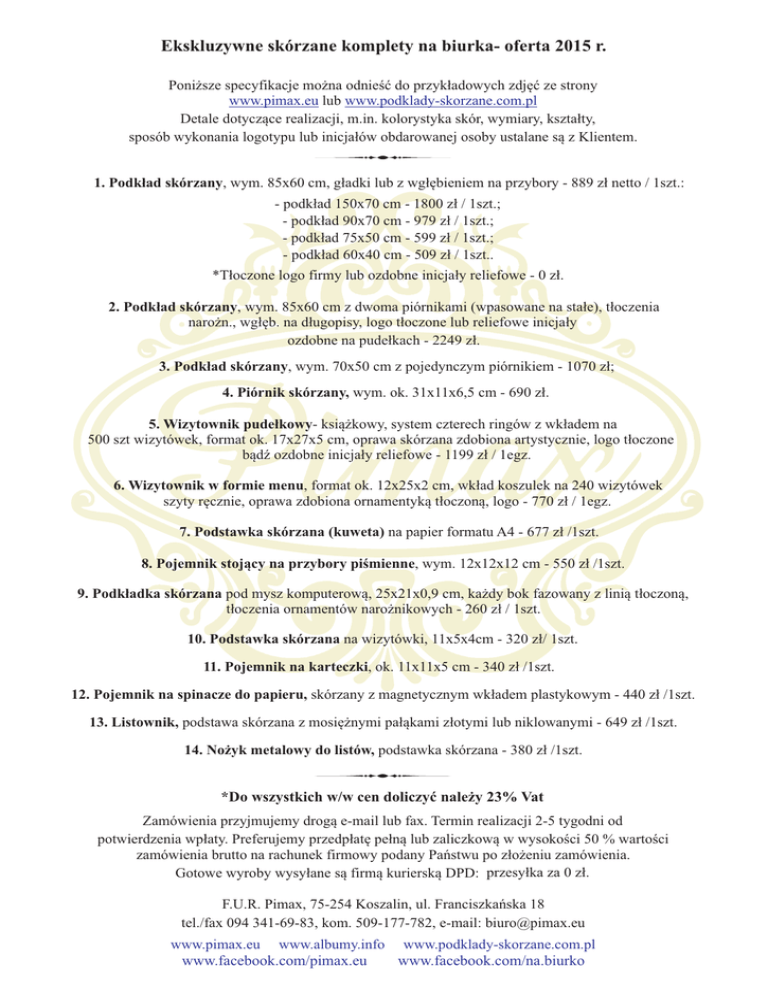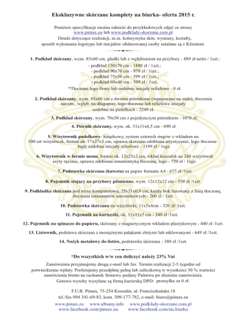 Ekskluzywne skórzane komplety na biurka- oferta 2015 r. Poni¿sze specyfikacje mo¿na odnieœæ do przyk³adowych zdjêæ ze strony www.pimax.eu lub www.podklady-skorzane.com.pl Detale dotycz¹ce realizacji, m.in. kolorystyka skór, wymiary, kszta³ty, sposób wykonania logotypu lub inicja³ów obdarowanej osoby ustalane s¹ z Klientem. 1. Podk³ad skórzany, wym. 85x60 cm, g³adki lub z wg³êbieniem na przybory - 889 z³ netto / 1szt.: - podk³ad 150x70 cm - 1800 z³ / 1szt.; - podk³ad 90x70 cm - 979 z³ / 1szt.; - podk³ad 75x50 cm - 599 z³ / 1szt.; - podk³ad 60x40 cm - 509 z³ / 1szt.. *T³oczone logo firmy lub ozdobne inicja³y reliefowe - 0 z³. 2. Podk³ad skórzany, wym. 85x60 cm z dwoma piórnikami (wpasowane na sta³e), t³oczenia naro¿n., wg³êb. na d³ugopisy, logo t³oczone lub reliefowe inicja³y ozdobne na pude³kach - 2249 z³. 3. Podk³ad skórzany, wym. 70x50 cm z pojedynczym piórnikiem - 1070 z³; 4. Piórnik skórzany, wym. ok. 31x11x6,5 cm - 690 z³. 5. Wizytownik pude³kowy- ksi¹¿kowy, system czterech ringów z wk³adem na 500 szt wizytówek, format ok. 17x27x5 cm, oprawa skórzana zdobiona artystycznie, logo t³oczone b¹dŸ ozdobne inicja³y reliefowe - 1199 z³ / 1egz. 6. Wizytownik w formie menu, format ok. 12x25x2 cm, wk³ad koszulek na 240 wizytówek szyty rêcznie, oprawa zdobiona ornamentyk¹ t³oczon¹, logo - 770 z³ / 1egz. 7. Podstawka skórzana (kuweta) na papier formatu A4 - 677 z³ /1szt. 8. Pojemnik stoj¹cy na przybory piœmienne, wym. 12x12x12 cm - 550 z³ /1szt. 9. Podk³adka skórzana pod mysz komputerow¹, 25x21x0,9 cm, ka¿dy bok fazowany z lini¹ t³oczon¹, t³oczenia ornamentów naro¿nikowych - 260 z³ / 1szt. 10. Podstawka skórzana na wizytówki, 11x5x4cm - 320 z³/ 1szt. 11. Pojemnik na karteczki, ok. 11x11x5 cm - 340 z³ /1szt. 12. Pojemnik na spinacze do papieru, skórzany z magnetycznym wk³adem plastykowym - 440 z³ /1szt. 13. Listownik, podstawa skórzana z mosiê¿nymi pa³¹kami z³otymi lub niklowanymi - 649 z³ /1szt. 14. No¿yk metalowy do listów, podstawka skórzana - 380 z³ /1szt. *Do wszystkich w/w cen doliczyæ nale¿y 23% Vat Zamówienia przyjmujemy drog¹ e-mail lub fax. Termin realizacji 2-5 tygodni od potwierdzenia wp³aty. Preferujemy przedp³atê pe³n¹ lub zaliczkow¹ w wysokoœci 50 % wartoœci zamówienia brutto na rachunek firmowy podany Pañstwu po z³o¿eniu zamówienia. Gotowe wyroby wysy³ane s¹ firm¹ kuriersk¹ DPD: przesy³ka za 0 z³. F.U.R. Pimax, 75-254 Koszalin, ul. Franciszkañska 18 tel./fax 094 341-69-83, kom. 509-177-782, e-mail: [email protected] www.pimax.eu www.albumy.info www.podklady-skorzane.com.pl www.facebook.com/pimax.eu www.facebook.com/na.biurko