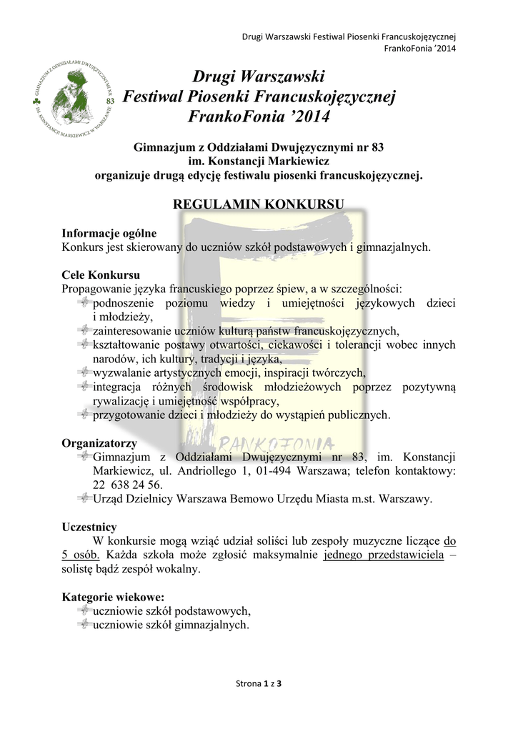 Drugi Warszawski Festiwal Piosenki Francuskojęzycznej FrankoFonia ’2014 Drugi Warszawski Festiwal Piosenki Francuskojęzycznej FrankoFonia ’2014 Gimnazjum z Oddziałami Dwujęzycznymi nr 83 im. Konstancji Markiewicz organizuje drugą edycję festiwalu piosenki francuskojęzycznej. REGULAMIN KONKURSU Informacje ogólne Konkurs jest skierowany do uczniów szkół podstawowych i gimnazjalnych. Cele Konkursu Propagowanie języka francuskiego poprzez śpiew, a w szczególności: podnoszenie poziomu wiedzy i umiejętności językowych dzieci i młodzieży, zainteresowanie uczniów kulturą państw francuskojęzycznych, kształtowanie postawy otwartości, ciekawości i tolerancji wobec innych narodów, ich kultury, tradycji i języka, wyzwalanie artystycznych emocji, inspiracji twórczych, integracja różnych środowisk młodzieżowych poprzez pozytywną rywalizację i umiejętność współpracy, przygotowanie dzieci i młodzieży do wystąpień publicznych. Organizatorzy Gimnazjum z Oddziałami Dwujęzycznymi nr 83, im. Konstancji Markiewicz, ul. Andriollego 1, 01-494 Warszawa; telefon kontaktowy: 22 638 24 56. Urząd Dzielnicy Warszawa Bemowo Urzędu Miasta m.st. Warszawy. Uczestnicy W konkursie mogą wziąć udział soliści lub zespoły muzyczne liczące do 5 osób. Każda szkoła może zgłosić maksymalnie jednego przedstawiciela – solistę bądź zespół wokalny. Kategorie wiekowe: uczniowie szkół podstawowych, uczniowie szkół gimnazjalnych. Strona 1 z 3 Drugi Warszawski Festiwal Piosenki Francuskojęzycznej FrankoFonia ’2014 Eliminacje Każdy wykonawca biorący udział w konkursie prezentuje tylko jeden utwór w języku francuskim. Uczniowie szkół podstawowych przygotowują utwór w języku francuskim bądź w dowolnym tłumaczeniu na język polski. Tematyka, gatunek i rodzaj piosenek dowolny – mile widziane utwory napisane samodzielnie. Prezentacja nie może przekraczać 5 minut. Uczestnicy zobowiązani są do zgłaszania się do konkursu z własnym podkładem muzycznym – wersją instrumentalną (plik audio). Podkłady muzyczne należy nagrać na płytę CD, PEN-DRIVE (lub przesłać drogą elektroniczną na adres e-mailowy: [email protected]), podpisać imieniem, nazwiskiem oraz nazwą szkoły i przesłać / dostarczyć organizatorowi w obowiązującym terminie zgłoszeń. Organizatorzy zapewniają sprzęt nagłaśniający. Szczegółowy harmonogram przesłuchań konkursowych będzie zamieszczony do dnia 7 kwietnia 2014r. na stronie internetowej organizatora: www.markiewicz.edu.pl Zgłoszenia Warunkiem uczestnictwa w konkursie jest czytelne wypełnienie karty zgłoszenia i przesłanie jej / dostarczenie wraz z nośnikiem podkładu instrumentalnego (plik audio) oraz zgodą na przetwarzanie i przechowywanie danych osobowych na adres organizatora: Gimnazjum z Oddziałami Dwujęzycznymi nr 83, im. Konstancji Markiewicz, ul. Andriollego 1, 01-494 Warszawa, z dopiskiem „Drugi Warszawski Festiwal Piosenki Francuskojęzycznej – FrankoFonia ’2014”. Zgłoszenia należy składać do 21 marca 2014 roku (decyduje data wpłynięcia zgłoszenia do organizatora). Kolejność występowania uczestników zostanie ustalona przez organizatorów odpowiednio do kategorii wiekowej. Organizator ma prawo do korekty kolejności występowania w trakcie trwania konkursu. Informacje o planowanym harmonogramie występów zostaną zamieszczone na stronie internetowej organizatora oraz przekazane drogą mailową, na adres wskazany w karcie zgłoszenia. Najpóźniej 60 minut przed rozpoczęcia występu, należy zgłosić się do osoby Recepcji festiwalu. Koszty przejazdu, pobytu i ubezpieczenia pokrywają uczestnicy. Uczestnictwo w konkursie jest bezpłatne. Organizatorzy informują, że po terminie zgłoszeń nie można zmienić repertuaru – wykonywanego podczas przesłuchania utworu. Strona 2 z 3 Drugi Warszawski Festiwal Piosenki Francuskojęzycznej FrankoFonia ’2014 Konkurs i Komisja Konkursowa. Jury zostanie wyłonione przez Organizatorów Konkursu. W skład Jury wejdą osoby kompetentne w dziedzinie języka francuskiego oraz muzyki. Oceniane będą: walory głosowe i muzykalność, poprawność językowa i dykcja, interpretacja utworu, ogólny wyraz artystyczny. Jury będzie dokonywało oceny zgodnie z powyższymi kryteriami. Końcowa ocena występu jest sumą ocen jurorów. Obrady jury są tajne, a jego decyzje ostateczne i nieodwołalne. Decyzją Jury Konkursu najlepszy uczestnik uhonorowany zostanie nagrodą Grand Prix. W pozostałych przypadkach przewidziane są wyróżnienia a także nagrody rzeczowe. Wszyscy uczestnicy konkursu otrzymają dyplomy uczestnictwa i drobne upominki. Terminy Przesłuchania konkursowe „Drugiego Warszawskiego Festiwalu Piosenki Francuskojęzycznej – FrankoFonia ’2014” odbędą się w piątek – 11 kwietnia 2014 roku, a uroczysty koncert wraz z wręczeniem nagród, wyróżnień i dyplomów odbędzie się 10 maja 2014 roku (sobota) w godzinach popołudniowych w Amfiteatrze, w Parku Górczewska (wjazd od ul. Ranigisa). Wyniki przesłuchań konkursowych będą podane do wiadomości dopiero podczas Koncertu Galowego. Wobec powyższego, wszyscy wykonawcy powinni być przygotowani do wykonania konkursowej piosenki. Strona 3 z 3