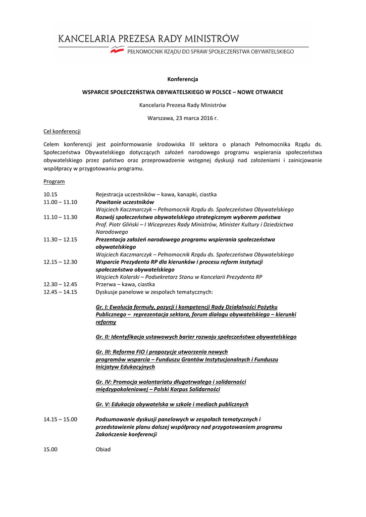 Konferencja WSPARCIE SPOŁECZEŃSTWA OBYWATELSKIEGO W POLSCE – NOWE OTWARCIE Kancelaria Prezesa Rady Ministrów Warszawa, 23 marca 2016 r. Cel konferencji Celem konferencji jest poinformowanie środowiska III sektora o planach Pełnomocnika Rządu ds. Społeczeństwa Obywatelskiego dotyczących założeń narodowego programu wspierania społeczeństwa obywatelskiego przez państwo oraz przeprowadzenie wstępnej dyskusji nad założeniami i zainicjowanie współpracy w przygotowaniu programu. Program 10.15 11.00 – 11.10 11.10 – 11.30 11.30 – 12.15 12.15 – 12.30 12.30 – 12.45 12.45 – 14.15 Rejestracja uczestników – kawa, kanapki, ciastka Powitanie uczestników Wojciech Kaczmarczyk – Pełnomocnik Rządu ds. Społeczeństwa Obywatelskiego Rozwój społeczeństwa obywatelskiego strategicznym wyborem państwa Prof. Piotr Gliński – I Wiceprezes Rady Ministrów, Minister Kultury i Dziedzictwa Narodowego Prezentacja założeń narodowego programu wspierania społeczeństwa obywatelskiego Wojciech Kaczmarczyk – Pełnomocnik Rządu ds. Społeczeństwa Obywatelskiego Wsparcie Prezydenta RP dla kierunków i procesu reform instytucji społeczeństwa obywatelskiego Wojciech Kolarski – Podsekretarz Stanu w Kancelarii Prezydenta RP Przerwa – kawa, ciastka Dyskusje panelowe w zespołach tematycznych: Gr. I: Ewolucja formuły, pozycji i kompetencji Rady Działalności Pożytku Publicznego – reprezentacja sektora, forum dialogu obywatelskiego – kierunki reformy Gr. II: Identyfikacja ustawowych barier rozwoju społeczeństwa obywatelskiego Gr. III: Reforma FIO i propozycje utworzenia nowych programów wsparcia – Funduszu Grantów Instytucjonalnych i Funduszu Inicjatyw Edukacyjnych Gr. IV: Promocja wolontariatu długotrwałego i solidarności międzypokoleniowej – Polski Korpus Solidarności Gr. V: Edukacja obywatelska w szkole i mediach publicznych 14.15 – 15.00 Podsumowanie dyskusji panelowych w zespołach tematycznych i przedstawienie planu dalszej współpracy nad przygotowaniem programu Zakończenie konferencji 15.00 Obiad