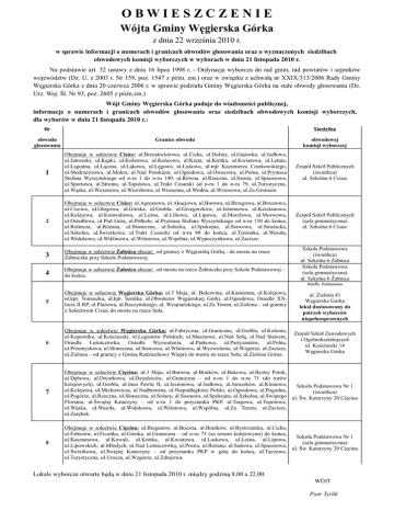 OBWIESZCZENIE Wójta Gminy Węgierska Górka z dnia 22 września 2010 r. w sprawie informacji o numerach i granicach obwodów głosowania oraz o wyznaczonych siedzibach obwodowych komisji wyborczych w wyborach w dniu 21 listopada 2010 r. Na podstawie art. 32 ustawy z dnia 16 lipca 1998 r. - Ordynacja wyborcza do rad gmin, rad powiatów i sejmików województw (Dz. U. z 2003 r. Nr 159, poz. 1547 z późn. zm.) oraz w związku z uchwałą nr XXIX/313/2006 Rady Gminy Węgierska Górka z dnia 20 czerwca 2006 r. w sprawie podziału Gminy Węgierska Górka na stałe obwody głosowania (Dz. Urz. Woj. Śl. Nr 93, poz. 2605 z późn.zm.) Wójt Gminy Węgierska Górka podaje do wiadomości publicznej, informacje o numerach i granicach obwodów głosowania oraz siedzibach obwodowych komisji wyborczych, dla wyborów w dniu 21 listopada 2010 r.: Nr obwodu głosowania Siedziba Granice obwodu obwodowej komisji wyborczej 1 Obejmuje w sołectwie Cisiec: ul.Brzoskwiniowa, ul.Cicha, ul.Doliny, ul.Gajówka, ul.Jodłowa, ul.Jutrzenki, ul.Kępki, ul.Kolorowa, ul.Końcowa, ul.Kręta, ul.Krótka, ul.Kwiatowa, ul.Letnia, ul.Łagodna, ul.Łączna, ul.Łąkowa, ul.Łęgowa, ul.Łukowa, ul.mjr Kazimierza Czarkowskiego, ul.Modrzewiowa, ul.Mokra, ul.Nad Potokiem, ul.Ogrodowa, ul.Owocowa, ul.Polna, ul.Prymasa Stefana Wyszyńskiego od n-ru 1 do n-ru 149, ul.Równa, ul.Rzeczna, ul.Sarnia, ul.Spacerowa, ul.Sportowa, ul.Stroma, ul.Topolowa, ul.Trakt Cesarski od n-ru 1 do n-ru 79, ul.Turystyczna, ul.Wąska, ul.Wczasowa, ul.Wierzbowa, ul.Wiosenna, ul.Wodna, ul.Wrzosowa, ul.Za Groniem. Zespół Szkół Publicznych (świetlica) ul. Szkolna 6 Cisiec 2 Obejmuje w sołectwie Cisiec: ul.Agrestowa, ul.Akacjowa, ul.Borowa, ul.Brzegowa, ul.Brzozowa, ul.Cisowa, ul.Głogowa, ul.Górska, ul.Grobla, ul.Grzegorzków, ul.Jaśminowa, ul.Kasztanowa, ul.Kolejowa, ul.Konwaliowa, ul.Leśna, ul.Liliowa, ul.Lipowa, ul.Morelowa, ul.Morwowa, ul.Osiedlowa, ul.Pod Górę, ul.Półkole, ul.Prymasa Stefana Wyszyńskiego od n-ru 150 do końca, ul.Rolnicza, ul.Różana, ul.Słoneczna, ul.Sołecka, ul.Spokojna, ul.Stawowa, ul.Strażacka, ul.Szkolna, ul.Świerkowa, ul.Trakt Cesarski od n-ru 80 do końca, ul.Tynionka, ul.Wesoła, ul.Widokowa, ul.Wiklinowa, ul.Wiśniowa, ul.Wspólna, ul.Wypoczynkowa, ul.Zacisze. Zespół Szkół Publicznych (sala gimnastyczna) ul. Szkolna 6 Cisiec 3 Obejmuje w sołectwie Żabnica obszar: od granicy z Węgierską Górką - do mostu na rzece Żabniczka przy Szkole Podstawowej. 4 Obejmuje w sołectwie Żabnica obszar: od mostu na rzece Żabniczka przy Szkole Podstawowej do końca. 5 Obejmuje w sołectwie Węgierska Górka: ul.3 Maja, ul. Bukowina, ul.Kamienna, ul.Kolejowa, ul.kpr. Tomaszka, ul.kpt. Semika, ul.Obrońców Węgierskiej Górki, ul.Ogrodowa, Osiedle XXlecia II RP, ul.Plażowa, ul.Raczyńskiego, ul. Wyspiańskiego, ul.Za Torem, ul.Zielona – od granicy z Sołectwem Cisiec do mostu na rzece Soła. 6 Obejmuje w sołectwie Węgierska Górka: ul.Fabryczna, ul.Graniczna, ul.Grobla, ul.Kolonia, ul.Kopernika, ul.Kościuszki, ul.Legionów Polskich, ul.Masztowa, ul.Nad Sołą, ul.Nad Stawem, Osiedle Leśniczówka, Osiedle Wyzwolenia, ul.Parkowa, ul.Partyzantów, ul.Polna, ul.Przemysłowa, ul.Słoneczna, ul.Stawowa, ul.Wiśniowa, ul.Wyzwolenia, ul.Wzgórze, ul.Zacisze, ul.Zielona – od granicy z Gminą Radziechowy Wieprz do mostu na rzece Soła, ul.Zielona Górna. 7 Obejmuje w sołectwie Cięcina: ul.3 Maja, ul.Barwna, ul.Bratków, ul.Bukowa, ul.Bystry Potok, ul.Dębowa, ul.Dworkowa, ul.Dziedziców, ul.Graniczna – od n-ru 1 do n-ru 71 (do torów kolejowych), ul.Grobla, ul.Jana Pawła II, ul.Jesionowa, ul.Jodłowa, ul.Juraszków, ul.Klonowa, Szkoła Podstawowa Nr 1 ul.Kolejowa, ul.Mickiewicza, ul.Nadbrzeżna, ul.Niepodległości Polski, ul.Ogrodowa, ul.Pogodna, (świetlica) ul.Pogórze, ul.Rzeczna, ul.Słoneczna, ul.Solany, ul.Sosnowa, ul.Spokojna, ul.Szkolna, ul.Świętego ul. Św. Katarzyny 20 Cięcina Floriana, ul.Świętej Katarzyny – od n-ru 1 do przystanku PKP, ul.Targowa, ul.Topolowa, ul.Wąska, ul.Wesoła, ul.Widokowa, ul.Wiśniowa, ul.Wspólna, ul.Za Torem, ul.Zacisze, ul.Zarębek. 8 Obejmuje w sołectwie Cięcina: ul.Biegunów, ul.Boczna, ul.Brańków, ul.Bystrzańska, ul.Cicha, ul.Fabisiów, ul.Ficońka, ul.Górska, ul.Graniczna – od n-ru 73 (za torami kolejowymi) do końca, Szkoła Podstawowa Nr 1 ul.Kasztanowa, ul.Kowali, ul.Krótka, ul.Kwiatowa, ul.Laskowa, ul.Leśna, ul.Lipowa, (sala gimnastyczna) ul.Lipowskich, ul.Młodych, ul.Nad Leśniczówką, ul.Prosta, ul.Różana, ul.Sadowa, ul.Spacerowa, ul. Św. Katarzyny 20 Cięcina ul.Świerkowa, ul.Świętej Katarzyny – od przystanku PKP w górę do końca, ul.Tęczowa, ul.Turystyczna, ul.Urocza, ul.Wzgórze, ul.Zdrojowa. Szkoła Podstawowa (świetlica) ul. Szkolna 6 Żabnica Szkoła Podstawowa (sala gimnastyczna) ul. Szkolna 6 Żabnica Szkoła Podstawowa ul. Zielona 41 Węgierska Górka lokal dostosowany do potrzeb wyborców niepełnosprawnych Zespół Szkół Zawodowych i Ogólnokształcących ul. Kościuszki 14 Węgierska Górka Lokale wyborcze otwarte będą w dniu 21 listopada 2010 r. między godziną 8.00 a 22.00. WÓJT Piotr Tyrlik
