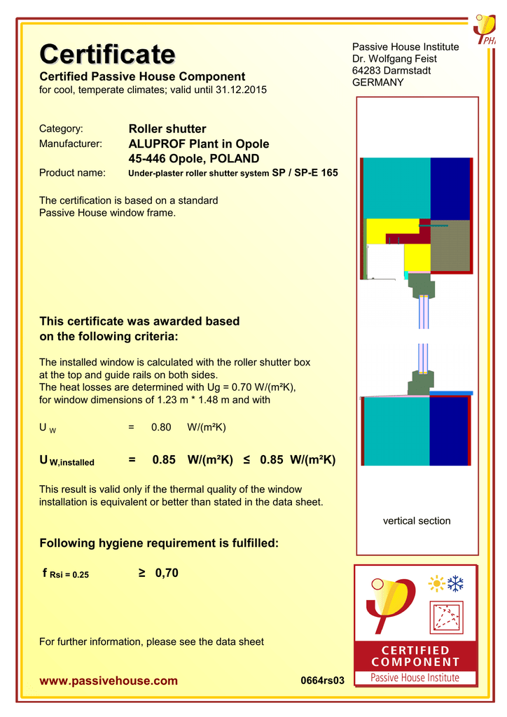Passive House Institute Dr. Wolfgang Feist 64283 Darmstadt GERMANY Certified Passive House Component for cool, temperate climates; valid until 31.12.2015 Category: Manufacturer: Roller shutter ALUPROF Plant in Opole 45-446 Opole, POLAND Product name: Under-plaster roller shutter system SP / SP-E 165 The certification is based on a standard Passive House window frame. This certificate was awarded based on the following criteria: The installed window is calculated with the roller shutter box at the top and guide rails on both sides. The heat losses are determined with Ug = 0.70 W/(m²K), for window dimensions of 1.23 m * 1.48 m and with UW = 0.80 W/(m²K) U W,installed = 0.85 W/(m²K) ≤ 0.85 W/(m²K) This result is valid only if the thermal quality of the window installation is equivalent or better than stated in the data sheet. vertical section Following hygiene requirement is fulfilled: f Rsi = 0.25 ≥ 0,70 For further information, please see the data sheet www.passivehouse.com 0664rs03 Data Sheet ALUPROF Plant in Opole, Under-plaster roller shutter system SP / SP-E 165 Manufacturer ALUPROF Plant in Opole ul. Gosławicka 3, 45-446 Opole, POLAND Tel.: +48 77 400 00 00 Email: [email protected], www.aluprof.eu/en Window standard frame V5 Section Isothermal Description Aluminium roller shutter with PUR insulation (λ = 0,024 W/(m²K) ), fixed with an angle of PUR rigid foam; the guide rails are fixed at the frame with a thermal separation Thermal data for the window frame spacer bottom side/top Uf-value Width Ψg fRsi=0.25 [W/(m²K)] [mm] [W/(mK)] [-] 120 120 Superspacer TriSeal* 0.027 0.72 0.027 0.80 0.80 * Spacers of lower thermal quality lead to higher thermal losses and lower glass edge temperatures. www.passivehouse.com Passive House Institute Page 1/3 Data Sheet ALUPROF Plant in Opole, Under-plaster roller shutter system SP / SP-E 165 certified Installation EIFS (300mm WLG 035) with standard window V5 Rawlbolts with PVC plug Shutter box aluminium(ALU) Screws Angle 200x120x50 PUR 0,086 (W/m·K) Plaster foundation Heraklith BM Polyisocyanurate (PUR/PIR) 0,024 (W/m·K) Polyurethane tape Polyethylene (PE) Silicone Aluminium flap (ALU) Aluminium guide channel (ALU) Extruded polystyrene(XPS) ? = 0,034-0,036(W/m·K) PVC sheet Aluminium bar for plaster (ALU) Silicone Polyethylene (PE) Position bottom top side UW,instal. EIFS Installation based thermal bridge Ψinstal. in Passive House suitable wall [W/(mK)] [W/(mK)] [W/(mK)] [W/(m²K)] 0.021 0.025 0.010 0.85 Explanatory notes The window U-values were calculated based on a 1.23 m by 1.48 m window Ug = 0.70 W/(m²K). If better glazing is used, the window U-values decreases. The influence of a ceiling connection instead of a concrete lintel above the window is negligible as long as the EIFS is not weakened. Dimensions refer to the outer edge of the window frame. www.passivehouse.com Passive House Institute Page 2/3 Date Sheet ALUPROF Plant in Opole, Under-plaster roller shutter system SP / SP-E 165 additional installation situations EIFS (280mm WLG 035) with standard window V5 Rawlbolts with PVC plug Shutter box aluminium(ALU) Screws Angle 200x120x50 PUR 0,086 (W/m·K) Plaster foundation Heraklith BM Polyisocyanurate (PUR/PIR)0,024 (W/m·K) Polyurethane tape Polyethylene (PE) Silicone Aluminium flap (ALU) Aluminium guide channel (ALU) Ψinstal. bottom = 0.027 W/(mK) Ψinstal. top Ψinstal. side = 0.035 W/(mK) = 0.015 W/(mK) UW, instal. = 0.87 W/(m²K) * Extruded polystyrene(XPS) ? = 0,034-0,036(W/m·K) PVC sheet Aluminium bar for plaster (ALU) Silicone Polyethylene (PE) * not certified. This installation detail does not fulfill the criteria. The heat losses are higher, if the window frame is situated towards the masonry rather than in the insulation layer. These losses have to be compensated for elsewhere. EIFS (250 mm WLG 035) with standard window V5 Rawlbolts with PVC plug Shutter box aluminium(ALU) Screws Angle 200x120x50 PUR 0,086 (W/m·K) Plaster foundation Heraklith BM Polyisocyanurate (PUR/PIR) 0,024 (W/m·K) Polyurethane tape Polyethylene (PE) Silicone Aluminium flap (ALU) Aluminium guide channel (ALU) Extruded polystyrene(XPS) ? = 0,034-0,036(W/m·K) PVC sheet Aluminium bar for plaster (ALU) Silicone Polyethylene (PE) Ψinstal. bottom = 0.043 W/(mK) Ψinstal. top Ψinstal. side = 0.062 W/(mK) UW, instal. = 0.91 W/(m²K) * = 0.027 W/(mK) * not certified. This installation detail does not fulfill the criteria. The heat losses are higher, if the window frame is situated towards the masonry rather than in the insulation layer. These losses have to be compensated for elsewhere. www.passivehouse.com Passive House Institute Page 3/3