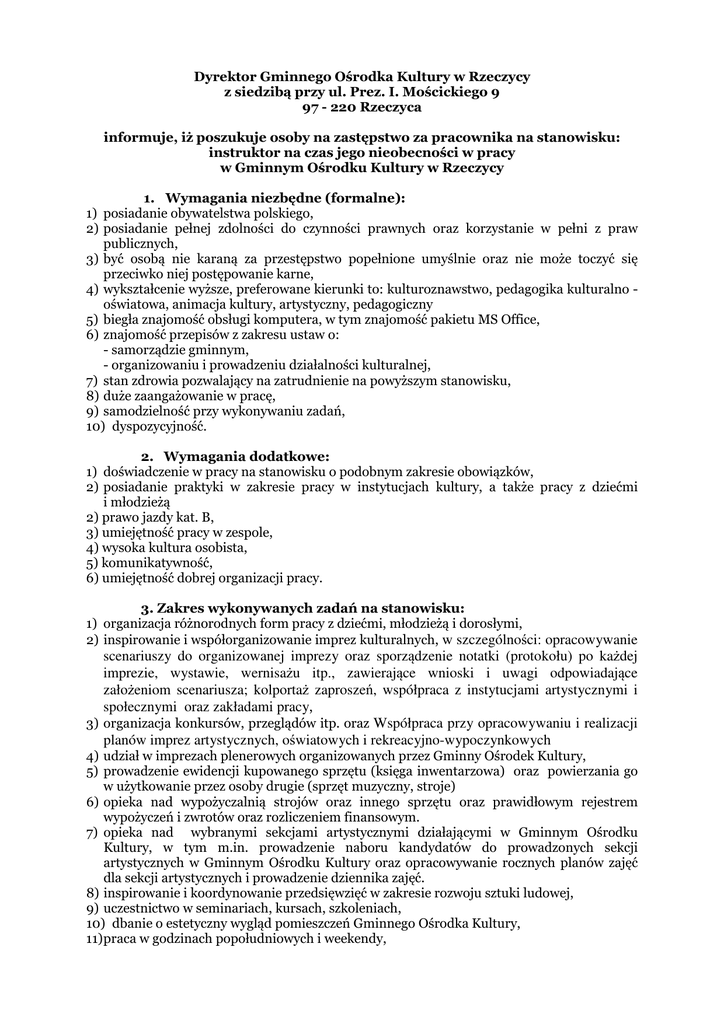 Dyrektor Gminnego Ośrodka Kultury w Rzeczycy z siedzibą przy ul. Prez. I. Mościckiego 9 97 - 220 Rzeczyca informuje, iż poszukuje osoby na zastępstwo za pracownika na stanowisku: instruktor na czas jego nieobecności w pracy w Gminnym Ośrodku Kultury w Rzeczycy 1. Wymagania niezbędne (formalne): 1) posiadanie obywatelstwa polskiego, 2) posiadanie pełnej zdolności do czynności prawnych oraz korzystanie w pełni z praw publicznych, 3) być osobą nie karaną za przestępstwo popełnione umyślnie oraz nie może toczyć się przeciwko niej postępowanie karne, 4) wykształcenie wyższe, preferowane kierunki to: kulturoznawstwo, pedagogika kulturalno oświatowa, animacja kultury, artystyczny, pedagogiczny 5) biegła znajomość obsługi komputera, w tym znajomość pakietu MS Office, 6) znajomość przepisów z zakresu ustaw o: - samorządzie gminnym, - organizowaniu i prowadzeniu działalności kulturalnej, 7) stan zdrowia pozwalający na zatrudnienie na powyższym stanowisku, 8) duże zaangażowanie w pracę, 9) samodzielność przy wykonywaniu zadań, 10) dyspozycyjność. 2. Wymagania dodatkowe: 1) doświadczenie w pracy na stanowisku o podobnym zakresie obowiązków, 2) posiadanie praktyki w zakresie pracy w instytucjach kultury, a także pracy z dziećmi i młodzieżą 2) prawo jazdy kat. B, 3) umiejętność pracy w zespole, 4) wysoka kultura osobista, 5) komunikatywność, 6) umiejętność dobrej organizacji pracy. 3. Zakres wykonywanych zadań na stanowisku: 1) organizacja różnorodnych form pracy z dziećmi, młodzieżą i dorosłymi, 2) inspirowanie i współorganizowanie imprez kulturalnych, w szczególności: opracowywanie scenariuszy do organizowanej imprezy oraz sporządzenie notatki (protokołu) po każdej imprezie, wystawie, wernisażu itp., zawierające wnioski i uwagi odpowiadające założeniom scenariusza; kolportaż zaproszeń, współpraca z instytucjami artystycznymi i społecznymi oraz zakładami pracy, 3) organizacja konkursów, przeglądów itp. oraz Współpraca przy opracowywaniu i realizacji planów imprez artystycznych, oświatowych i rekreacyjno-wypoczynkowych 4) udział w imprezach plenerowych organizowanych przez Gminny Ośrodek Kultury, 5) prowadzenie ewidencji kupowanego sprzętu (księga inwentarzowa) oraz powierzania go w użytkowanie przez osoby drugie (sprzęt muzyczny, stroje) 6) opieka nad wypożyczalnią strojów oraz innego sprzętu oraz prawidłowym rejestrem wypożyczeń i zwrotów oraz rozliczeniem finansowym. 7) opieka nad wybranymi sekcjami artystycznymi działającymi w Gminnym Ośrodku Kultury, w tym m.in. prowadzenie naboru kandydatów do prowadzonych sekcji artystycznych w Gminnym Ośrodku Kultury oraz opracowywanie rocznych planów zajęć dla sekcji artystycznych i prowadzenie dziennika zajęć. 8) inspirowanie i koordynowanie przedsięwzięć w zakresie rozwoju sztuki ludowej, 9) uczestnictwo w seminariach, kursach, szkoleniach, 10) dbanie o estetyczny wygląd pomieszczeń Gminnego Ośrodka Kultury, 11) praca w godzinach popołudniowych i weekendy, 12) współpraca z placówkami kultury z terenu innych gmin, 13) wykonywanie innych prac zleconych przez przełożonego. 4. Wymagane dokumenty: życiorys zawodowy ( CV), list motywacyjny, dokumenty poświadczające wykształcenie oraz kwalifikacje zawodowe (kserokopie), dokumenty potwierdzające straż pracy (kserokopie świadectw pracy lub zaświadczeń o zatrudnieniu), 14) kwestionariusz osobowy dla osoby ubiegającej się o zatrudnienie, 15) inne dodatkowe dokumenty o posiadanych kwalifikacjach i umiejętnościach, 16) oświadczenie o stanie zdrowia, 17) oświadczenie o posiadaniu obywatelstwa polskiego, o pełnej zdolności prawnej do czynności prawnych, o korzystaniu z pełni praw publicznych, 18) oświadczenie kandydata, że nie był skazany prawomocnym wyrokiem sądu za umyślne przestępstwo ścigane z oskarżenia publicznego lub umyślne przestępstwo skarbowe, opatrzone danymi kandydata oraz datą i podpisem, 1) 2) 3) 4) Wymagane dokumenty aplikacyjne należy składać osobiście w siedzibie Gminnego Ośrodka Kultury w Rzeczycy lub przesyłać pocztą na adres: Gminny Ośrodek Kultury w Rzeczycy ul. Prez. I. Mościckiego 9 97-220 Rzeczyca w kopercie lub teczce z dopiskiem: „Dotyczy zatrudnienia na zastępstwo za pracownika na stanowisku: instruktor na czas jego nieobecności w pracy w Gminnym Ośrodku Kultury w Rzeczycy” w terminie do dnia 29 lutego 2012 r. (liczy się data wpływu do Gminnego Ośrodka Kultury w Rzeczycy). Aplikacje, które wpłyną do Gminnego Ośrodka Kultury w Rzeczycy po wyżej określonym terminie nie będą rozpatrywane. Informacja o wynikach naboru będzie umieszczona na stronie internetowej Biuletynu Informacji Publicznej Urzędu Gminy w Rzeczycy (http://bip.rzeczyca.pl) oraz na tablicy ogłoszeń Gminnego Ośrodka Kultury w Rzeczycy. Wymagane dokumenty aplikacyjne: list motywacyjny, życiorys zawodowy (CV) powinny być opatrzone klauzulą: ”Wyrażam zgodę na przetwarzanie moich danych osobowych zawartych w ofercie pracy dla potrzeb niezbędnych do realizacji procesu rekrutacji zgodnie z ustawa z dnia 29 sierpnia 1997 r. o ochronie danych osobowych (Dz.U. z 2002 r. Nr 101, poz. 926 z późn. zm.) oraz ustawą z dnia 21 listopada 2008 r. o pracownikach samorządowych (Dz.U. z 2008 r. Nr 223, poz. 1458 z późn. zm.)”. Kandydaci zakwalifikowani do II etapu naboru zostaną telefonicznie zaproszeni na rozmowy kwalifikacyjne. Dyrektor Gminnego Ośrodka Kultury w Rzeczycy Antoni Socha Rzeczyca, dnia 22 lutego 2012 r.