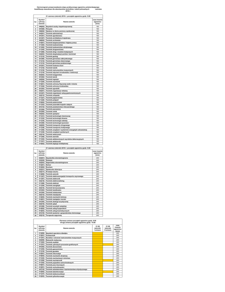Harmonogram przeprowadzania etapu praktycznego egzaminu potwierdzającego kwalifikacje zawodowe dla absolwentów techników i szkół policealnych czerwiec 2016 r. 21 czerwca (wtorek) 2016 r. początek egzaminu godz. 9.00 Lp. Symbol cyfrowy zawodu Nazwa zawodu czas trwania egzaminu [min] 1 346[02] Asystent osoby niepełnosprawnej 180 2 347[09] Florysta 180 3 346[04] Opiekun w domu pomocy społecznej 180 4 343[01] Technik administracji 180 5 341[01] Technik agrobiznesu 180 6 321[07] Technik architektury krajobrazu 180 7 348[02] Technik archiwista 180 8 315[01] Technik bezpieczeństwa i higieny pracy 180 9 311[04] Technik budownictwa 180 10 311[05] Technik budownictwa okrętowego 180 11 311[45] Technik drogownictwa 180 12 311[06] Technik dróg i mostów kolejowych 180 13 342[03] Technik eksploatacji portów i terminali 180 14 311[12] Technik geolog 180 15 321[06] Technik górnictwa odkrywkowego 180 16 311[14] Technik górnictwa otworowego 180 17 311[15] Technik górnictwa podziemnego 180 18 321[01] Technik hodowca koni 180 19 311[16] Technik hutnik 180 20 311[18] Technik instrumentów muzycznych 180 21 311[19] Technik inŜynierii środowiska i melioracji 180 22 522[02] Technik księgarstwa 180 23 321[02] Technik leśnik 180 24 342[04] Technik logistyk 180 25 311[20] Technik mechanik 180 26 515[01] Technik ochrony fizycznej osób i mienia 180 27 311[24] Technik ochrony środowiska 180 28 321[03] Technik ogrodnik 180 29 342[01] Technik organizacji reklamy 180 30 341[07] Technik organizacji usług gastronomicznych 180 31 322[13] Technik ortopeda 180 32 311[27] Technik papiernictwa 180 33 311[28] Technik poligraf 180 34 315[02] Technik poŜarnictwa 180 35 311[53] Technik przeróbki kopalin stałych 180 36 321[12] Technik przetwórstwa mleczarskiego 180 37 180 38 321[04] Technik pszczelarz 321[05] Technik rolnik 39 342[02] Technik spedytor 180 40 311[31] Technik technologii chemicznej 180 41 311[32] Technik technologii drewna 180 42 311[34] Technik technologii odzieŜy 180 180 43 321[09] Technik technologii Ŝywności 180 44 342[05] Technik transportu drogowego 180 45 311[38] Technik transportu kolejowego 180 46 311[56] Technik urządzeń i systemów energetyki odnawialnej 180 47 311[39] Technik urządzeń sanitarnych 180 48 322[14] Technik weterynarii 180 49 311[40] Technik wiertnik 180 50 180 51 311[42] Technik włókienniczych wyrobów dekoracyjnych 311[41] Technik włókiennik 180 52 314[02] Technik Ŝeglugi śródlądowej 180 Lp. Symbol cyfrowy zawodu 21 czerwca (wtorek) 2016 r. początek egzaminu godz. 9.00 Nazwa zawodu czas trwania egzaminu [min] 1 322[01] Asystentka stomatologiczna 240 2 322[20] Dietetyk 240 3 322[03] Higienistka stomatologiczna 240 4 512[01] Kelner 240 5 512[02] Kucharz 240 6 322[21] Opiekunka dziecięca 240 7 322[17] Protetyk słuchu 240 8 314[06] Technik awionik 240 9 311[47] Technik elektroenergetyk transportu szynowego 240 10 311[07] Technik elektronik 240 11 322[19] Technik elektroradiolog 240 12 311[08] Technik elektryk 240 13 311[54] Technik energetyk 240 14 322[10] Technik farmaceutyczny 240 15 341[03] Technik handlowiec 240 16 341[04] Technik hotelarstwa 240 17 322[12] Technik masaŜysta 240 18 314[05] Technik mechanik lotniczy 240 19 314[01] Technik nawigator morski 240 20 341[05] Technik obsługi turystycznej 240 21 322[16] Technik optyk 240 22 341[08] Technik turystyki wiejskiej 240 23 514[02] Technik usług fryzjerskich 240 24 514[03] Technik usług kosmetycznych 240 25 321[10] Technik Ŝywienia i gospodarstwa domowego 240 26 322[15] Terapeuta zajęciowy 240 Pierwsza zmiana początek egzaminu godz. 9.00 Druga zmiana początek egzaminu godz. 15.00 Lp. Symbol cyfrowy zawodu Nazwa zawodu 21.06 (wtorek) I zmiana 21.06 (wtorek) II zmiana czas trwania egzaminu [min] 240 1 313[06] Asystent operatora dźwięku 2 313[01] Fototechnik 240 3 311[01] Korektor i stroiciel instrumentów muzycznych 240 4 322[06] Ratownik medyczny 240 5 311[02] Technik analityk 240 6 311[51] Technik cyfrowych procesów graficznych 240 7 341[02] Technik ekonomista 240 8 311[55] Technik gazownictwa 240 9 311[10] Technik geodeta 240 10 312[01] Technik informatyk 240 11 314[03] Technik mechanik okrętowy 240 12 311[22] Technik mechanizacji rolnictwa 240 13 311[50] Technik mechatronik 240 14 311[52] Technik pojazdów samochodowych 240 15 419[01] Technik prac biurowych 240 16 412[01] Technik rachunkowości 347[10] Technik sztukatorstwa i kamieniarstwa artystycznego 240 17 18 312[02] 240 Technik teleinformatyk 240 19 311[37] Technik telekomunikacji 240 20 312[03] Technik tyfloinformatyk 240