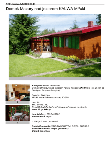 http://www.123polska.pl Domek Mazury nad jeziorem KALWA Mi³uki 1 Kategoria: domki drewniane Domek letniskowy nad jeziorem Kalwa, miejscowo¶c Mi³uki (ok. 25 km od Olsztyna, Pasym - Szczytno) Pasym - Szczytno Mi³uki, warmiñsko-mazurskie, 10-900 2 min. 0z³ Tel.: 504157330 Dzieñ Dobry! Zanlaz³em Pañstwa og³oszenie na stronie www.123polska.pl.... Inne telefony: 089 5419982 Strona www: http:// 3 • Nad jeziorem / jeziorami Rabaty/Promocje: !! DO DYSPOZYCJI GO¦CI - £ÓDKA !! Standard obiektu (ilo¶æ gwiazdek): **** Obiekt: sezonowy http://www.123polska.pl Pe³en opis obiektu 4 Domek letniskowy nad jeziorem Kalwa, miejscowo¶c Mi³uki (ok. 25 km od Olsztyna, Pasym - Szczytno). Po³o¿ony na piêknej, ogrodzonej, zielonej dzia³ce o pow. 5 arów, na polanie w strefie ciszy - rezerwat przyrody. Otaczaj±ce go lasy obfituj± w bogate runo le¶ne (niezliczone ilo¶ci grzybów i jagód), a jezioro Kalwa (562ha) zapewnia warunki do wêdkowania. Okolica jest idealna dla turystki rowerowej i pieszej. !! DO DYSPOZYCJI GO¦CI - £ÓDKA !! Domek po gruntownym remoncie, s³oneczny, wykoñczony w drewnie, 3 pokojowy (6 osobowy). Pokoje: 5 6 Du¿y pokój dzienny – 2-osobowa skórzana rogówka, kominek, stó³, skórzane fotele, drewniane meble, TV, radioI sypialnia - ³ó¿e ma³¿eñskie 2-osobowe, szafki nocne, szafaII sypialnia - dwa 1-osobowe ³ó¿ka, drewniane szafkiKuchnia – kuchenka gazowa, lodówka, wyposa¿enie (naczynia, sztuæce, garnki)£azienka – WC, prysznic, umywalka (nowe wykoñczenie)Przy domku taras z meblami ogrodowymi - idealne miejsce do spo¿ywania posi³ków na ¶wie¿ym powietrzu. *miejsce parkingowe na terenie ogrodzonej posesji. Do dyspozycji grill. Odleg³o¶æ od jeziora ok. 80 metrów W okolicy (ok. 5km) istnieje mo¿liwo¶æ skorzystania z kortów tenisowych, basenu krytego, sauny, si³owni i krêgielni oraz jazdy konnej i bryczki. Dla dzieci zje¿d¿alnia wodna, wypo¿yczalnia sprzêtu wodnego. 8 ABY SPRAWDZIÆ TERMIN PROSZÊ KLIKN¡Æ NA ZAK£ADKÊ "WOLNE TERMINY" Telefon kontaktowy 504 157 330. oraz 089 - 541 99 82 9 Oferowane pokoje: 2-osobowe: 3 pokoi(-je) Ilo¶æ domków jednorodzinnych: 1 Cena za ca³o¶æ: Cena za dobê (za ca³o¶æ): 1 z³ Cena za miesi±c (za ca³o¶æ): 1 z³ Ca³kowieta ilo¶c miejsc noclegowych: ok. 6 10 Cena za osobê (w SEZONIE): http://www.123polska.pl Cennik: inne Ceny ustalane s± indywidualnie pod numeramitelefonu: 504 157 330 oraz089 - 541 99 82 Wy¿ywienie: • Wspólna kuchnia do dyspozycji 11 Na terenie obiektu: • salka TV • sala kominkowa • grill • plac zabaw • mo¿liwo¶æ przechowania rowerów • parking 12 Pozosta³e: • akceptujemy zwierzêta • mówimy po angielsku Dojazd: Pasym - Szczytno 10-900 Mi³uki warmiñsko-mazurskie GPS: 20.7652, 53.6677 W pobli¿u: do sklepu: 3 km do wypozyczalni sprzêtu wodnego: 3 km szlaki turystyczne: 0,2 km dyskoteka / dancing / klub nocny: 3 km poczta: 3 km bank / bankomat: 3 km budka telefoniczna: 3 km Internet Cafe: 3 km dworzec PKP: 5 km
