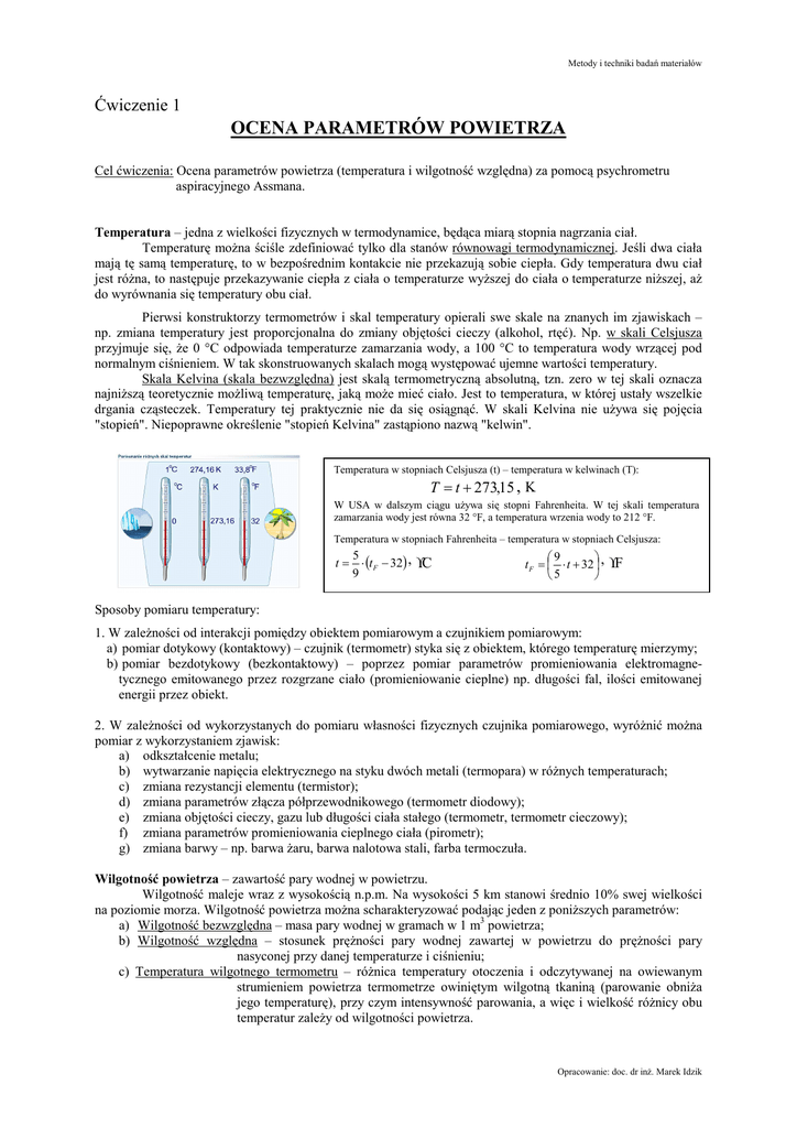 Metody i techniki badań materiałów Ćwiczenie 1 OCENA PARAMETRÓW POWIETRZA Cel ćwiczenia: Ocena parametrów powietrza (temperatura i wilgotność względna) za pomocą psychrometru aspiracyjnego Assmana. Temperatura – jedna z wielkości fizycznych w termodynamice, będąca miarą stopnia nagrzania ciał. Temperaturę można ściśle zdefiniować tylko dla stanów równowagi termodynamicznej. Jeśli dwa ciała mają tę samą temperaturę, to w bezpośrednim kontakcie nie przekazują sobie ciepła. Gdy temperatura dwu ciał jest różna, to następuje przekazywanie ciepła z ciała o temperaturze wyższej do ciała o temperaturze niższej, aż do wyrównania się temperatury obu ciał. Pierwsi konstruktorzy termometrów i skal temperatury opierali swe skale na znanych im zjawiskach – np. zmiana temperatury jest proporcjonalna do zmiany objętości cieczy (alkohol, rtęć). Np. w skali Celsjusza przyjmuje się, że 0 °C odpowiada temperaturze zamarzania wody, a 100 °C to temperatura wody wrzącej pod normalnym ciśnieniem. W tak skonstruowanych skalach mogą występować ujemne wartości temperatury. Skala Kelvina (skala bezwzględna) jest skalą termometryczną absolutną, tzn. zero w tej skali oznacza najniższą teoretycznie możliwą temperaturę, jaką może mieć ciało. Jest to temperatura, w której ustały wszelkie drgania cząsteczek. Temperatury tej praktycznie nie da się osiągnąć. W skali Kelvina nie używa się pojęcia "stopień". Niepoprawne określenie "stopień Kelvina" zastąpiono nazwą "kelwin". Temperatura w stopniach Celsjusza (t) – temperatura w kelwinach (T): T = t + 273,15 , K W USA w dalszym ciągu używa się stopni Fahrenheita. W tej skali temperatura zamarzania wody jest równa 32 °F, a temperatura wrzenia wody to 212 °F. Temperatura w stopniach Fahrenheita – temperatura w stopniach Celsjusza: 5 t = ⋅ (t F − 32) , °C 9 9 t F = ⋅ t + 32 , 5 °F Sposoby pomiaru temperatury: 1. W zależności od interakcji pomiędzy obiektem pomiarowym a czujnikiem pomiarowym: a) pomiar dotykowy (kontaktowy) – czujnik (termometr) styka się z obiektem, którego temperaturę mierzymy; b) pomiar bezdotykowy (bezkontaktowy) – poprzez pomiar parametrów promieniowania elektromagnetycznego emitowanego przez rozgrzane ciało (promieniowanie cieplne) np. długości fal, ilości emitowanej energii przez obiekt. 2. W zależności od wykorzystanych do pomiaru własności fizycznych czujnika pomiarowego, wyróżnić można pomiar z wykorzystaniem zjawisk: a) odkształcenie metalu; b) wytwarzanie napięcia elektrycznego na styku dwóch metali (termopara) w różnych temperaturach; c) zmiana rezystancji elementu (termistor); d) zmiana parametrów złącza półprzewodnikowego (termometr diodowy); e) zmiana objętości cieczy, gazu lub długości ciała stałego (termometr, termometr cieczowy); f) zmiana parametrów promieniowania cieplnego ciała (pirometr); g) zmiana barwy – np. barwa żaru, barwa nalotowa stali, farba termoczuła. Wilgotność powietrza – zawartość pary wodnej w powietrzu. Wilgotność maleje wraz z wysokością n.p.m. Na wysokości 5 km stanowi średnio 10% swej wielkości na poziomie morza. Wilgotność powietrza można scharakteryzować podając jeden z poniższych parametrów: a) Wilgotność bezwzględna – masa pary wodnej w gramach w 1 m3 powietrza; b) Wilgotność względna – stosunek prężności pary wodnej zawartej w powietrzu do prężności pary nasyconej przy danej temperaturze i ciśnieniu; c) Temperatura wilgotnego termometru – różnica temperatury otoczenia i odczytywanej na owiewanym strumieniem powietrza termometrze owiniętym wilgotną tkaniną (parowanie obniża jego temperaturę), przy czym intensywność parowania, a więc i wielkość różnicy obu temperatur zależy od wilgotności powietrza. Opracowanie: doc. dr inż. Marek Idzik Metody i techniki badań materiałów Psychrometr aspiracyjny Assmana Pomiar wilgotności względnej powietrza psychrometrem aspiracyjnym polega na wykorzystaniu zjawiska parowania wody i pomiarze ciepła parowania. 5 6 1 1. 2. 3. 4. 5. 6. Termometr „suchy” Termometr „wilgotny” Tkanina zwilżająca Przepływ powietrza Wentylator promieniowy Napęd wentylatora - mechaniczny (sprężyna) lub elektryczny (silniczek) Intensywność parowania wody w określonej temperaturze zależy od zawartości pary wodnej w powietrzu. Gdy wilgotność otaczającego powietrza jest mniejsza niż 100%, woda parując pobiera ciepło i temperatura wskazywana przez termometr zwilżany jest niższa. Obniża się ona do momentu ustalenia równowagi cieplnej między ilością ciepła pobieraną od zbiorniczka termometru zwilżonego i ilością ciepła pobieraną z otaczającego powietrza, którego wilgotność chcemy ustalić. Określenie wilgotności względnej dokonuje się przy użyciu tablic psychrometrycznych, wykorzystując odczytane dwie wartości temperatur. Zadania do wykonania: 1. 2. 3. Wyznaczenie wilgotności względnej powietrza za pomocą psychrometru Assmana w dwóch pomieszczeniach laboratoryjnych przy wykorzystaniu tablicy psychrometrycznej oraz na podstawie obliczeń z wzoru. Opracowanie wyników pomiarów. Wykonanie sprawozdania. Wilgotność względną ϕ (w %) danego pomieszczenia przyjmuje się jako wartość średnią z trzech wyznaczonych wilgotności względnych w tych pomieszczeniach. 1 ϕ = ⋅ ∑ ϕi 3 Na podstawie odczytanych temperatur termometru suchego i mokrego można obliczyć wilgotność względną dwoma sposobami: a) za pomocą tablicy psychrometrycznej; b) za pomocą wzoru: ϕ= Pm − A ⋅ Ph (t s − t m ) ⋅100% Ps Pm – ciśnienie pary nasyconej w temp. tm , hPa Ps – ciśnienie pary nasyconej w temp. ts , hPa Ph – ciśnienie atmosferyczne w pomieszczeniu , hPa A – stała dla psychrometru Assmana (0,000677) ts – temperatura na termometrze suchym, °C tm – temperatura na termometrze mokrym, °C Wartości ciśnień pary wodnej w zależności od temp