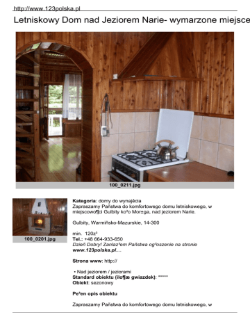 http://www.123polska.pl Letniskowy Dom nad Jeziorem Narie- wymarzone miejsce 100_0211.jpg Kategoria: domy do wynajêcia Zapraszamy Pañstwa do komfortowego domu letniskowego, w miejscowo¶ci Gulbity ko³o Mor±ga, nad jeziorem Narie. Gulbity, Warmiñsko-Mazurskie, 14-300 100_0201.jpg min. 120z³ Tel.: +48 664-933-650 Dzieñ Dobry! Zanlaz³em Pañstwa og³oszenie na stronie www.123polska.pl.... Strona www: http:// • Nad jeziorem / jeziorami Standard obiektu (ilo¶æ gwiazdek): ***** Obiekt: sezonowy Pe³en opis obiektu Zapraszamy Pañstwa do komfortowego domu letniskowego, w http://www.123polska.pl miejscowo¶ci Gulbity ko³o Mor±ga, nad jeziorem Narie, objêtym stref± ciszy i posiadaj±cym najwy¿sz± klasê czysto¶ci wody. Domek po³o¿ony jest na zagospodarowanej, bezpiecznej dzia³ce w s±siedztwie kilkunastu innych domków, w odleg³o¶ci ok. 80m do jeziora. Domek pomie¶ci do 10 osób; wynajmujemy od kwietnia do pa¼dziernika. Dzia³ka: - o¶wietlona, zagospodarowana zieleni±, wyposa¿ona w hamak, miejsce na ognisko, parasol piwny, stó³ i krzes³a; Gara¿: - przestronny, zamykany, bojler; Parter: - salon: kominek z wk³adem, rozk³adana kanapa, telewizor, radio + CD, drewniany stó³ i krzes³a; - kuchnia: wyposa¿ona w ch³odziarko-zamra¿arkê firmy Whirpool, kuchenkê mikrofalow±, kuchenkê gazow± czteropalnikow±, zlewozmywak z ciep³± i zimn± wod±, komplet sztuæców, talerzy, garnków itp.; - ³azienka: natrysk z brodzikiem, zlewozmywak z ciep³± i zimn± wod±, wc; - taras: przestronny, o¶wietlony, zabudowany drewnian± kratk±, poro¶niêt± winoro¶l±, wyposa¿ony w stó³ i komplet krzese³; Piêtro: - trzy przestronne, oddzielnie zamykane sypialnie, w dwóch znajduj± siê dwa szerokie ³ó¿ka, w trzecim jedno; sypialnie wyposa¿one s± w szafki na ubrania i bieliznê oraz w po¶ciel; ponadto na piêtrze znajduje siê du¿y, zabudowany i o¶wietlony taras, wyposa¿ony w stó³ i komplet krzese³; Dodatkowe wyposa¿enie: - ³ód¼ wios³owa z kapokiem; - 2 grille; - drewno do kominka; - le¿aki; - hamak; Wszystkie dodatkowe informacje na temat jeziora Narie znajdziecie Pañstwo na stroniewww.jezioronarie.prv.pl Cennik: kwiecieñ, maj, czerwiec, wrzesieñ, pa¼dziernik: 100-150 z³ za dobê ( w zale¿no¶ci od ilo¶ci osób i d³ugo¶ci pobytu );lipiec, sierpieñ, weekend majowy: 150-250 z³ za dobê ( w zale¿no¶ci od ilo¶ci osób i d³ugo¶ci pobytu). Wszystkie media, drewno do kominka, ³ód¼ wios³owa itp. wliczone w cenê wynajmu. Dojazd drog± E7 Warszawa-Gdañsk, w Ma³dytach skrêciæ na Mor±g http://www.123polska.pl Kontakt: Andrzej Karczmarczyk 664-933-650, [email protected] Oferowane pokoje: W pobli¿u: do sklepu: 2 km do supermarketu / marketu: 6 km do pla¿y strze¿onej: 0,5 km restauracje / kawiarnie / bary: 3 km dyskoteka / dancing / klub nocny: 3 km s³u¿by medyczne: 3 km poczta: 3 km bank / bankomat: 3 km budka telefoniczna: 3 km Internet Cafe: 3 km dworzec / przystanek PKS: 3 km dworzec PKP: 3 km