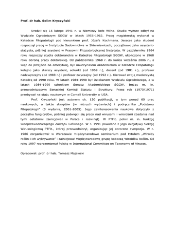 Prof. dr hab. Selim Kryczyński Urodziłsię 15 lutego 1941 r. w Niemieży koł o Wilna. Studia wyższe odbyłna Wydziale Ogrodniczym SGGW w latach 1958-1963. Pracę magisterską wykonał w Katedrze Fitopatologii pod kierunkiem prof. Józefa Kochmana. Jeszcze jako student rozpocząłpracęw Instytucie Sadownictwa w Skierniewicach, początkowo jako asystentstażysta, później asystent w Pracowni Fitopatologicznej Instytutu. W październiku 1964 roku rozpocząłstudia doktoranckie w Katedrze Fitopatologii SGGW, ukończone w 1968 roku obroną pracy doktorskiej. Od października 1968 r. do końca września 2006 r., a więc do przejścia na emeryturę, byłnauczycielem akademickim w Katedrze Fitopatologii kolejno jako starszy asystent, adiunkt (od 1969 r.), docent (od 1981 r.), profesor nadzwyczajny (od 1988 r.) i profesor zwyczajny (od 1992 r.). Kierowałswojąmacierzystą Katedrąod 1990 roku. W latach 1984-1990 byłDziekanem Wydział u Ogrodniczego, a w latach 1984-1999 przewodniczącym czł onkiem Senackiej Senatu Komisji Akademickiego Statutu i SGGW, Struktury. Przez będąc rok m. in. (1970/1971) przebywałna stażu naukowym w Cornell University w USA. Prof. Kryczyński jest autorem ok. 120 publikacji, w tym ponad 60 prac naukowych, a także skryptów (w różnych wydaniach) i podręcznika „Podstawy Fitopatologii” (3 wydania, 2001-2005). Jego zainteresowania naukowe dotyczył y z początku fungicydów, później poświęciłsiępracy nad wirusami i wiroidami (badania nad tymi ostatnimi zainicjował w Polsce i rozwinął ). W PTFit. peł nił m. in. funkcję wiceprzewodniczącego Zarządu Gł ównego. W r. 1991 powoł ano z jego inicjatywy Sekcję Wirusologiczną PTFit., której przewodniczył , organizując jej coroczne sympozja. W r. 1986 zorganizowałw Warszawie międzynarodowe seminarium pod tytuł em „Wiroidy roślin i ich wykrywanie” i zainicjowałMiędzynarodowągrupęRobocząWiroidów Roślin. Od roku 1997 reprezentowałPolskęw International Committee on Taxonomy of Viruses. Opracował : prof. dr hab. Tomasz Majewski
