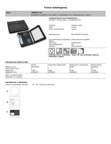 Towar katalogowy Opis: 62037-10 ELEANOR portfolio z eko skóry z notatnikiem A4 i kalkulatorem, czarny CHARAKTERYSTYKA PRZEDMIOTU: Portfolio z imitacji skóry, z notatnikiem A4. Materiał: Kolor: Kolory standardowe: Imitacja skóry czarny czarny Katalog/strona: EXCURSION 2016/053 Typ opakowania przedmiotu: Marka: Kod celny: Kraj pochodzenia: Rozmiar: białe papierowe pudełko 4202921900 CN 29x4,5x38 cm imitacja skóry, kalkulator - ilość cyfr (8), podwójne ogniwo, kalkulator, papier INFORMACJE SPEDYCYJNE: Rozmiar (cm): Ilość towaru (szt): Waga (kg): Objętość (m3): Sztuka 29x4,5x38 1 1,250 0,006200 Prezentowe opakowanie 0 0,000 0,000000 Maks. wysokość palety: Kartonów na 1 palecie: INFORMACJE O NADRUKU: Zalecona technologia nadruku: A B P N1 - N1: Tłoczenie bez koloru Opakowanie wewnętrzne 0x0x0 0 0,000 0,000000 Eksport karton 31x50x40 10 12,500 0,062000
