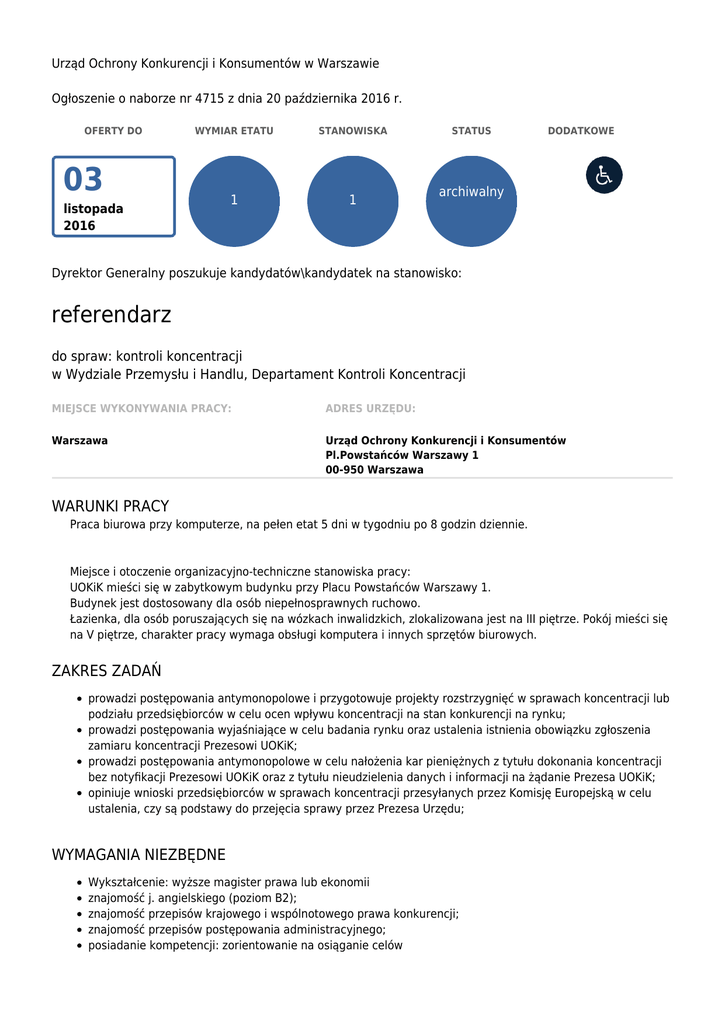 Urząd Ochrony Konkurencji i Konsumentów w Warszawie Ogłoszenie o naborze nr 4715 z dnia 20 października 2016 r. OFERTY DO WYMIAR ETATU STANOWISKA 1 1 03 listopada 2016 STATUS DODATKOWE archiwalny Dyrektor Generalny poszukuje kandydatów\kandydatek na stanowisko: referendarz do spraw: kontroli koncentracji w Wydziale Przemysłu i Handlu, Departament Kontroli Koncentracji MIEJSCE WYKONYWANIA PRACY: ADRES URZĘDU: Warszawa Urząd Ochrony Konkurencji i Konsumentów Pl.Powstańców Warszawy 1 00-950 Warszawa WARUNKI PRACY Praca biurowa przy komputerze, na pełen etat 5 dni w tygodniu po 8 godzin dziennie. Miejsce i otoczenie organizacyjno-techniczne stanowiska pracy: UOKiK mieści się w zabytkowym budynku przy Placu Powstańców Warszawy 1. Budynek jest dostosowany dla osób niepełnosprawnych ruchowo. Łazienka, dla osób poruszających się na wózkach inwalidzkich, zlokalizowana jest na III piętrze. Pokój mieści się na V piętrze, charakter pracy wymaga obsługi komputera i innych sprzętów biurowych. ZAKRES ZADAŃ prowadzi postępowania antymonopolowe i przygotowuje projekty rozstrzygnięć w sprawach koncentracji lub podziału przedsiębiorców w celu ocen wpływu koncentracji na stan konkurencji na rynku; prowadzi postępowania wyjaśniające w celu badania rynku oraz ustalenia istnienia obowiązku zgłoszenia zamiaru koncentracji Prezesowi UOKiK; prowadzi postępowania antymonopolowe w celu nałożenia kar pieniężnych z tytułu dokonania koncentracji bez notyfikacji Prezesowi UOKiK oraz z tytułu nieudzielenia danych i informacji na żądanie Prezesa UOKiK; opiniuje wnioski przedsiębiorców w sprawach koncentracji przesyłanych przez Komisję Europejską w celu ustalenia, czy są podstawy do przejęcia sprawy przez Prezesa Urzędu; WYMAGANIA NIEZBĘDNE Wykształcenie: wyższe magister prawa lub ekonomii znajomość j. angielskiego (poziom B2); znajomość przepisów krajowego i wspólnotowego prawa konkurencji; znajomość przepisów postępowania administracyjnego; posiadanie kompetencji: zorientowanie na osiąganie celów Posiadanie obywatelstwa polskiego Korzystanie z pełni praw publicznych Nieskazanie prawomocnym wyrokiem za umyślne przestępstwo lub umyślne przestępstwo skarbowe WYMAGANIA DODATKOWE posiadanie kompetencji: kreatywność; posiadanie kompetencji: umiejętności analityczne; posiadanie kompetencji: skuteczna komunikacja; DOKUMENTY I OŚWIADCZENIA NIEZBĘDNE Życiorys/CV i list motywacyjny Kopie dokumentów potwierdzających spełnienie wymagania niezbędnego w zakresie wykształcenia Oświadczenie o posiadaniu obywatelstwa polskiego albo kopia dokumentu potwierdzającego posiadanie polskiego obywatelstwa Oświadczenie o wyrażeniu zgody na przetwarzanie danych osobowych do celów naboru Oświadczenie o korzystaniu z pełni praw publicznych Oświadczenie o nieskazaniu prawomocnym wyrokiem za umyślne przestępstwo lub umyślne przestępstwo skarbowe DOKUMENTY I OŚWIADCZENIA DODATKOWE kopia dokumentu potwierdzającego niepełnosprawność - w przypadku kandydatek/kandydatów, zamierzających skorzystać z pierwszeństwa w zatrudnieniu w przypadku, gdy znajdą się w gronie najlepszych kandydatek/kandydatów TERMINY I MIEJSCE SKŁADANIA DOKUMENTÓW Dokumenty należy złożyć do: 03 listopada 2016 r. Decyduje data: stempla pocztowego / osobistego dostarczenia oferty do urzędu Miejsce składania dokumentów: Urząd Ochrony Konkurencji i Konsumentów pl. Powstańców Warszawy 1 00-950 Warszawa lub składać w Kancelarii UOKiK (wejście od centrum konferencyjnego Urzędu) z dopiskiem "DKK-REF" INNE INFORMACJE: W miesiącu poprzedzającym datę upublicznienia ogłoszenia wskaźnik zatrudnienia osób niepełnosprawnych w urzędzie, w rozumieniu przepisów o rehabilitacji zawodowej i społecznej oraz zatrudnianiu osób niepełnosprawnych, nie wynosi co najmniej 6%. Nasz urząd jest pracodawcą równych szans i wszystkie aplikacje są rozważane z równą uwagą bez względu na płeć, wiek, niepełnosprawność, rasę, narodowość, przekonania polityczne, przynależność związkową, pochodzenie etniczne, wyznanie, orientacje seksualną czy też jakąkolwiek inną cechę prawnie chronioną. Dokumenty aplikacyjne powinny zawierać oświadczenia o treści wskazanej w ogłoszeniu, podpisane odręcznie i opatrzone datą (List Motywacyjny, Oświadczenia). Oświadczenia do pobrania pod adresem: http://uokik.gov.pl/kariera_w_uokik.php Uwaga! Weryfikacja spełniania przez kandydatów wymagań formalnych dokonana zostanie na podstawie dokumentów wymienionych w części „ dokumenty i oświadczenia niezbędne”. W związku z tym podkreślamy, że kompletne aplikacje to takie, które zawierają wszystkie wymagane dokumenty i własnoręcznie podpisane oświadczenia. Przekazanie dokumentów wymienionych w części „dokumentów i oświadczenia dodatkowe” nie jest obowiązkowe, jednak będą one podstawą przeprowadzenia oceny spełniania wymagań dodatkowych przez kandydatów. Planowane techniki i metody naboru: sprawdzian wiedzy, próbka pracy, rozmowa kwalifikacyjna, Zachęcamy do składania ofert osoby niepełnosprawne, które spełniają wymagania określone w niniejszym ogłoszeniu. Proces rekrutacji trwa co najmniej 1 miesiąc od dnia ukazania się ogłoszenia. Osoby zakwalifikowane do kolejnego etapu postępowania rekrutacyjnego zostaną powiadomione telefonicznie lub e-mailem. Oferty osób niezakwalifikowanych zostaną zniszczone po upływie co najmniej 4 miesięcy od zakończenia procesu rekrutacji. Dodatkowe informacje można uzyskać pod numerem telefonu: (22) 556 02 44 lub (22) 556 01 65 Legenda Pierwszeństwo dla osób z niepełnosprawnościami Ogłoszenie z tym symbolem oznacza, że pierwszeństwo w zatrudnieniu mają osoby z niepełnosprawnościami, które spełniają wszystkie następujące warunki: • złożyły w terminie ofertę wraz z dokumentem potwierdzającym niepełnosprawność, • spełniają warunki wymienione w ogłoszeniu, • po re
