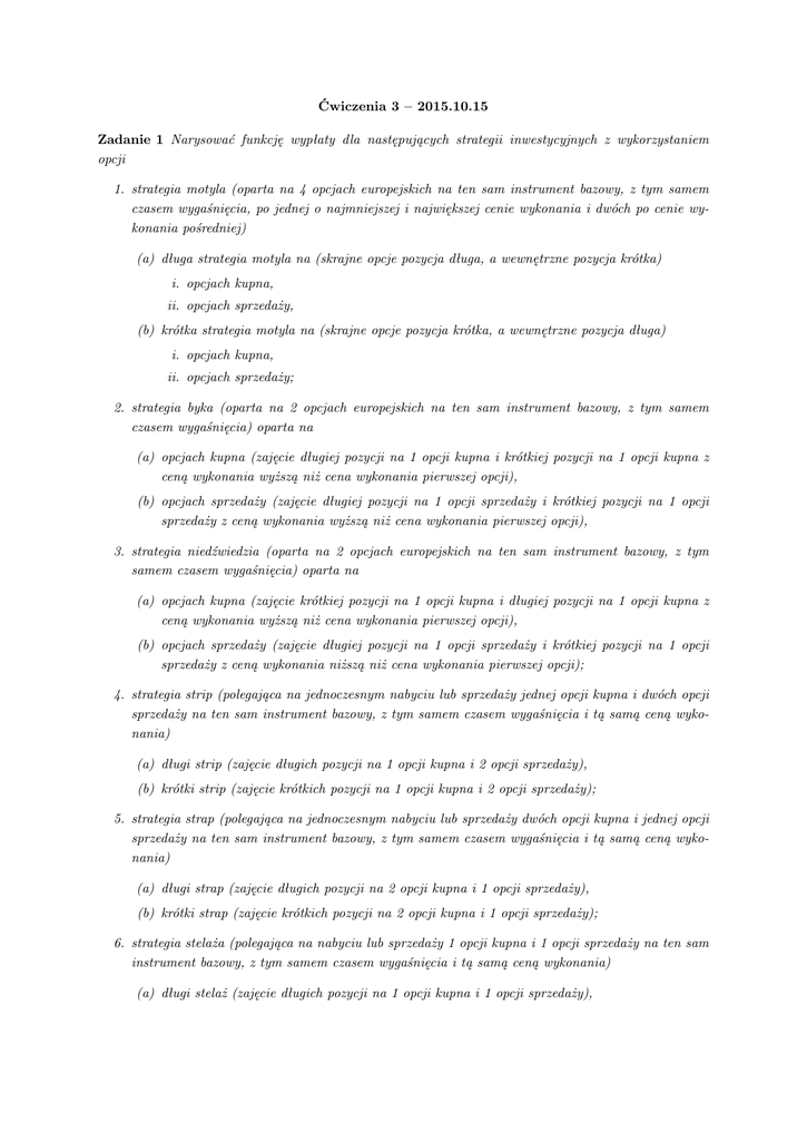 Ćwiczenia 3 – 2015.10.15 Zadanie 1 Narysować funkcję wypłaty dla następujących strategii inwestycyjnych z wykorzystaniem opcji 1. strategia motyla (oparta na 4 opcjach europejskich na ten sam instrument bazowy, z tym samem czasem wygaśnięcia, po jednej o najmniejszej i największej cenie wykonania i dwóch po cenie wykonania pośredniej) (a) długa strategia motyla na (skrajne opcje pozycja długa, a wewnętrzne pozycja krótka) i. opcjach kupna, ii. opcjach sprzedaży, (b) krótka strategia motyla na (skrajne opcje pozycja krótka, a wewnętrzne pozycja długa) i. opcjach kupna, ii. opcjach sprzedaży; 2. strategia byka (oparta na 2 opcjach europejskich na ten sam instrument bazowy, z tym samem czasem wygaśnięcia) oparta na (a) opcjach kupna (zajęcie długiej pozycji na 1 opcji kupna i krótkiej pozycji na 1 opcji kupna z ceną wykonania wyższą niż cena wykonania pierwszej opcji), (b) opcjach sprzedaży (zajęcie długiej pozycji na 1 opcji sprzedaży i krótkiej pozycji na 1 opcji sprzedaży z ceną wykonania wyższą niż cena wykonania pierwszej opcji), 3. strategia niedźwiedzia (oparta na 2 opcjach europejskich na ten sam instrument bazowy, z tym samem czasem wygaśnięcia) oparta na (a) opcjach kupna (zajęcie krótkiej pozycji na 1 opcji kupna i długiej pozycji na 1 opcji kupna z ceną wykonania wyższą niż cena wykonania pierwszej opcji), (b) opcjach sprzedaży (zajęcie długiej pozycji na 1 opcji sprzedaży i krótkiej pozycji na 1 opcji sprzedaży z ceną wykonania niższą niż cena wykonania pierwszej opcji); 4. strategia strip (polegająca na jednoczesnym nabyciu lub sprzedaży jednej opcji kupna i dwóch opcji sprzedaży na ten sam instrument bazowy, z tym samem czasem wygaśnięcia i tą samą ceną wykonania) (a) długi strip (zajęcie długich pozycji na 1 opcji kupna i 2 opcji sprzedaży), (b) krótki strip (zajęcie krótkich pozycji na 1 opcji kupna i 2 opcji sprzedaży); 5. strategia strap (polegająca na jednoczesnym nabyciu lub sprzedaży dwóch opcji kupna i jednej opcji sprzedaży na ten sam instrument bazowy, z tym samem czasem wygaśnięcia i tą samą ceną wykonania) (a) długi strap (zajęcie długich pozycji na 2 opcji kupna i 1 opcji sprzedaży), (b) krótki strap (zajęcie krótkich pozycji na 2 opcji kupna i 1 opcji sprzedaży); 6. strategia stelaża (polegająca na nabyciu lub sprzedaży 1 opcji kupna i 1 opcji sprzedaży na ten sam instrument bazowy, z tym samem czasem wygaśnięcia i tą samą ceną wykonania) (a) długi stelaż (zajęcie długich pozycji na 1 opcji kupna i 1 opcji sprzedaży), (b) krótki stelaż (zajęcie krótkich pozycji na 1 opcji kupna i 1 opcji sprzedaży); 7. strategia covered call (kupno akcji lub zajęciu długiej pozycji w kontrakcie futures oraz zajęciu krótkiej w pozycji w opcji kupna); 8. strategia naked put (nieosłonięta opcja sprzedaży) (zajęcie krótkiej pozycji na 1 opcji sprzedaży, bez zajmowania pozycji w instrumencie bazowym ani w innym instrumencie pochodnym na instrument bazowy); 9. strategia kalendarzowa (zajęcie krótkiej pozycji na 1 opcji kupna o wcześniejszym terminie wygaśnięcia i długiej na 1 opcji kupna o późniejszym terminie wygaśnięcia, gdy obie opcje mają tą samą cenę wykonania).