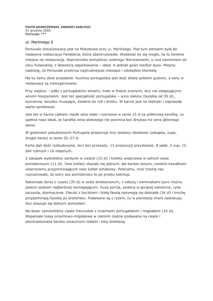 PIOTR ADAMCZEWSKI, ANDRZEJ GARLICKI 01 grudnia 2005 Portucale *** ul. Merliniego 5 Portucale zlokalizowana jest na Mokotowie przy ul. Merliniego. Pod tym adresem była do niedawna restauracja Fanaberia, która zbankrutowała. Wydawać by się mogło, że to świetne miejsce na restaurację. Naprzeciwko kompleksu wodnego Warszawianki, o rzut kamieniem od ulicy Puławskiej, z łatwością zaparkowania – ideał. A jednak gości niezbyt dużo. Miejmy nadzieję, że Portucale przetrwa najtrudniejsze miesiące i zdobędzie klientelę. Ma ku temu dwie przesłanki. Kuchnia portugalska jest dość bliska polskim gustom, a ceny w restauracji są niewygórowane. Przy wejściu – półki z portugalskimi winami, mało w Polsce znanymi, lecz nie ustępującymi winom hiszpańskim. Jest też specjalność portugalska – wino zielone (butelka od 35 zł), wytrawne, leciutko musujące, świetne do ryb i drobiu. W karcie jest na kieliszki i naprawdę warto spróbować. Jest też w karcie całkiem niezłe wino białe i czerwone w cenie 15 zł za półlitrową karafkę, co spełnia nasz ideał, że karafka wina stołowego nie powinna być droższa niż cena głównego dania. W godzinach południowych Portugalia proponuje trzy zestawy obiadowe (zakąska, zupa, drugie danie) w cenie 25–27 zł. Karta dań dość rozbudowana, lecz bez przesady. 13 propozycji przystawek, 8 sałat, 5 zup, 12 dań rybnych i 16 mięsnych. Z zakąsek wybraliśmy sardynki w cieście (10 zł) i kotlety wieprzowe w ostrym sosie pomidorowym (11 zł). Owe kotlety okazały się jednym, ale bardzo dużym, cienkim kawałkiem wieprzowiny przypominającym nasz kotlet schabowy. Polecamy, choć trochę nas rozczarowało, że ostry sos pomidorowy to po prostu ketchup. Natomiast dorsz z rusztu (35 zł) w sosie śmietanowym, z cebulą i ziemniakami pure można polecić osobom najbardziej wymagającym. Duża porcja, podana w gorącej kamionce, ryba soczysta, dosmaczona. Flaczki z boczkiem i białą fasolą nazywają się dobrada (34 zł) i trochę przypominają fasolkę po bretońsku. Podawane są z ryżem, co w pierwszej chwili zaskakuje, lecz okazuje się dobrym pomysłem. Na deser zamówiliśmy ciasto francuskie z orzechami portugalskimi i migdałami (16 zł). Wspaniała masa orzechowo-migdałowa w cienkim cieście podawana na ciepło i skontrastowana bardzo smacznymi lodami i bitą śmietaną.