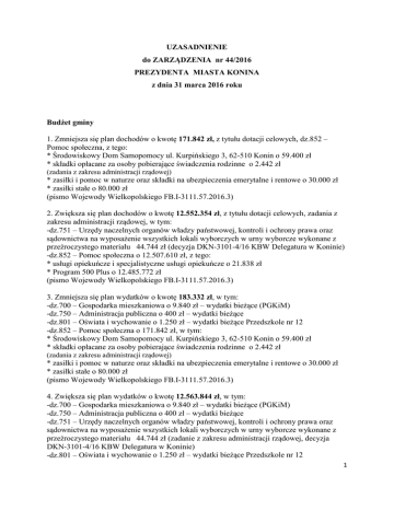 UZASADNIENIE do ZARZĄDZENIA nr 44/2016 PREZYDENTA MIASTA KONINA z dnia 31 marca 2016 roku Budżet gminy 1. Zmniejsza się plan dochodów o kwotę 171.842 zł, z tytułu dotacji celowych, dz.852 – Pomoc społeczna, z tego: * Środowiskowy Dom Samopomocy ul. Kurpińskiego 3, 62-510 Konin o 59.400 zł * składki opłacane za osoby pobierające świadczenia rodzinne o 2.442 zł (zadania z zakresu administracji rządowej) * zasiłki i pomoc w naturze oraz składki na ubezpieczenia emerytalne i rentowe o 30.000 zł * zasiłki stałe o 80.000 zł (pismo Wojewody Wielkopolskiego FB.I-3111.57.2016.3) 2. Zwiększa się plan dochodów o kwotę 12.552.354 zł, z tytułu dotacji celowych, zadania z zakresu administracji rządowej, w tym: -dz.751 – Urzędy naczelnych organów władzy państwowej, kontroli i ochrony prawa oraz sądownictwa na wyposażenie wszystkich lokali wyborczych w urny wyborcze wykonane z przeźroczystego materiału 44.744 zł (decyzja DKN-3101-4/16 KBW Delegatura w Koninie) -dz.852 – Pomoc społeczna o 12.507.610 zł, z tego: * usługi opiekuńcze i specjalistyczne usługi opiekuńcze o 21.838 zł * Program 500 Plus o 12.485.772 zł (pismo Wojewody Wielkopolskiego FB.I-3111.57.2016.3) 3. Zmniejsza się plan wydatków o kwotę 183.332 zł, w tym: -dz.700 – Gospodarka mieszkaniowa o 9.840 zł – wydatki bieżące (PGKiM) -dz.750 – Administracja publiczna o 400 zł – wydatki bieżące -dz.801 – Oświata i wychowanie o 1.250 zł – wydatki bieżące Przedszkole nr 12 -dz.852 – Pomoc społeczna o 171.842 zł, w tym: * Środowiskowy Dom Samopomocy ul. Kurpińskiego 3, 62-510 Konin o 59.400 zł * składki opłacane za osoby pobierające świadczenia rodzinne o 2.442 zł (zadania z zakresu administracji rządowej) * zasiłki i pomoc w naturze oraz składki na ubezpieczenia emerytalne i rentowe o 30.000 zł * zasiłki stałe o 80.000 zł (pismo Wojewody Wielkopolskiego FB.I-3111.57.2016.3) 4. Zwiększa się plan wydatków o kwotę 12.563.844 zł, w tym: -dz.700 – Gospodarka mieszkaniowa o 9.840 zł – wydatki bieżące (PGKiM) -dz.750 – Administracja publiczna o 400 zł – wydatki bieżące -dz.751 – Urzędy naczelnych organów władzy państwowej, kontroli i ochrony prawa oraz sądownictwa na wyposażenie wszystkich lokali wyborczych w urny wyborcze wykonane z przeźroczystego materiału 44.744 zł (zadanie z zakresu administracji rządowej, decyzja DKN-3101-4/16 KBW Delegatura w Koninie) -dz.801 – Oświata i wychowanie o 1.250 zł – wydatki bieżące Przedszkole nr 12 1 -dz.852 – Pomoc społeczna o 12.507.610 zł, z tego: * usługi opiekuńcze i specjalistyczne usługi opiekuńcze o 21.838 zł * Program 500 Plus o 12.485.772 zł (zadania z zakresu administracji rządowej, pismo Wojewody Wielkopolskiego FB.I3111.57.2016.3) Budżet powiatu 1. Zwiększa się plan dochodów o kwotę 46.350 zł, z tytułu dotacji celowej, zadanie z zakresu administracji rządowej dz.755 – Wymiar sprawiedliwości, z przeznaczeniem na sfinansowanie zadań wynikających z ustawy z dnia 5 sierpnia 2015 r. o nieodpłatnej pomocy prawnej oraz edukacji prawnej (pismo Wojewody Wielkopolskiego FB-I.3111.69/2016.5) 2. Zmniejsza się plan wydatków o kwotę 42.407 zł, w tym: -dz.600 – Transport i łączność o 42.000 zł – wydatki bieżące ZDM w Koninie -dz.750 – Administracja publiczna o 300 zł – wydatki bieżące (zadanie z zakresu administracji rządowej) -dz.852 – Pomoc społeczna o 107 zł - wydatki bieżące DPS w Koninie 3. Zwiększa się plan wydatków o kwotę 88.757 zł, w tym: -dz.600 – Transport i łączność o 42.000 zł – wydatki bieżące ZDM w Koninie -dz.750 – Administracja publiczna o 300 zł – wydatki bieżące (zadanie z zakresu administracji rządowej) -dz.755 - Wymiar sprawiedliwości o 46.350 zł - na sfinansowanie zadań wynikających z ustawy z dnia 5 sierpnia 2015 r. o nieodpłatnej pomocy prawnej oraz edukacji prawnej (zadanie z zakresu administracji rządowej, pismo Wojewody Wielkopolskiego FBI.3111.69/2016.5) -dz.852 – Pomoc społeczna o 107 zł - wydatki bieżące DPS w Koninie Skarbnik Miasta Irena Baranowska 2