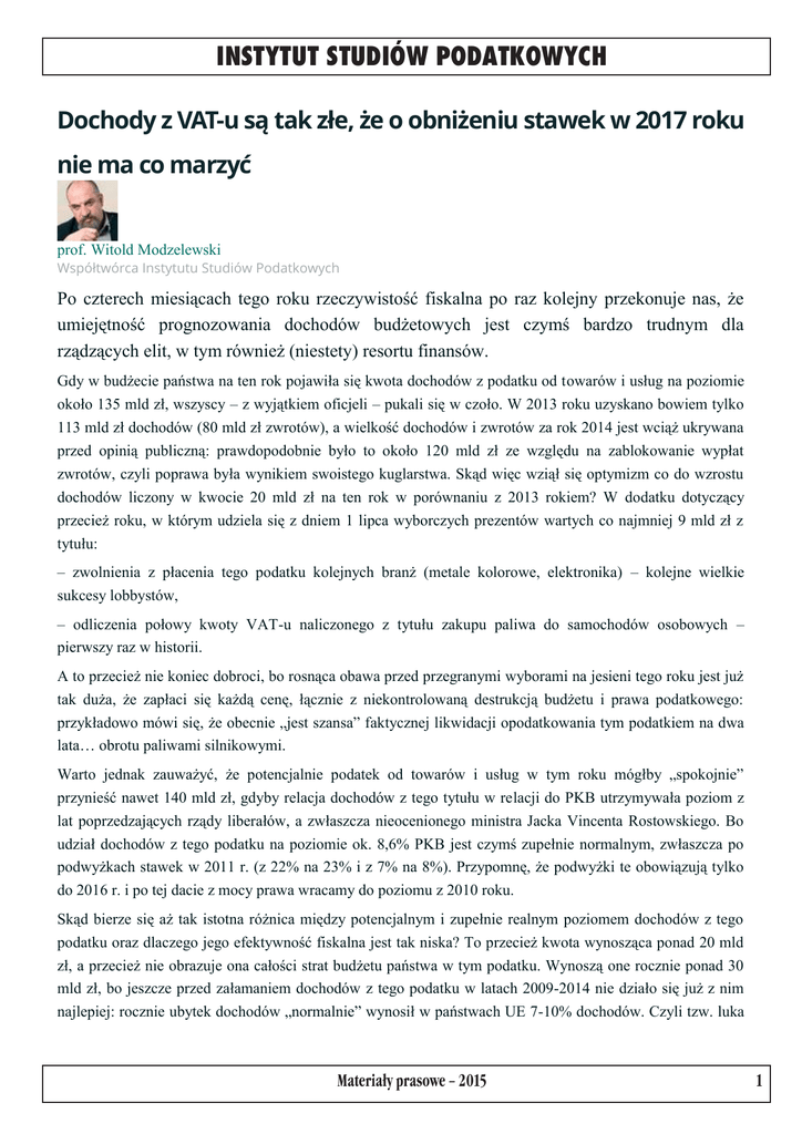 INSTYTUT STUDIÓW PODATKOWYCH Dochody z VAT-u są tak złe, że o obniżeniu stawek w 2017 roku nie ma co marzyć prof. Witold Modzelewski Współtwórca Instytutu Studiów Podatkowych Po czterech miesiącach tego roku rzeczywistość fiskalna po raz kolejny przekonuje nas, że umiejętność prognozowania dochodów budżetowych jest czymś bardzo trudnym dla rządzących elit, w tym również (niestety) resortu finansów. Gdy w budżecie państwa na ten rok pojawiła się kwota dochodów z podatku od towarów i usług na poziomie około 135 mld zł, wszyscy – z wyjątkiem oficjeli – pukali się w czoło. W 2013 roku uzyskano bowiem tylko 113 mld zł dochodów (80 mld zł zwrotów), a wielkość dochodów i zwrotów za rok 2014 jest wciąż ukrywana przed opinią publiczną: prawdopodobnie było to około 120 mld zł ze względu na zablokowanie wypłat zwrotów, czyli poprawa była wynikiem swoistego kuglarstwa. Skąd więc wziął się optymizm co do wzrostu dochodów liczony w kwocie 20 mld zł na ten rok w porównaniu z 2013 rokiem? W dodatku dotyczący przecież roku, w którym udziela się z dniem 1 lipca wyborczych prezentów wartych co najmniej 9 mld zł z tytułu: – zwolnienia z płacenia tego podatku kolejnych branż (metale kolorowe, elektronika) – kolejne wielkie sukcesy lobbystów, – odliczenia połowy kwoty VAT-u naliczonego z tytułu zakupu paliwa do samochodów osobowych – pierwszy raz w historii. A to przecież nie koniec dobroci, bo rosnąca obawa przed przegranymi wyborami na jesieni tego roku jest już tak duża, że zapłaci się każdą cenę, łącznie z niekontrolowaną destrukcją budżetu i prawa podatkowego: przykładowo mówi się, że obecnie „jest szansa” faktycznej likwidacji opodatkowania tym podatkiem na dwa lata… obrotu paliwami silnikowymi. Warto jednak zauważyć, że potencjalnie podatek od towarów i usług w tym roku mógłby „spokojnie” przynieść nawet 140 mld zł, gdyby relacja dochodów z tego tytułu w relacji do PKB utrzymywała poziom z lat poprzedzających rządy liberałów, a zwłaszcza nieocenionego ministra Jacka Vincenta Rostowskiego. Bo udział dochodów z tego podatku na poziomie ok. 8,6% PKB jest czymś zupełnie normalnym, zwłaszcza po podwyżkach stawek w 2011 r. (z 22% na 23% i z 7% na 8%). Przypomnę, że podwyżki te obowiązują tylko do 2016 r. i po tej dacie z mocy prawa wracamy do poziomu z 2010 roku. Skąd bierze się aż tak istotna różnica między potencjalnym i zupełnie realnym poziomem dochodów z tego podatku oraz dlaczego jego efektywność fiskalna jest tak niska? To przecież kwota wynosząca ponad 20 mld zł, a przecież nie obrazuje ona całości strat budżetu państwa w tym podatku. Wynoszą one rocznie ponad 30 mld zł, bo jeszcze przed załamaniem dochodów z tego podatku w latach 2009-2014 nie działo się już z nim najlepiej: rocznie ubytek dochodów „normalnie” wynosił w państwach UE 7-10% dochodów. Czyli tzw. luka Materia³y prasowe – 2015 1 INSTYTUT STUDIÓW PODATKOWYCH – zresztą różnie szacowana przez organy UE jak i inne ośrodki – wynosi minimum 33 mld zł, a maksymalnie nawet 40 mld zł (w 2013 r.). Skąd więc bierze się różnica między potencjalnym a rzeczywistym poziomem dochodów? Odpowiedź jest dość dobrze znana: – przepisy na temat tego podatku tworzone są w interesie międzynarodowego biznesu podatkowego, który jest autorem większości (wszystkich?) istotnych rozwiązań w tym podatku, – możliwość uchylania się od jego płacenia przez podatników realnie działających na rynku jest dość prosta, bo dzięki „nowelizacjom optymalizacyjnym” uzyskują „oszczędności podatkowe” nie tylko ci, dla których zostały one napisane, – istnieje potężna międzynarodowa mafia (mafie?) zajmująca się wyłudzeniami tego podatku (to nie są żadni „podatnicy”, choć ich gorliwie udają), którzy żyją z patologii wspólnotowej wersji tego podatku. Który z tych czynników jest najgroźniejszy? Oczywiście ten pierwszy, bo tam tworzy się przepisy, które powodują „legalną” utratę miliardowych kwot w tym podatku. Większość tych przepisów powstaje na szczeblu wspólnotowym, ale nasi „krajowi” prawodawcy oraz związani z nimi „eksperci” mają w ich tworzeniu swój znakomity udział. Na przykład, co proponują jako sposób przeciwdziałania tym patologiom w tym podatku? Otóż np. ma być utworzony „centralny rejestr faktur”, czyli każdy podmiot (nawet taksówkarz!) będzie musiał zgłosić wystawioną przez siebie fakturę do urzędu skarbowego, a oni będą „wklepywać” je do jakiegoś rejestru, a trzeba pamiętać, że większość (absolutna) faktur w Polsce wystawiana jest w formie papierowej, bo zastosowanie ich elektronicznej wersji grozi atakiem przestępców, którzy je masowo podrabiają. Ponoć ten rejestr ma być powszechnie dostępny, czyli każdy konkurent sprawdzi, po ile ktoś sprzedaje czy kupuje. Bzdury? Oczywiście, ale można podejrzewać, że stoi za nim biznes informatyczny, który być może chce dzięki współpracy ekspertów i urzędników zarobić na naszym państwie. Ciekawe, czy już jest oprogramowanie dla tego systemu? Niektórzy „przyrządowi” znawcy tego podatku idą jeszcze dalej i proponują, aby podatnicy przekazywali do jakiegoś centralnego rejestru… całość swojej ewidencji podatkowej, a wszyscy, łącznie z przestępcami i obcymi wywiadami, będą mogli mieć do niej dostęp. Czy pomysły te są dowodem tylko braku wiedzy lub zwykłego „liberalnego” szkodnictwa, bo wiadomo, że im gorzej z podatkami, to tym lepiej, bo „więcej pieniędzy zostanie w kieszeni podatników” (nawet można się domyślać których). Może, ale należy rozważyć hipotezę, że jest to celowe działanie mające na celu destrukcję tego podatku. Aby dochody budżetowe z tego podatku przestały spadać, trzeba przede wszystkim przeciąć związki między naszym „prawodawcą
