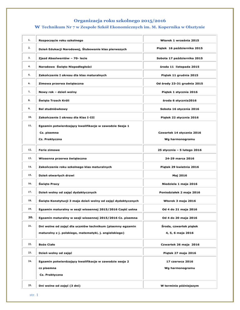 Organizacja roku szkolnego 2015/2016 w Technikum Nr 7 w Zespole Szkół Ekonomicznych im. M. Kopernika w Olsztynie 1. Rozpoczęcie roku szkolnego 2. Dzień Edukacji Narodowej, Ślubowanie klas pierwszych Piątek 16 października 2015 3. Zjazd Absolwentów – 70- lecie Sobota 17 października 2015 4. Narodowe Święto Niepodległości 5. Zakończenie I okresu dla klas maturalnych 6. Zimowa przerwa świąteczna 7. Nowy rok – dzień wolny 8. Święto Trzech Króli 9. Bal studniówkowy Sobota 16 stycznia 2016 10. Zakończenie I okresu dla Klas I-III Piątek 22 stycznia 2016 11. Egzamin potwierdzający kwalifikacje w zawodzie Sesja 1 Cz. pisemna Cz. Praktyczna Wtorek 1 września 2015 środa 11 listopada 2015 Piątek 11 grudnia 2015 Od środy 23-31 grudnia 2015 Piątek 1 stycznia 2016 środa 6 stycznia2016 Czwartek 14 stycznia 2016 Wg harmonogramu 12. Ferie zimowe 13. Wiosenna przerwa świąteczna 14. Zakończenie roku szkolnego klas maturalnych 15. Dzień otwartych drzwi 16. Święto Pracy 17. Dzień wolny od zajęć dydaktycznych 18. Święto Konstytucji 3 maja dzień wolny od zajęć dydaktycznych Wtorek 3 maja 2016 19. Egzamin maturalny w sesji wiosennej 2015/2016 Część ustna Od 4 do 21 maja 2016 20. Egzamin maturalny w sesji wiosennej 2015/2016 Cz. pisemna Od 4 do 20 maja 2016 21. Dni wolne od zajęć dla uczniów technikum (pisemny egzamin Środa, czwartek piątek maturalny z j. polskiego, matematyki, j. angielskiego) 22. Boże Ciało 23. Dzień wolny od zajęć 24. Egzamin potwierdzający kwalifikacje w zawodzie sesja 2 cz pisemna 25 stycznia – 5 lutego 2016 24-29 marca 2016 Piątek 29 kwietnia 2016 Maj 2016 Niedziela 1 maja 2016 Poniedziałek 2 maja 2016 4, 5, 6 maja 2016 Czwartek 26 maja 2016 Piątek 27 maja 2016 17 czerwca 2016 Wg harmonogramu Cz. Praktyczna 25. str. 1 Dni wolne od zajęć (3 dni) W terminie późniejszym 26. Zakończenie roku szkolnego 27. Ferie letnie 28. Egzamin maturalny w terminie poprawkowym ustny 29. Egzamin poprawkowy pisemny maturalny 30. Egzaminy poprawkowe Piątek 24 czerwca 2016 25 czerwca -31 sierpnia 2016 24-26 sierpnia 2016 23 sierpnia 2016 22 - 26 sierpnia 2016 W związku z organizacją egzaminów zewnętrznych harmonogram dni wolnych może ulec zmianie. str. 2 Terminarz rad pedagogicznych klasyfikacyjnych 1. Klasyfikacja śródroczna klas maturalnych Środa 9 grudnia 2015, godz. 19:00 2. Klasyfikacja śródroczna pozostałych klas Środa 20 stycznia 2016, godz.19:00 3. Klasyfikacja końcowa klas maturalnych Poniedziałek 25 kwietnia 2016, godz.19:00 4. Klasyfikacja roczna Poniedziałek 0 czerwca 2016, godz.15:00 Terminarz – klasyfikacja uczniów 1. Klasyfikacja śródroczna – wystawienie ocen w klasach maturalnych Do wtorku 8 grudnia 2015, godz.12:00 2. Klasyfikacja śródroczna – wystawienie ocen Do wtorku 19 stycznia 2016, godz.12:00 3. Klasyfikacja końcowa ustalenie przewidywanych ocen – klasy Do wtorku 2 grudnia 2015, godz. 12:00 maturalne wpisanie do dziennika przewidywanych ocen Do poniedziałku 18 kwietnia 2016 godz15:00 4. Wpisanie do dziennika ocen końcowych Do wtorku 8 grudnia 2015, godz.12:00 (przedmioty zawodowe) Do czwartku 21 kwietnia 2016 godz15:00 5. Klasyfikacja roczna – wpisanie do dziennika przewidywanych ocen Do poniedziałku 13 czerwca 2016, godz.15:00 6. Klasyfikacja roczna – wystawienie ocen Do czwartku 16 czerwca 2016 Terminarz spotkań dyrekcji i wychowawców klas z rodzicami 2015/2016 1. Spotkanie z rodzicami - 18 września 2015 wybory do Rady Rodziców 2. Spotkanie dyrekcji z rodzicami klas I 6 listopada 2015 Informacyjne 4. Podsumowujące klasyfikację za I okres 5. Spotkanie dyrekcji z rodzicami klas II 22 stycznia 2016 18 marca 2016 Pedagogizacja rodziców- propozycja rodziców 6. Informacyjne. Pedagogizacja rodziców- zgodna z oczekiwaniem rodziców str. 3 3 czerwca 2016