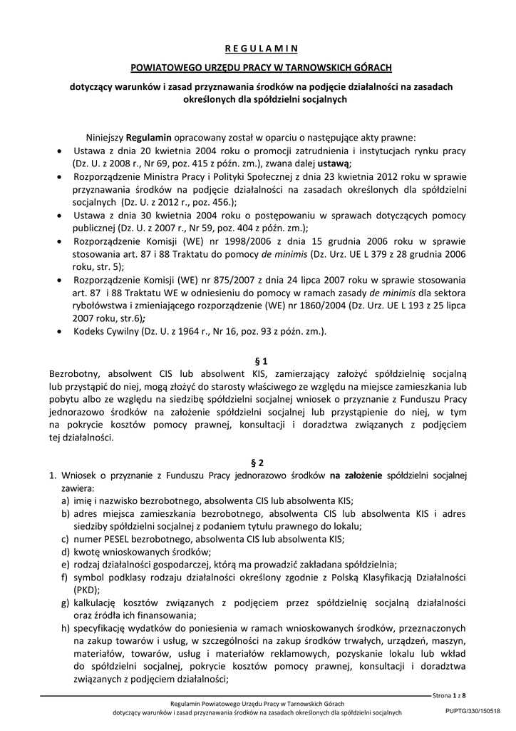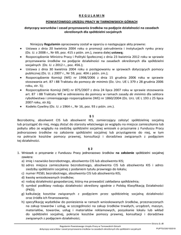 REGULAMIN POWIATOWEGO URZĘDU PRACY W TARNOWSKICH GÓRACH dotyczący warunków i zasad przyznawania środków na podjęcie działalności na zasadach określonych dla spółdzielni socjalnych • • • • • • Niniejszy Regulamin opracowany został w oparciu o następujące akty prawne: Ustawa z dnia 20 kwietnia 2004 roku o promocji zatrudnienia i instytucjach rynku pracy (Dz. U. z 2008 r., Nr 69, poz. 415 z późn. zm.), zwana dalej ustawą; Rozporządzenie Ministra Pracy i Polityki Społecznej z dnia 23 kwietnia 2012 roku w sprawie przyznawania środków na podjęcie działalności na zasadach określonych dla spółdzielni socjalnych (Dz. U. z 2012 r., poz. 456.); Ustawa z dnia 30 kwietnia 2004 roku o postępowaniu w sprawach dotyczących pomocy publicznej (Dz. U. z 2007 r., Nr 59, poz. 404 z późn. zm.); Rozporządzenie Komisji (WE) nr 1998/2006 z dnia 15 grudnia 2006 roku w sprawie stosowania art. 87 i 88 Traktatu do pomocy de minimis (Dz. Urz. UE L 379 z 28 grudnia 2006 roku, str. 5); Rozporządzenie Komisji (WE) nr 875/2007 z dnia 24 lipca 2007 roku w sprawie stosowania art. 87 i 88 Traktatu WE w odniesieniu do pomocy w ramach zasady de minimis dla sektora rybołówstwa i zmieniającego rozporządzenie (WE) nr 1860/2004 (Dz. Urz. UE L 193 z 25 lipca 2007 roku, str.6); Kodeks Cywilny (Dz. U. z 1964 r., Nr 16, poz. 93 z późn. zm.). §1 Bezrobotny, absolwent CIS lub absolwent KIS, zamierzający założyć spółdzielnię socjalną lub przystąpić do niej, mogą złożyć do starosty właściwego ze względu na miejsce zamieszkania lub pobytu albo ze względu na siedzibę spółdzielni socjalnej wniosek o przyznanie z Funduszu Pracy jednorazowo środków na założenie spółdzielni socjalnej lub przystąpienie do niej, w tym na pokrycie kosztów pomocy prawnej, konsultacji i doradztwa związanych z podjęciem tej działalności. §2 1. Wniosek o przyznanie z Funduszu Pracy jednorazowo środków na założenie spółdzielni socjalnej zawiera: a) imię i nazwisko bezrobotnego, absolwenta CIS lub absolwenta KIS; b) adres miejsca zamieszkania bezrobotnego, absolwenta CIS lub absolwenta KIS i adres siedziby spółdzielni socjalnej z podaniem tytułu prawnego do lokalu; c) numer PESEL bezrobotnego, absolwenta CIS lub absolwenta KIS; d) kwotę wnioskowanych środków; e) rodzaj działalności gospodarczej, którą ma prowadzić zakładana spółdzielnia; f) symbol podklasy rodzaju działalności określony zgodnie z Polską Klasyfikacją Działalności (PKD); g) kalkulację kosztów związanych z podjęciem przez spółdzielnię socjalną działalności oraz źródła ich finansowania; h) specyfikację wydatków do poniesienia w ramach wnioskowanych środków, przeznaczonych na zakup towarów i usług, w szczególności na zakup środków trwałych, urządzeń, maszyn, materiałów, towarów, usług i materiałów reklamowych, pozyskanie lokalu lub wkład do spółdzielni socjalnej, pokrycie kosztów pomocy prawnej, konsultacji i doradztwa związanych z podjęciem działalności; Strona 1 z 8 Regulamin Powiatowego Urzędu Pracy w Tarnowskich Górach dotyczący warunków i zasad przyznawania środków na zasadach określonych dla spółdzielni socjalnych PUPTG/330/150518 i) proponowaną formę zabezpieczenia zwrotu dofinansowania, o której mowa w § 9 ust. 1 niniejszego Regulaminu; j) podpis bezrobotnego, absolwenta CIS lub absolwenta KIS; k) charakterystykę wnioskodawcy; l) charakterystykę planowanego przedsięwzięcia, tj.: i. dokładny opis planowanej działalności; ii. informację na temat działań podjętych na rzecz uruchomienia spółdzielni socjalnej; iii. analiza marketingowa działalności; iv. przewidywane koszty i efekty ekonomiczne prowadzenia działalności. 2. Do wniosku o przyznanie z Funduszu Pracy jednorazowo środków na założenie spółdzielni socjalnej bezrobotny, absolwent CIS lub absolwent KIS dołączają pisemne oświadczenie założycieli spółdzielni socjalnej o wykorzystaniu zgodnie z przeznaczeniem środków Funduszu Pracy przyznanych na założenie spółdzielni socjalnej, które będą wniesione przez członków do spółdzielni socjalnej. 3. Do wniosku o przyznanie z Funduszu Pracy jednorazowo środków na założenie spółdzielni socjalnej bezrobotny, absolwent CIS lub absolwent KIS dołączają oświadczenia o: a) nieotrzymaniu bezzwrotnych środków Funduszu Pracy lub innych środków publicznych na podjęcie działalności gospodarczej lub rolniczej, założenie spółdzielni socjalnej lub przystąpienie do niej; b) nieprowadzeniu działalności gospodarczej w okresie 12 miesięcy bezpośrednio poprzedzających dzień złożenia wniosku; c) nieposiadaniu wpisu do Krajowego Rejestru Sądowego jako założyciel spółdzielni socjalnej w okresie 6 miesięcy bezpośrednio poprzedzających dzień złożenia wniosku; d) wykorzystaniu przyznanych środków zgodnie z przeznaczeniem; e) niekaralności w okresie 2 lat przed dniem złożenia wniosku za przestępstwa przeciwko obrotowi gospodarczemu, w rozumieniu ustawy z dnia 6 czerwca 1997 r. – Kodeks karny (Dz. U. Nr 88, poz. 553, z późn. zm.) lub ustawy z dnia 28 października 2002 r. o odpowiedzialności podmiotów zbiorowych za czyny zabronione pod groźbą kary (Dz.U. Nr 197, poz. 1661, z późn. zm.); f) niezłożeniu wniosku do innego starosty o przyznanie środków na podjęcie działalności gospodarczej lub środków na założenie spółdzielni socjalnej lub przystąpienie do niej. §3 1. Wniosek o przyznanie z Funduszu Pracy jednorazowo środków na przystąpienie do spółdzielni socjalnej zawiera: a) imię i nazwisko bezrobotnego, absolwenta CIS lub absolwenta KIS; b) adres miejsca zamieszkania bezrobotnego, absolwenta CIS lub absolwenta KIS i adres siedziby spółdzielni socjalnej; c) numer PESEL bezrobotnego, absolwenta CIS lub absolwenta KIS; d) kwotę wnioskowanych środków; e) informację o przeznaczeniu wnioskowanych środków zgodnie z celem przystąpienia do spółdzieln