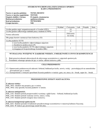 STUDIUM WYCHOWANIA FIZYCZNEGO I SPORTU KARTA PRZEDMIOTU Nazwa w języku polskim: Nazwa w języku angielskim: Stopień studiów i forma: Rodzaj przedmiotu: Kod przedmiotu: Grupa kursów: TENIS ZIEMNY TENNIS II stopień, stacjonarna ogólnouczelniany WFW015052 NIE Wykład Liczba godzin zajęć zorganizowanych w Uczelni (ZZU) Liczba godzin całkowitego nakładu pracy studenta (CNPS) Forma zaliczenia Ćwiczenia 15 15 Zaliczenie na ocenę Lab. Projekt Sem. Dla grupy kursów zaznaczyć kurs końcowy (X) Liczba punktów ECTS w tym liczba punktów odpowiadająca zajęciom o charakterze praktycznym (P) w tym liczba punktów ECTS odpowiadająca zajęciom wymagającym bezpośredniego kontaktu (BK) 1 1 1 WYMAGANIA WSTĘPNE W ZAKRESIE WIEDZY, UMIEJĘTNOŚCI I INNYCH KOMPETENCJI 1. Brak przeciwwskazań zdrowotnych do aktywnego uczestnictwa w zajęciach sportowych. 2. Posiadanie własnego sprzętu do gry w tenisa: rakieta tenisowa, piłki. CELE PRZEDMIOTU C1: Opanowanie podstawowych uderzeń: forhend, bekhend po koźle, serwis, wolej – pozwalających na samodzielne prowadzenie gry w tenisa. C2: Zaznajomienie z różnymi sposobami liczenia punktów w tenisie: gem, set, mecz, tie - break, super tie – break. PRZEDMIOTOWE EFEKTY KSZTAŁCENIA Z zakresu wiedzy: PEK_W01: Student zna przepisy gry w tenisa. PEK_W02: Zna sposoby liczenia punktów w tenisie. Z zakresu umiejętności: PEK_U01: Student potrafi przeprowadzić wymianę z głębi kortu – forhend, bekhend po koźle. PEK_U02: Student potrafi wykonać serwis, smecz, wolej. PEK_U03: Student potrafi rozegrać mecz tenisowy. Z zakresu kompetencji społecznych: PEK_K01: Student posiada świadomość prozdrowotnego uczestnictwa w masowej kulturze fizycznej. PEK_K02: W trakcie gry przestrzega zasad fair play. 1 TREŚCI PROGRAMOWE Forma zajęć - ćwiczenia Ćw. 1 Ćw. 2-4 Ćw. 5 Ćw. 6 Ćw. 7 Ćw. 8 BHP, warunki zaliczenia, dobór sprzętu, ocena umiejętności tenisowych. Nauka i doskonalenie podstawowych elementów technicznych: forhend i backhend po koźle, serwis. Doskonalenie gry przy siatce – wolej forhend i backhend. Doskonalenie gry przy siatce – smecz. Doskonalenie par uderzeń: wymiana z głębi kortu, serwis-return, smecz - lob, wolej – forhend, wolej – bekhend. Wyznaczenie ITN, zaliczenie. Suma godzin Liczba godzin 2 6 2 2 2 1 15 STOSOWANE NARZĘDZIA DYDAKTYCZNE N1. Ćwiczenia praktyczne. N2. Demonstracja prowadzącego (studenta). N3. Pokaz (kinogramy, prezentacje multimedialne). N4. Wykład. OCENA OSIĄGNIĘCIA PRZEDMIOTOWYCH EFEKTÓW KSZTAŁCENIA Oceny: F – formująca (w trakcie semestru), Numer efektu kształcenia Sposób oceny osiągnięcia efektu P – podsumowująca (na koniec semestru) kształcenia F1 PEK_W01, W02 test, odpowiedź ustna F2 PEK_U01, U02, U03 Test ITN P: Frekwencja, aktywność i postawa na zajęciach oraz średnia z ocen F1 i F2. LITERATURA PODSTAWOWA I UZUPEŁNIAJĄCA LITERATURA PODSTAWOWA: [1] Królak A.: Tenis dla dzieci nauczycieli i rodziców. Wydawnictwa szkolne i pedagogiczne. 1999. [2] Królak A.: Technika współczesnego tenisa. Warszawa: 2012. LITERATU RA UZUPEŁNIAJĄCA: [1] Romer A.: Tenis. Wiedza i życie. 2005. OPIEKUN PRZEDMIOTU (IMIĘ, NAZWISKO, ADRES E-MAIL) Jerzy Śliwiński, [email protected] 2 MACIERZ POWIĄZANIA EFEKTÓW KSZTAŁCENIA DLA PRZEDMIOTU TENIS ZIEMNY Przedmiotowy Odniesienie przedmiotowego efektu do efekt efektów kształcenia zdefiniowanych dla kształcenia obszarowych efektów kształcenia Posiada podstawową wiedzę z zakresu wybranej dyscypliny sportu (kursu wf) spośród kilkudziesięciu oferowanych Posiada podstawowe umiejętności z zakresu dyscyplin, którą wybrał, posiada, umiejętność włączenia się w prozdrowotny styl życia z wybraniem aktywności na całe życie oraz kształtowania postaw PEK_U03 sprzyjających całożyciowej aktywności fizycznej. Promuje społeczne i kulturowe znaczenie PEK_K01 (kompetencje) sportu i aktywności fizycznej oraz pielęgnuje własne upodobania z zakresu PEK_K02 kultury fizycznej. ** - z tabel powyżej PEK_W01 (wiedza) PEK_W02 PEK_U01 (umiejętności) PEK_U02 Cele przedmiotu** Treści Numer narzędzia programowe** dydaktycznego** C2 Ćw. 1 - 8 N1, N2, N3, N4 C2 Ćw. 1 - 8 N1, N2, N3, N4 C1 Ćw. 1 - 8 N1, N2, N3 C1 Ćw. 2 - 7 N1, N2, N3 C1, C2 Ćw.1 - 8 N1 C1, C2 Ćw. 1 - 8 N1 C1, C2 Ćw. 1 - 8 N1 3