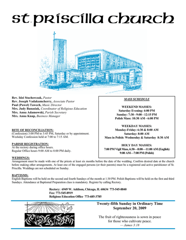 Rev. Idzi Stacherczak, Pastor Rev. Joseph Vadakumcherry, Associate Pastor Paul (Pawel) Tawech, Music Director Mrs. Judy Banasiak, Coordinator of Religious Education Mrs. Anna Adamowski, Parish Secretary Mrs. Anna Knap, Business Manager RITE OF RECONCILIATION: (Confession) 3:00 PM to 3:45 PM, Saturday or by appointment. Weekday Confession held at 7:00 to 7:15 AM. PARISH REGISTRATION: At the rectory during office hours. Regular Office hours 9:00 AM to 8:00 PM daily. MASS SCHEDULE WEEKEND MASSES: Saturday Evening: 4:00 PM Sunday: 7:30 - 9:00 - 12:15 PM Polish Mass: 10:30 AM - 6:00 PM WEEKDAY MASSES: Monday-Friday: 6:30 & 8:00 AM Saturday: 8:00 AM Mass in Polish: Wednesday & Saturday 8:30 AM HOLY DAY MASSES: 7:00 PM Vigil Mass, 6:30—8:00—11:00 AM (English) 9:00 AM—7:00 PM (Polish) WEDDINGS: Arrangement must be made with one of the priests at least six months before the date of the wedding. Confirm desired date at the church before making other arrangements. At least one of the engaged persons (or their parents) must be a registered and active parishioner of St. Priscilla. Weddings are not scheduled on Sunday. BAPTISMS: English Baptisms will be held on the second and fourth Sundays of the month at 1:30 PM. Polish Baptisms will be held on the first and third Sundays. Attendance at Baptismal Preparation class is mandatory. Register by calling Rectory. Rectory: 6949 W. Addison, Chicago, IL 60634 773-545-8840 Fax: 773-545-8919 Religious Education Office 773-685-3785 Twenty-fifth Sunday in Ordinary Time September 20, 2009 The fruit of righteousness is sown in peace for those who cultivate peace. — James 3:18 Page Two September 20, 2009 Spiritual Reflection “I want!” “I have to do everything and s/he doesn’t have to do anything!” “I’m going to be first!” If we have children, these kinds of words can be very disturbing to us. We like them to share what they have with their brothers and sisters. We know that in the long run, they’ll be the happiest when they share. We’re called to set the example for them to follow! How difficult it is for us to succeed in the world. We can find us working longer and harder in order to get the things we consider important. One income sometimes isn’t enough. Sometimes what we want requires two people to work harder than they should. The relationship between husband and wife isn’t given the time and attention that’s needed for it to grow. Children are relegated to babysitters too often and don’t get the attention they need from their parents either. Sometimes, too, we can get more if we’re not entirely honest. Our children can hear of this dishonesty and become involved in our quest for more things to the extent that they see our behavior as the way things need to be done. As we compromise people, even our own family members, to get what we want, they learn to do the same. When we’re deeply involved in our quest to succeed, we really don’t want others to tell us about the values we are compromising. We sometimes discredit those who live more simply and give more time to their children and families. We find that our quest for success doesn’t lead to happiness or fulfillment. Our competitive nature can often lead to conflict, hurt feelings, and broken relationships. In the midst of all this, God speaks. In today’s Gospel, Jesus asks His disciples what they were discussing while they were walking down the road. The disciples didn’t want to tell Jesus because they were ashamed about discussing who was the greatest. The advice Jesus have to His disciples is just as valid for all of us. Jesus said, “If anyone wishes to be first, he shall be the last of all and the servant of all.” Jesus goes on: “Taking a child, He placed it in their midst, and putting His arms around it, He said to them, ‘Whoever receives one child such as this in my name, receives me; and whoever receives me, receives not me but the One who sent me.” The secret to importance, happiness, and peace lies in serving the needs of those around us. It’s no secret that the most important people in our lives are the ones who spend time with us, listen to us, and help us when we need help. The secret to close relationships also leads to the happiness, peace, and importance we’d like to have. It’s rare to see someone near death saying s/he wishes they’d spent more hours working. Our importance lies in the time we’re willing to spend with those we love. It’s not too late. This week we can look at how we spend our time and evaluate whether we devote enough time to those things that are really important. We can look, too, at how often we try to get our own way. We can also look at the example we set for the children around us. If they imitated our aspirations, relationships and work ethic, would they be happy, fulfilled, and important? Have a good week! ©MMIX Father Pat Umberger, www.frpat.com BALI SIĘ GO PYTAĆ Często ludzie przychodzą do Boga, by Go prosić— rzadziej, by Mu dziękować, a jeszcze rzadziej, by Go pytać. Święty Marek w swojej Ewangelii zaznacza, że uczniowie gdy słyszeli niezrozumiałe dla nie wypowiedzi na temat męki, śmierci i zmartwychwstania Chrystusa—bali się Go pytać. Woleli zostać w niewiedzy, niż stawiać pytania Jezusowi. Wiele jest powodów dla których człowiek woli nie pytać Boga. Prawie zawsze jednak w podstaw tych obaw kryje się strach. Nie tyle może w postawieniu pytania, bo to byłoby znakiem niedojrzałości człowieka, ale w usłyszeniu odpowiedzi. Człowiek boi się wskazania trudnej drogi, boi się, by Bóg nie postawił mu wymagań. W takiej sytuacji woli nie wiedzieć. Bowiem odpowiedź człowieka Boga jest wiążąca. Bóg nigdy nie odpowiada człowiekowi: „rób jak chcesz”. On ukazuje człowiekowi w konkretnej sytuacji jedną, jedyną drogę i trzeba się albo na nią zdecydować, albo z niej rezygnować. Odpowiedź Boga jest najczęściej wezwaniem do posłuszeństwa, a tego z reguł