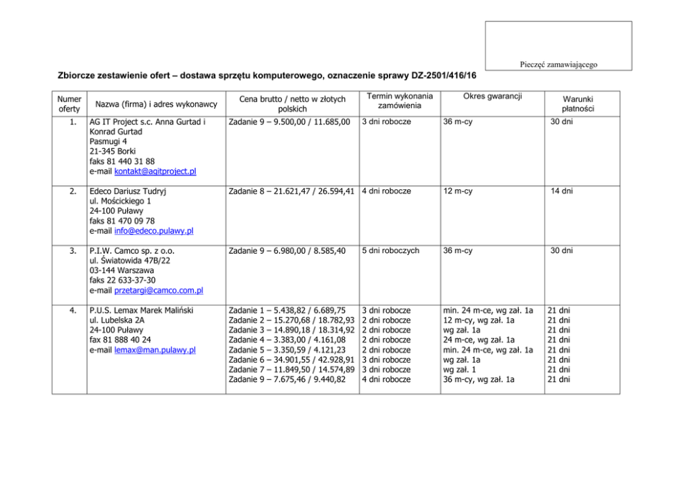 Pieczęć zamawiającego Zbiorcze zestawienie ofert – dostawa sprzętu komputerowego, oznaczenie sprawy DZ-2501/416/16 Numer oferty Nazwa (firma) i adres wykonawcy Termin wykonania zamówienia Cena brutto / netto w złotych polskich Okres gwarancji Warunki płatności 1. AG IT Project s.c. Anna Gurtad i Konrad Gurtad Pasmugi 4 21-345 Borki faks 81 440 31 88 e-mail [email protected] Zadanie 9 – 9.500,00 / 11.685,00 3 dni robocze 36 m-cy 30 dni 2. Edeco Dariusz Tudryj ul. Mościckiego 1 24-100 Puławy faks 81 470 09 78 e-mail [email protected] Zadanie 8 – 21.621,47 / 26.594,41 4 dni robocze 12 m-cy 14 dni 3. P.I.W. Camco sp. z o.o. ul. Światowida 47B/22 03-144 Warszawa faks 22 633-37-30 e-mail [email protected] Zadanie 9 – 6.980,00 / 8.585,40 5 dni roboczych 36 m-cy 30 dni 4. P.U.S. Lemax Marek Maliński ul. Lubelska 2A 24-100 Puławy fax 81 888 40 24 e-mail [email protected] Zadanie Zadanie Zadanie Zadanie Zadanie Zadanie Zadanie Zadanie 3 2 2 2 2 3 3 4 min. 24 m-ce, wg zał. 1a 12 m-cy, wg zał. 1a wg zał. 1a 24 m-ce, wg zał. 1a min. 24 m-ce, wg zał. 1a wg zał. 1a wg zał. 1 36 m-cy, wg zał. 1a 1 2 3 4 5 6 7 9 – – – – – – – – 5.438,82 / 6.689,75 15.270,68 / 18.782,93 14.890,18 / 18.314,92 3.383,00 / 4.161,08 3.350,59 / 4.121,23 34.901,55 / 42.928,91 11.849,50 / 14.574,89 7.675,46 / 9.440,82 dni dni dni dni dni dni dni dni robocze robocze robocze robocze robocze robocze robocze robocze 21 21 21 21 21 21 21 21 dni dni dni dni dni dni dni dni 1 2 3 4 5 6 7 8 9 – – – – – – – – – 5.039,82 / 6.198,98 14.356,50 / 17.658,50 22.197,15 / 27.302,49 3.432,99 / 4.222,58 3.243,10 / 3.989,01 27.203,49 / 33.460,29 11.562,85 / 14.222,31 7.870,63 / 9.680,87 8.044,40 / 9.894,61 2 2 2 2 2 2 2 2 2 dni dni dni dni dni dni dni dni dni robocze robocze robocze robocze robocze robocze robocze robocze robocze 5. Arris Computer Tomasz Stolarek ul. Polna 21 24-100 Puławy fax 081 888 54 42 e-mail [email protected] Zadanie Zadanie Zadanie Zadanie Zadanie Zadanie Zadanie Zadanie Zadanie 6. Koliber ESC s.c. ul. Polna 4 24-100 Puławy faks 81 888 53 02 e-mail [email protected] Zadanie 2 – 15.206,20 / 18.703,63 5 dni roboczych 24 m-ce, monitor 36 m-cy 12 m-cy Poz1-12m-cy, poz2-24m-ce 24 m-ce Zgodny z siwz, min.24 mce zgodny z siwz, min.24 mce zgodny z siwz 12 m-cy 36 m-cy 14 14 14 14 14 14 14 14 14 12 m-cy 7 dni dni dni dni dni dni dni dni dni dni ..................................................... (podpis osoby sporządzającej protokół) ......................................................................... (data i podpis kierownika zamawiającego lub osoby upoważnionej)