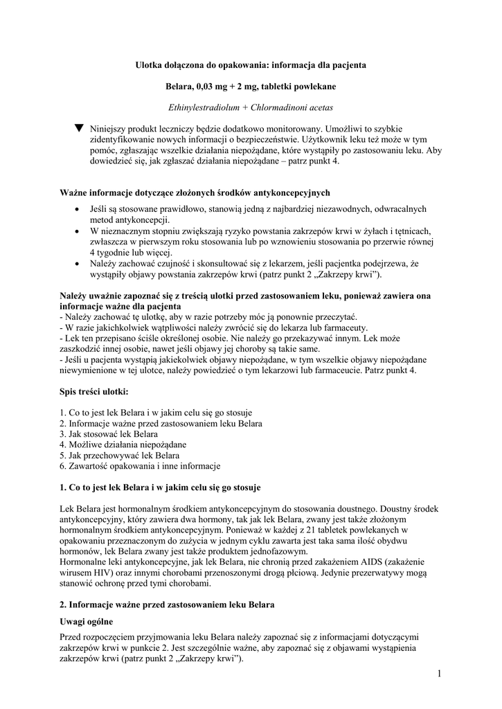 Ulotka dołączona do opakowania: informacja dla pacjenta Belara, 0,03 mg + 2 mg, tabletki powlekane Ethinylestradiolum + Chlormadinoni acetas Niniejszy produkt leczniczy będzie dodatkowo monitorowany. Umożliwi to szybkie zidentyfikowanie nowych informacji o bezpieczeństwie. Użytkownik leku też może w tym pomóc, zgłaszając wszelkie działania niepożądane, które wystąpiły po zastosowaniu leku. Aby dowiedzieć się, jak zgłaszać działania niepożądane – patrz punkt 4. Ważne informacje dotyczące złożonych środków antykoncepcyjnych • • • Jeśli są stosowane prawidłowo, stanowią jedną z najbardziej niezawodnych, odwracalnych metod antykoncepcji. W nieznacznym stopniu zwiększają ryzyko powstania zakrzepów krwi w żyłach i tętnicach, zwłaszcza w pierwszym roku stosowania lub po wznowieniu stosowania po przerwie równej 4 tygodnie lub więcej. Należy zachować czujność i skonsultować się z lekarzem, jeśli pacjentka podejrzewa, że wystąpiły objawy powstania zakrzepów krwi (patrz punkt 2 „Zakrzepy krwi”). Należy uważnie zapoznać się z treścią ulotki przed zastosowaniem leku, ponieważ zawiera ona informacje ważne dla pacjenta - Należy zachować tę ulotkę, aby w razie potrzeby móc ją ponownie przeczytać. - W razie jakichkolwiek wątpliwości należy zwrócić się do lekarza lub farmaceuty. - Lek ten przepisano ściśle określonej osobie. Nie należy go przekazywać innym. Lek może zaszkodzić innej osobie, nawet jeśli objawy jej choroby są takie same. - Jeśli u pacjenta wystąpią jakiekolwiek objawy niepożądane, w tym wszelkie objawy niepożądane niewymienione w tej ulotce, należy powiedzieć o tym lekarzowi lub farmaceucie. Patrz punkt 4. Spis treści ulotki: 1. Co to jest lek Belara i w jakim celu się go stosuje 2. Informacje ważne przed zastosowaniem leku Belara 3. Jak stosować lek Belara 4. Możliwe działania niepożądane 5. Jak przechowywać lek Belara 6. Zawartość opakowania i inne informacje 1. Co to jest lek Belara i w jakim celu się go stosuje Lek Belara jest hormonalnym środkiem antykoncepcyjnym do stosowania doustnego. Doustny środek antykoncepcyjny, który zawiera dwa hormony, tak jak lek Belara, zwany jest także złożonym hormonalnym środkiem antykoncepcyjnym. Ponieważ w każdej z 21 tabletek powlekanych w opakowaniu przeznaczonym do zużycia w jednym cyklu zawarta jest taka sama ilość obydwu hormonów, lek Belara zwany jest także produktem jednofazowym. Hormonalne leki antykoncepcyjne, jak lek Belara, nie chronią przed zakażeniem AIDS (zakażenie wirusem HIV) oraz innymi chorobami przenoszonymi drogą płciową. Jedynie prezerwatywy mogą stanowić ochronę przed tymi chorobami. 2. Informacje ważne przed zastosowaniem leku Belara Uwagi ogólne Przed rozpoczęciem przyjmowania leku Belara należy zapoznać się z informacjami dotyczącymi zakrzepów krwi w punkcie 2. Jest szczególnie ważne, aby zapoznać się z objawami wystąpienia zakrzepów krwi (patrz punkt 2 „Zakrzepy krwi”). 1 Przed rozpoczęciem stosowania leku Belara lekarz przeprowadzi u pacjentki dokładne badanie ogólne i ginekologiczne, wykluczy ciążę i zdecyduje, mając na uwadze przeciwwskazania i środki ostrożności, czy pacjentka może przyjmować lek Belara. W trakcie stosowania leku Belara takie badanie należy powtarzać raz w roku. Kiedy nie stosować leku Belara Nie należy stosować leku Belara, jeśli u pacjentki występuje jakikolwiek z wymienionych poniżej stanów. Jeśli u pacjentki występuje jakikolwiek z wymienionych poniżej stanów, należy poinformować o tym lekarza. Lekarz omówi z pacjentką, jaki inny środek zapobiegania ciąży będzie bardziej odpowiedni. - jeśli pacjentka ma uczulenie (nadwrażliwość) na etynyloestradiol lub chlormadynonu octan lub którykolwiek z pozostałych składników tego leku (wymienionych w punkcie 6); - jeśli u pacjentki obecnie występuje (lub kiedykolwiek występował) zakrzep krwi w naczyniach żylnych nóg (zakrzepica żył głębokich), w płucach (zatorowość płucna) lub w innych organach; - jeśli u pacjentki występują zapowiadające lub początkowe objawy zakrzepów krwi, zapalenia żył lub zatoru, takie jak przejściowe kłucie, ból lub uczucie ucisku w klatce piersiowej; - jeśli pacjentka wymaga zabiegu chirurgicznego lub nie będzie chodziła przez długi czas (patrz punkt „Zakrzepy krwi”); - jeśli pacjentka wie, że ma zaburzenia wpływające na krzepliwość krwi - na przykład niedobór białka C, niedobór białka S, niedobór antytrombiny III, obecność czynnika V Leiden lub przeciwciał antyfosfolipidowych; - jeśli pacjentka przeszła zawał serca lub udar; - jeśli pacjentka choruje (lub chorowała w przeszłości) na dławicę piersiową (choroba, która powoduje silny ból w klatce piersiowej i może być pierwszym objawem zawału serca) lub przemijający napad niedokrwienny (przemijające objawy udaru); - jeśli pacjentka choruje na jakąkolwiek z poniższych chorób, które mogą zwiększać ryzyko powstania zakrzepu w tętnicy: - ciężka cukrzyca z uszkodzeniem naczyń krwionośnych, - bardzo wysokie ciśnienie krwi, - bardzo wysokie stężenie tłuszczów we krwi (cholesterolu lub triglicerydów), - chorobę nazywaną hiperhomocysteinemią - jeśli u pacjentki występuje (lub występował w przeszłości) rodzaj migreny nazywany „migreną z aurą”; - jeśli pacjentka ma zapalenie wątroby (np. wirusowe) lub żółtaczkę, a wyniki testów czynnościowych wątroby nie powróciły do wartości prawidłowych; - jeśli pacjentka ma świąd całego ciała lub zaburzenia odpływu żółci, szczególnie, jeśli takie zaburzenia wystąpiły podczas wcześniejszej ciąży lub podczas leczenia estrogenami; - jeśli pacjentka ma zwiększone stężenie bilirubiny (produkt rozpadu barwnika krwi) we krwi, np. z powodu wrodzonych zaburzeń wydalania bilirubiny (zespół Dubin-Johnsona lub zespół Rotora); - jeśli pacjentka ma 