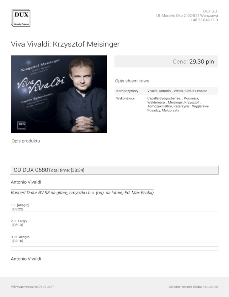 DUX S.J. Ul. Morskie Oko 2, 02-511 Warszawa +48 22 849 11 3 Viva Vivaldi: Krzysztof Meisinger Cena: 29,30 pln Opis słownikowy Kompozytorzy Vivaldi, Antonio ∎, Weiss, Silvius Leopold ∎ Wykonawcy Capella Bydgostiensis ∎, Kośmieja, Waldemara ∎, Meisinger, Krzysztof ∎, Tomczak-Feltrin, Katarzyna ∎, WęglerskaPosadzy, Małgorzata ∎ Opis produktu CD DUX 0680Total time: [38:34] Antonio Vivaldi Koncert D-dur RV 93 na gitarę, smyczki i b.c. (org. na lutnię) Ed. Max Eschig 1. I. [Allegro] [03:22] 2. II. Largo [06:13] 3. III. Allegro [02:16] Antonio Vivaldi Plik wygenerowano: 09-03-2017 Oprogramowanie sklepu: AptusShop DUX S.J. Ul. Morskie Oko 2, 02-511 Warszawa +48 22 849 11 3 Trio A-dur RV 82 na skrzypce, gitarę i b.c. (org. na lutnię i C-dur) Ed. Max Eschig 4. I. Allegro non molto [03:43] 5. II. Larghetto [03:19] 6. III. Allegro [02:02] Antonio Vivaldi Koncert C-dur RV 425 („…con tutti il violini pizzicati”) na gitarę, smyczki i b.c. (org. na mandolinę). Ed. Ricordi 7. I. Allegro [03:00] 8. II. Largo [02:53] 9. III. [Allegro] [02:06] Silvius Leopold Weiss Koncert d-moll na gitarę, smyczki i b.c. (org. na lutnię i c-moll). Ed. Chanterelle / Alice Artzt – Gary Schneider 10. I. Grave – Allegro – Adagio [03:11] 11. II. Presto [02:24] 12. III. Adagio [02:26] 13. IV. Vivace [01:33] Wykonawcy: Plik wygenerowano: 09-03-2017 Oprogramowanie sklepu: AptusShop DUX S.J. Ul. Morskie Oko 2, 02-511 Warszawa +48 22 849 11 3 Capella Bydgostiensis Katarzyna Tomczak-Feltrin /basso continuo (klawesyn)/ Krzysztof Meisinger /dyrygent/ Krzysztof Meisinger /gitara/ Małgorzata Węglerska-Posadzy /basso continuo (wiolonczela)/ Waldemara Kośmieja /skrzypce solo/ Plik wygenerowano: 09-03-2017 Powered by TCPDF (www.tcpdf.org) Oprogramowanie sklepu: AptusShop