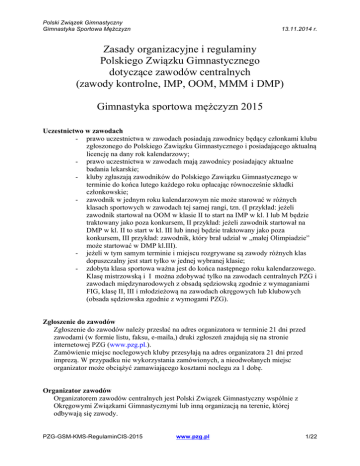 Polski Związek Gimnastyczny Gimnastyka Sportowa Mężczyzn 13.11.2014 r. Zasady organizacyjne i regulaminy Polskiego Związku Gimnastycznego dotyczące zawodów centralnych (zawody kontrolne, IMP, OOM, MMM i DMP) Gimnastyka sportowa mężczyzn 2015 Uczestnictwo w zawodach - prawo uczestnictwa w zawodach posiadają zawodnicy będący członkami klubu zgłoszonego do Polskiego Zawiązku Gimnastycznego i posiadającego aktualną licencję na dany rok kalendarzowy; - prawo uczestnictwa w zawodach mają zawodnicy posiadający aktualne badania lekarskie; - kluby zgłaszają zawodników do Polskiego Zawiązku Gimnastycznego w terminie do końca lutego każdego roku opłacając równocześnie składki członkowskie; - zawodnik w jednym roku kalendarzowym nie może starować w różnych klasach sportowych w zawodach tej samej rangi, tzn. (I przykład: jeżeli zawodnik startował na OOM w klasie II to start na IMP w kl. I lub M będzie traktowany jako poza konkursem, II przykład: jeżeli zawodnik startował na DMP w kl. II to start w kl. III lub innej będzie traktowany jako poza konkursem, III przykład: zawodnik, który brał udział w „małej Olimpiadzie” może startować w DMP kl.III). - jeżeli w tym samym terminie i miejscu rozgrywane są zawody różnych klas dopuszczalny jest start tylko w jednej wybranej klasie; - zdobyta klasa sportowa ważna jest do końca następnego roku kalendarzowego. Klasę mistrzowską i I można zdobywać tylko na zawodach centralnych PZG i zawodach międzynarodowych z obsadą sędziowską zgodnie z wymaganiami FIG, klasę II, III i młodzieżową na zawodach okręgowych lub klubowych (obsada sędziowska zgodnie z wymogami PZG). Zgłoszenie do zawodów Zgłoszenie do zawodów należy przesłać na adres organizatora w terminie 21 dni przed zawodami (w formie listu, faksu, e-maila,) druki zgłoszeń znajdują się na stronie internetowej PZG (www.pzg.pl.). Zamówienie miejsc noclegowych kluby przesyłają na adres organizatora 21 dni przed imprezą. W przypadku nie wykorzystania zamówionych, a nieodwołanych miejsc organizator może obciążyć zamawiającego kosztami noclegu za 1 dobę. Organizator zawodów Organizatorem zawodów centralnych jest Polski Związek Gimnastyczny wspólnie z Okręgowymi Związkami Gimnastycznymi lub inną organizacją na terenie, której odbywają się zawody. PZG-GSM-KMS-RegulaminCIS-2015 www.pzg.pl 1/22 Polski Związek Gimnastyczny Gimnastyka Sportowa Mężczyzn 13.11.2014 r. Termin i miejsce Termin i miejsce określane są zgodnie z kalendarzem imprez PZG na dany rok kalendarzowy. W wyjątkowych sytuacjach, nieprzewidywalnych możliwa jest zmiana miejsca imprezy sportowej na 14 dni przed jej organizacją. Program zawodów Program zawodów jest zgodny z wytycznymi Komisji Metodyczno - Szkoleniowej zatwierdzony przez Zarząd Sekcji Męskiej PZG. O istotnych zmianach kluby informowane będą na bieżąco na stronie internetowej PZG - dział KMS (www.pzg.pl.). Program i wymagania na rok 2015: - zawody kontrolne i eliminacyjne w klasach mł., III, II, rozgrywane są wg wymagań PZG oraz klasa I i M wg wymagań FIG. - Indywidualne i Drużynowe Mistrzostwa Polski wg wymagań wielobojowych w poszczególnych klasach. Finał: wg wymagań finałowych w poszczególnych klasach. Międzywojewódzkie Mistrzostwa Młodzików klasa mł. - zawodnik ma prawo startu w dwóch finałach Ogólnopolska Olimpiada Młodzieży klasa III - zawodnik ma prawo startu w dwóch finałach klasa II - zawodnik ma prawo startu w dwóch finałach Puchary Polski, zawody kontrolne Kadry(eliminacje do OOM), Drużynowe Mistrzostwa Polski Zawodnicy startują w wieloboju gimnastycznym. Indywidualne Mistrzostwa Polski klasa I - zawodnik ma prawo startu w trzech finałach klasa Młodzieżowiec - zawodnik ma prawo startu w sześciu finałach klasa M - zawodnik ma prawo startu w sześciu finałach. Seniorzy I. Konsultacje startowe „PUCHAR POLSKI” (I edycja) W GIMNASTYCE SPORTOWEJ MĘŻCZYZN, (zawody kontrolne kadry seniorów) I edycja. Cel zawodów: - sklasyfikowanie zawodników, - sprawdzian opanowania układów, - ocena postępów zawodników, - podstawa do wytypowani zawodników na zawody międzynarodowe. Termin zawodów: 7-8.03.2015 Organizator zawodów: PZG, NTG Nysa Program zawodów: • układy dowolne w kl. M (wg Regulaminu PZG). Warunki uczestnictwa: • obowiązek startu mają zawodnicy Kadry seniorów. Sposób wyłaniania zwycięzców: PZG-GSM-KMS-RegulaminCIS-2015 www.pzg.pl 2/22 Polski Związek Gimnastyczny Gimnastyka Sportowa Mężczyzn • 13.11.2014 r. zwycięzcom zostaje zawodnik, który w wieloboju uzyska największą ilość punktów w kl. M. II. Konsultacje startowe „PUCHAR POLSKI” (II edycja) W GIMNASTYCE SPORTOWEJ MĘŻCZYZN (zawody kontrolne kadry seniorów) II edycja. Termin zawodów: 25-26.04.2015 Organizator zawodów: PZG, NTG Nysa . Pozostałe punkty jak w I edycji. III. Konsultacje startowe „PUCHAR POLSKI” (III edycja) W GIMNASTYCE SPORTOWEJ MĘŻCZYZN (zawody kontrolne kadry seniorów) III edycja. Termin zawodów: 22-24.05.2015 Organizator zawodów: PZG, NTG Nysa . Pozostałe punkty jak w I edycji IV. Konsultacje startowe „PUCHAR POLSKI” (IV edycja) W GIMNASTYCE SPORTOWEJ MĘŻCZYZ (zawody kontrolne kadry seniorów) IV edycja. Termin zawodów: 30.05-1.06.2015 Organizator zawodów: PZG, ?. Pozostałe punkty jak w I edycji. V. Konsultacje startowe „PUCHAR POLSKI” (IV edycja) W GIMNASTYCE SPORTOWEJ MĘŻCZYZ (zawody kontrolne kadry seniorów) IV edycja. Termin zawodów: 20-22.11.2015 Organizator zawodów: PZG, ?. Pozostałe punkty jak w I edycji. Sposób wyłaniania zwycięzców: • zwycięzcom Pucharu Polski w klasie M zostaje zawodnik, który na zawodach krajowych w IV edycjach uzyskał największą ilość punktów wg poniższego klucza: 1 miejsce - 150 pkt. 2 miejsce - 125 pkt. 3 miejsce - 100 pkt. 4 miejsce - 70 pkt. 5 miejsce - 60 pkt. 6 miejsce - 50 pkt. 7 miejsce - 40 pkt. 8 miejsce - 30 pkt. Puchary i dyplomy: PZG-GS