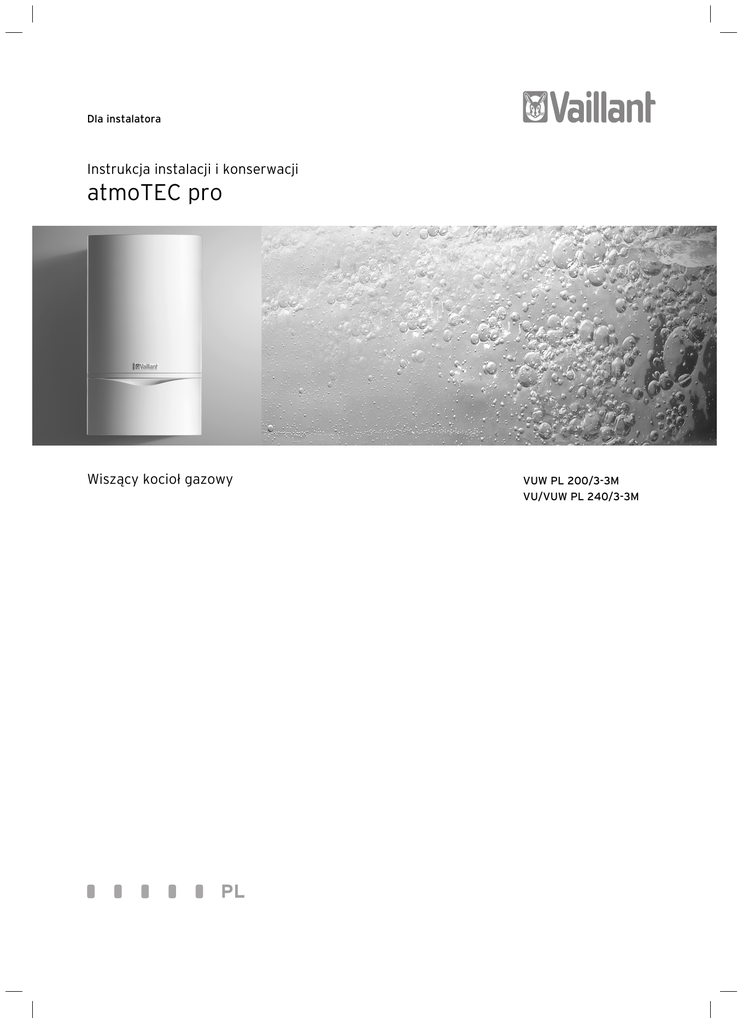 Dla instalatora Instrukcja instalacji i konserwacji atmoTEC pro Wiszący kocioł gazowy PL VUW PL 200/3-3M VU/VUW PL 240/3-3M Spis treści 1 1.1 1.2 Wskazówki dotyczące dokumentacji .............. 3 Przechowywanie dokumentacji ............................. 3 Wskazówki bezpieczeństwa i symbole................. 3 2 2.1 2.2 2.3 2.4 2.5 Opis urządzenia................................................. Budowa ........................................................................ Oznaczenie CE ........................................................... Przeznaczenie ............................................................ Tabliczka znamionowa i oznakowanie typów .... Przegląd typów .......................................................... 3 3 4 4 4 4 3 3.1 3.1.1 3.1.2 3.1.3 3.1.4 Zasady i przepisy bezpieczeństwa................. Zasady dotyczące bezpieczeństwa ...................... Zainstalowanie i demontaż..................................... Ulatnianie się gazu.................................................... Zmiany w otoczeniu urządzenia grzewczego .... Ważne wskazówki dotyczące urządzeń na propan .......................................................................... 5 5 5 5 5 Montaż................................................................ Zakres dostawy ......................................................... Wyposażenie dodatkowe ......................................... Rysunek z wymiarami i wymiary przyłączowe .. Miejsce ustawienia urządzenia .............................. Wymagane minimalne odstępy / wymagania przestrzenne .............................................................. Szablon montażowy ................................................. Zawieszanie urządzenia .......................................... Demontaż/montaż obudowy kotła ....................... 7 7 7 8 8 4 4.1 4.2 4.3 4.4 4.5 4.6 4.7 4.8 5 5.1 5.2 5.3 5.3.1 5.3.2 5.4 5.5 5.6 5.6.1 5.6.2 5.6.3 6 6.1 6.1.1 6.1.2 Instalacja ........................................................... Ogólne wskazówki dotyczące instalacji grzewczej .................................................................... Przyłącze gazowe ..................................................... Przyłącze wody użytkowej...................................... Przyłącze ciepłej wody (tylko dla VUW) .............. Podłączanie zasobnika (tylko dla VU).................. Podłączanie do instalacji grzewczej ..................... Odprowadzanie spalin .............................................. Przyłącze elektryczne .............................................. Podłączanie do sieci ................................................. Podłączenie regulatorów, osprzętu oraz komponentów zewnętrznych instalacji ............... Schemat okablowania .............................................. Uruchamianie .................................................... Napełnianie instalacji ............................................... Przygotowywanie wody grzewczej ....................... Napełnianie instalacji ciepłej wody użytkowej i odpowietrzanie .................................... 6.1.3 Napełnianie wodą i odpowietrzanie instalacji grzewczej .................................................................... 6.2 Kontrola ustawienia gazu ....................................... 6.2.1 Kontrola ciśnienia przyłączeniowego (ciśnienie gazu).......................................................... 6.2.2 Kontrola mocy maksymalnej (obciążenie znamionowe)........................................ 6.2.3 Kontrola i nastawianie mocy mininalnej ............. 6.2.4 Wartości nastawcze gazu i usuwanie błędów .... 2 5 9 9 10 10 11 11 11 12 12 12 12 13 13 13 13 15 17 17 17 6.3 Kontrola działania urządzenia ............................... 6.3.1 Ogrzewanie ................................................................. 6.3.2 Przygotowywanie ciepłej wody (tylko dla VUW) .......................................................... 6.3.3 Tryb zasobnika (tylko dla VU)................................ 6.4 Informacje dla użytkownika ................................... 6.5 Gwarancja ................................................................... 7 7.1 7.2 7.2.1 7.2.2 7.2.3 7.2.4 7.2.5 7.2.6 7.2.7 7.3 7.4 8 8.1 8.2 8.3 8.4 21 21 21 22 22 22 Dopasowanie do instalacji grzewczej ............. 23 Wybór i nastawianie parametrów ......................... 23 Zestawienie zmiennych parametrów instalacji . 24 Nastawianie częściowego obciążenia cieplnego 24 Nastawianie czasu wybiegu pompy ...................... 24 Ustawianie maksymalnej temperatury zasilania ....................................................................... 24 Ustawianie regulacji temperatury powrotnej .... 24 Nastawianie czasu blokady palnika ...................... 25 Ustawianie okresu pracy kotła do przeglądu..... 25 Nastawianie wydajności pompy ............................ 26 Nastawianie zaworu nadmiarowego .................... 26 Przestawianie gazu................................................... 26 8.5 8.6 8.8 Przegląd i konserwacja .................................... 27 Przeglądy i konserwacje.......................................... 27 Wskazówki dotyczące bezpieczeństwa ............... 27 Przegląd prac konserwacyjnych............................ 28 Oczyszczanie palnika i pierwotnego wymiennika ciepła ..................................................... 29 Kontrola działania czujnika ciągu kominowego 30 Wymiana płyty elektronicznej i wyświetlacza.... 30 Praca próbna .............................................................. 31 9 9.1 9.1.1 9.1.2 9.1.3 9.1.4 9.2 9.3 Usuwanie zakłóceń ........................................... 32 Diagnostyka ................................................................ 32 Kody stanu .................................................................. 32 Kody diagnostyczne ................................................. 33 Kody błędów ..................