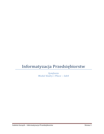 Informatyzacja Przedsiębiorstw Symfonia Moduł Kadry i Płace – lab4 Izabela Szczęch – Informatyzacja Przedsiębiorstw Strona 1 Plan zajęć 1 Zakładanie nowej firmy w module Kadry i Płace............................................................................. 3 2 Otwarcie istniejącej już firmy .......................................................................................................... 4 3 Dostosowanie ustawień modułu ..................................................................................................... 5 3.1 Definiowanie drukarki i krojów pisma..................................................................................... 5 3.2 Definiowanie użytkowników modułu KP ................................................................................. 6 3.3 Zapoznanie się z zawartością kartotek .................................................................................... 6 4 Dodanie początkowego okresu płacowego (luty 2017) .................................................................. 7 5 Zatrudnianie pracowników na umowę o pracę............................................................................... 8 6 5.1 Dane personalne ..................................................................................................................... 8 5.2 Kalendarz ................................................................................................................................. 9 5.3 Zdarzenia ............................................................................................................................... 10 Wynagrodzenia.............................................................................................................................. 12 6.1 Ustawianie parametrów obliczania wynagrodzenia ............................................................. 12 6.2 Obliczanie wynagrodzenia ..................................................................................................... 14 6.3 Wynagrodzenie przy kwocie brutto 4 000 zł ......................................................................... 14 7 Weryfikacja obliczonego wynagrodzenia ...................................................................................... 14 8 Zamykanie okresu płacowego ....................................................................................................... 15 Izabela Szczęch – Informatyzacja Przedsiębiorstw Strona 2 1 Zakładanie nowej firmy w module Kadry i Płace Nazwa pełna firmy – Nazwiska osób w grupie, NIP - format: xxx-xxx-xx-xx, Po wypełnieniu danych firmy i utworzeniu firmy, należy otworzyć założoną firmę jako Admin, nie podając żadnego hasła. Izabela Szczęch – Informatyzacja Przedsiębiorstw Strona 3 2 Otwarcie istniejącej już firmy Firmę można wybrać z listy. Jeśli nie ma szukanej firmy na liście, wciśnij Anuluj, a następnie z menu głównego wybierz Dołącz i wybierz ścieżkę do katalogu z danymi firmy, co spowoduje pojawienie się firmy na liście. Izabela Szczęch – Informatyzacja Przedsiębiorstw Strona 4 3 Dostosowanie ustawień modułu Zapoznaj się z Ustawieniami i Kartotekami modułu Kadry i Płace 3.1 Definiowanie drukarki i krojów pisma Izabela Szczęch – Informatyzacja Przedsiębiorstw Strona 5 3.2 Definiowanie użytkowników modułu KP 3.3 Zapoznanie się z zawartością kartotek Izabela Szczęch – Informatyzacja Przedsiębiorstw Strona 6 4 Dodanie początkowego okresu płacowego (luty 2017) Dodaj początkowy okres płacowego (luty 2017). Izabela Szczęch – Informatyzacja Przedsiębiorstw Strona 7 5 Zatrudnianie pracowników na umowę o pracę 5.1 Dane personalne Otwórz katalog pracowników. Dodaj nowego pracownika i wprowadź jego wymyślone dane personalne. Zapisz wprowadzone dane. Izabela Szczęch – Informatyzacja Przedsiębiorstw Strona 8 5.2 Kalendarz Dla nowo-wprowadzonego pracownika, na zakładce Kalendarz zainicjuj kalendarz. Kalendarz ma być zainicjalizowany w okresie od 01.02.2017 do 30.06.2017. Ustawić tygodniowy wzorzec czasu pracy: Tydzień z wolną sobotą, począwszy od poniedziałku. Izabela Szczęch – Informatyzacja Przedsiębiorstw Strona 9 5.3 Zdarzenia Na kalendarzu pracownika na 01.02.2017 wstaw zdarzenie: "Stosunek pracy" "Przyjęcie do pracy" "Wynagrodzenie zasadnicze" "Przyjęcie do pracy na czas określony" w okresie 01.02.2017 do 30.06.2017. Na zakładce „Akcje” zmień „Płatność przelewem” na „Płatność gotówką”. Uwaga techniczna: może być potrzeba skorzystania z opcji „Ukryj akcje nieaktywne”. Izabela Szczęch – Informatyzacja Przedsiębiorstw Strona 10 Zatwierdź zdarzenia zapisane w analizowanym okresie uzupełniając odpowiednie dane, np.: o wysokość wynagrodzenia brutto: 4 000PLN o stanowisko (np.: Informatyk) o rodzaj pracy : Pracownik umysłowy Uwaga: W trakcie wykonywania akcji zdarzeń z kalendarza pracownika na ekranie pojawią się dokumenty wystawiane w trakcie zatrudnienia np.: umowa o pracę. Dokumenty dotyczące pracowników można drukować również w dowolnym momencie, wybierając pracownika z katalogu pracowników, wciskając przycisk drukarki i wyświetlając odpowiedni raport. Izabela Szczęch – Informatyzacja Przedsiębiorstw Strona 11 6 Wynagrodzenia 6.1 Ustawianie parametrów obliczania wynagrodzenia Do obliczenia wynagrodzenia niezbędne będzie wprowadzenie ustawień np. dotyczących aktualnych progów podatkowych, czy wysokości składek. Wprowadzenia tych ustawień dokonuje się z menu Firma na zakładce "Dane kadrowe": • • • pole Zestawy Zestawy danych kadrowych pole Zestawy Zestawy danych kadrowych (ustawowe), pole Zestawy Zestawy danych kadrowych ZUS Parametry ZUS (ustawowe), Podatki Parametry podatkowe Wynagrodzenia-> Parametry wynagrodzeń. Dodajemy okresy obowiązywania danych (na cały aktualny rok) i dane. Jeśli obecna data mieści się w którymś z okresów, to na zakładce "wartości" zobaczymy aktualną