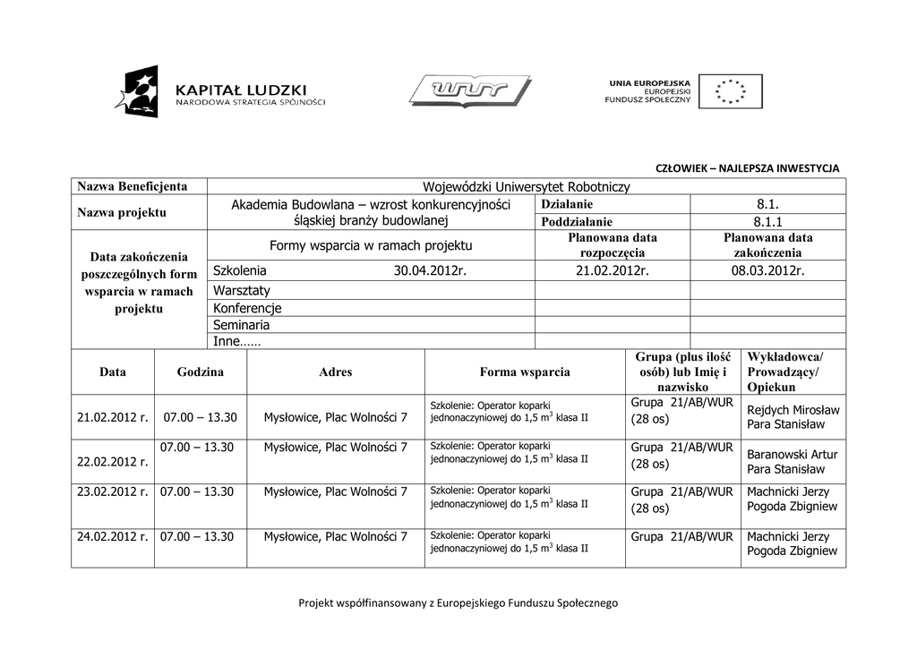 CZŁOWIEK – NAJLEPSZA INWESTYCJA Nazwa Beneficjenta Nazwa projektu Data zakończenia poszczególnych form wsparcia w ramach projektu Wojewódzki Uniwersytet Robotniczy Działanie Akademia Budowlana – wzrost konkurencyjności śląskiej branży budowlanej Poddziałanie Planowana data Formy wsparcia w ramach projektu rozpoczęcia Szkolenia 30.04.2012r. 21.02.2012r. 8.1. 8.1.1 Planowana data zakończenia 08.03.2012r. Warsztaty Konferencje Seminaria Inne…… Data Godzina Adres 21.02.2012 r. 07.00 – 13.30 Mysłowice, Plac Wolności 7 07.00 – 13.30 Forma wsparcia Grupa (plus ilość osób) lub Imię i nazwisko Wykładowca/ Prowadzący/ Opiekun Szkolenie: Operator koparki jednonaczyniowej do 1,5 m3 klasa II Grupa 21/AB/WUR (28 os) Rejdych Mirosław Para Stanisław Mysłowice, Plac Wolności 7 Szkolenie: Operator koparki jednonaczyniowej do 1,5 m3 klasa II Grupa 21/AB/WUR (28 os) Baranowski Artur Para Stanisław 23.02.2012 r. 07.00 – 13.30 Mysłowice, Plac Wolności 7 Szkolenie: Operator koparki jednonaczyniowej do 1,5 m3 klasa II Grupa 21/AB/WUR (28 os) Machnicki Jerzy Pogoda Zbigniew 24.02.2012 r. 07.00 – 13.30 Mysłowice, Plac Wolności 7 Szkolenie: Operator koparki jednonaczyniowej do 1,5 m3 klasa II Grupa 21/AB/WUR Machnicki Jerzy Pogoda Zbigniew 22.02.2012 r. Projekt współfinansowany z Europejskiego Funduszu Społecznego (28 os) 27.02.2012 r. 07.00 – 13.30 Mysłowice, Plac Wolności 7 Szkolenie: Operator koparki jednonaczyniowej do 1,5 m3 klasa II Grupa 21/AB/WUR (28 os) Para Stanisław Machnicki Jerzy 28.02.2012 r. 07.00 – 13.30 Mysłowice, Plac Wolności 7 Szkolenie: Operator koparki jednonaczyniowej do 1,5 m3 klasa II Grupa 21/AB/WUR (28 os) Para Stanisław Machnicki Jerzy 29.02.2012 r. 07.00 – 13.30 Mysłowice, Plac Wolności 7 Szkolenie: Operator koparki jednonaczyniowej do 1,5 m3 klasa II Grupa 21/AB/WUR (28 os) Baranowski Artur Para Stanisław 01.03.2012 r. 07.00 – 13.30 Mysłowice, Plac Wolności 7 Szkolenie: Operator koparki jednonaczyniowej do 1,5 m3 klasa II Grupa 21/AB/WUR (28 os) Baranowski Artur Para Stanisław 02.03.2012 r. 07.00 – 13.30 Mysłowice, Plac Wolności 7 Szkolenie: Operator koparki jednonaczyniowej do 1,5 m3 klasa II Grupa 21/AB/WUR (28 os) Rejdych Mirosław Machnicki Jerzy 05.03.2012 r. 8 godzin Zajęcia doskonalące w firmie, z której został oddelegowany pracownik na szkolenie * Szkolenie: Operator koparki jednonaczyniowej do 1,5 m3 klasa II Grupa 21/AB/WUR (28 os) Opiekun w firmie 06.03.2012 r. 8 godzin Zajęcia doskonalące w firmie, z której został oddelegowany pracownik na szkolenie * Szkolenie: Operator koparki jednonaczyniowej do 1,5 m3 klasa II Grupa 21/AB/WUR (28 os) Opiekun w firmie 07.03.2012 r. 8 godzin Zajęcia doskonalące w firmie, z której został oddelegowany pracownik na szkolenie * Szkolenie: Operator koparki jednonaczyniowej do 1,5 m3 klasa II Grupa 21/AB/WUR (28 os) Opiekun w firmie Projekt współfinansowany z Europejskiego Funduszu Społecznego 08.03.2012 r. 4 godzin Zajęcia doskonalące w firmie, z której został oddelegowany pracownik na szkolenie * Szkolenie: Operator koparki jednonaczyniowej do 1,5 m3 klasa II * Adresy poszczególnych firm prześlemy w osobnym e-mailu po uzgodnieniu z uczestnikami szkolenia. Projekt współfinansowany z Europejskiego Funduszu Społecznego Grupa 21/AB/WUR (28 os) Opiekun w firmie