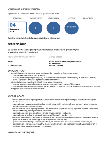 Urząd Kontroli Skarbowej w Gdańsku Ogłoszenie o naborze nr 4824 z dnia 22 października 2016 r. OFERTY DO WYMIAR ETATU STANOWISKA 1 2 04 listopada 2016 STATUS DODATKOWE archiwalny Dyrektor poszukuje kandydatów\kandydatek na stanowisko: referendarz do spraw: prowadzenia postępowań kontrolnych oraz kontroli podatkowych w Wydziale Kontroli Podatkowej MIEJSCE WYKONYWANIA PRACY: ADRES URZĘDU: Słupsk Urząd Kontroli Skarbowej w Gdańsku Ul. Chłopska 3 80 – 362 Gdańsk ul. Poznańska 42 WARUNKI PRACY warunki dotyczące charakteru pracy na stanowisku i sposobu wykonywania zadań: • praca w siedzibie urzędu oraz w terenie; • w razie potrzeby wykonywanie pracy w godzinach nadliczbowych (także w nocy, w niedziele i święta); • stres i zagrożenia związane z przeprowadzaniem kontroli. miejsce i otoczenie organizacyjno-techniczne stanowiska pracy: • praca z wykorzystaniem komputera przenośnego oraz innych urządzeń biurowych; • podczas pracy w terenie pracodawca nie ma wpływu na warunki pracy w miejscu przeprowadzania kontroli (mogą wystąpić bariery architektoniczne). ZAKRES ZADAŃ współuczestniczenie w postępowaniach kontrolnych i kontrolach podatkowych z upoważnienia organu kontroli skarbowej. sporządzanie i przygotowywanie dokumentacji z czynności kontrolnych oraz opracowywanie projektów postanowień i innych dokumentów; współuczestniczenie w przygotowaniu i opracowywaniu projektów decyzji, wyników kontroli, do wydania których właściwy jest organ kontroli skarbowe; sporządzanie pism oraz projektów pism do innych organów i instytucji; sporządzanie wniosków o wszczęcie postępowań karnych – skarbowych; wspomaganie inspektora kontroli skarbowej w trakcie kontroli prawidłowości ewidencjonowania obrotów przy zastosowaniu kas rejestrujących (postępowania mandatowe); prowadzenie monitoringu zaleceń pokontrolnych, analizowanie stanu rozpatrzenia skierowanych zawiadomień o naruszeniu dyscypliny finansów publicznych oraz przekazanych not sygnalizacyjnych w odniesieniu do przeprowadzonych postępowań. WYMAGANIA NIEZBĘDNE Wykształcenie: średnie znajomość przepisów podatkowych, umiejętność analitycznego myślenia, umiejętność pracy w zespole, komunikatywność, dobra organizacja pracy, umiejętność obsługi komputera, umiejętność działania w sytuacjach stresowych, motywacja do podnoszenia kwalifikacji oraz rozwoju kariery zawodowej w Urzędzie. Posiadanie obywatelstwa polskiego Korzystanie z pełni praw publicznych Nieskazanie prawomocnym wyrokiem za umyślne przestępstwo lub umyślne przestępstwo skarbowe WYMAGANIA DODATKOWE Wykształcenie: wyższe doświadczenie zawodowe: 2 lata w organach administracji podatkowej lub skarbowej DOKUMENTY I OŚWIADCZENIA NIEZBĘDNE Życiorys/CV i list motywacyjny Kopie dokumentów potwierdzających spełnienie wymagania niezbędnego w zakresie wykształcenia Oświadczenie o posiadaniu obywatelstwa polskiego albo kopia dokumentu potwierdzającego posiadanie polskiego obywatelstwa Oświadczenie o wyrażeniu zgody na przetwarzanie danych osobowych do celów naboru Oświadczenie o korzystaniu z pełni praw publicznych Oświadczenie o nieskazaniu prawomocnym wyrokiem za umyślne przestępstwo lub umyślne przestępstwo skarbowe DOKUMENTY I OŚWIADCZENIA DODATKOWE Kopie dokumentów potwierdzających spełnienie wymagania dodatkowego w zakresie wykształcenia Kopie dokumentów potwierdzających spełnienie wymagania dodatkowego w zakresie doświadczenia zawodowego / stażu pracy TERMINY I MIEJSCE SKŁADANIA DOKUMENTÓW Dokumenty należy złożyć do: 04 listopada 2016 r. Decyduje data: stempla pocztowego / osobistego dostarczenia oferty do urzędu Miejsce składania dokumentów: Urząd Kontroli Skarbowej w Gdańsku ul. Chłopska 3 80 – 362 Gdańsk INNE INFORMACJE: W miesiącu poprzedzającym datę upublicznienia ogłoszenia wskaźnik zatrudnienia osób niepełnosprawnych w urzędzie, w rozumieniu przepisów o rehabilitacji zawodowej i społecznej oraz zatrudnianiu osób niepełnosprawnych, wynosi co najmniej 6%. Proponowane wynagrodzenie zasadnicze 2 810 zł + dodatek skarbowy 150 zł W ofercie należy podać numer ogłoszenia. Wszystkie wymagane dokumenty i oświadczenia złożone przez kandydata/kandydatkę muszą być opatrzone własnoręcznym podpisem oraz datą. Wzory oświadczeń znajdują się na stronie internetowej: www.gdansk.kskarbowa.gov.pl/organizacja/praca/wzory-oswiadczen Oferty otrzymane po terminie nie będą rozpatrywane. Nie podlegają rozpatrzeniu oferty składane drogą elektroniczną z wyjątkiem dokumentów opatrzonych kwalifikowanym podpisem elektronicznym. Kandydaci spełniający wymagania formalne zostaną telefonicznie powiadomieni o terminie kolejnego etapu naboru. Kandydaci, których oferty nie spełniały wymagań formalnych zostaną telefonicznie powiadomieni o przyczynie ich niespełnienia. Do składania ofert zachęcamy również osoby niepełnosprawne. Nasz urząd jest pracodawcą równych szans i wszystkie aplikacje są rozważane z równą uwagą bez względu na płeć, wiek, niepełnosprawność, rasę, narodowość, przekonania polityczne, przynależność związkową, pochodzenie etniczne, wyznanie, orientację seksualną czy też jakąkolwiek inną cechę prawnie chronioną. Dodatkowe informacje można uzyskać pod numerem telefonu (058) 553-91-91 wew. 216. Legenda Pierwszeństwo dla osób z niepełnosprawnościami Ogłoszenie z tym symbolem oznacza, że pierwszeństwo w zatrudnieniu mają osoby z niepełnosprawnościami, które spełniają wszystkie następujące warunki: • złożyły w terminie ofertę wraz z dokumentem potwierdzającym niepełnosprawność, • spełniają warunki wymienione w ogłoszeniu, • po rekrutacji znalazły się w gronie najlepszych kandydatów. Zastępstwo Ogłoszenie z tym symbolem oznacza, że urząd poszukuje kandydatów do pracy na czas przewidywanej nieobecności swojego pracownika. Jeśli w ogłoszeniu nie wskazano okres
