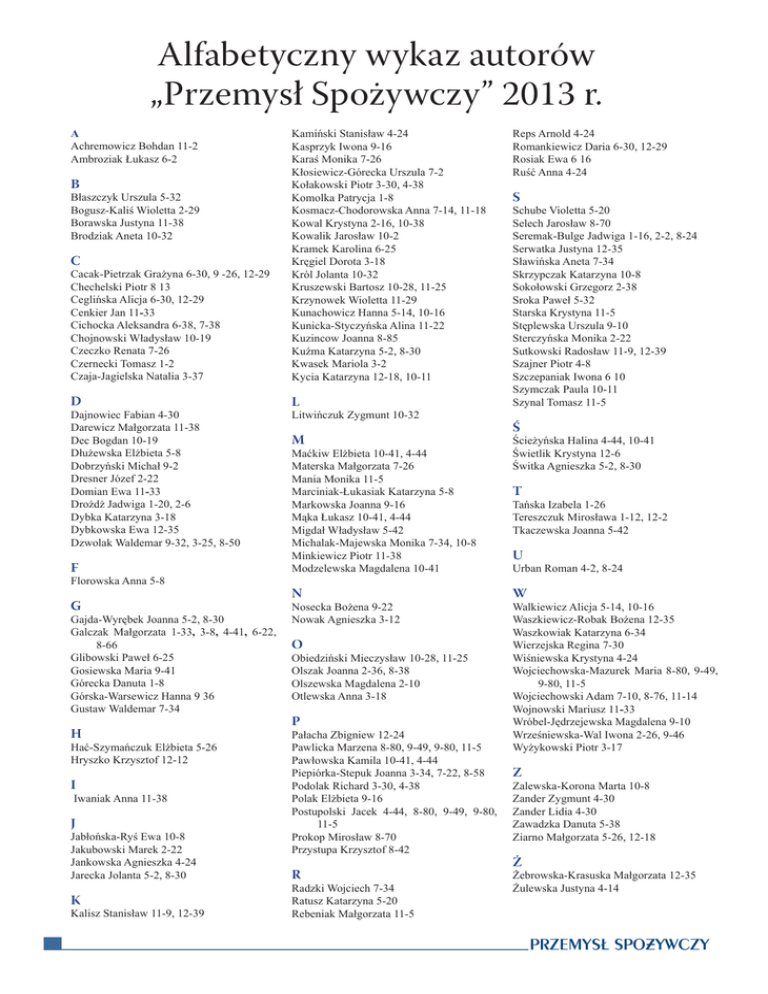 Alfabetyczny wykaz autorów „Przemysł Spożywczy” 2013 r. Cacak-Pietrzak Grażyna 6-30, 9 -26, 12-29 Chechelski Piotr 8 13 Ceglińska Alicja 6-30, 12-29 Cenkier Jan 11-33 Cichocka Aleksandra 6-38, 7-38 Chojnowski Władysław 10-19 Czeczko Renata 7-26 Czernecki Tomasz 1-2 Czaja-Jagielska Natalia 3-37 Kamiński Stanisław 4-24 Kasprzyk Iwona 9-16 Karaś Monika 7-26 Kłosiewicz-Górecka Urszula 7-2 Kołakowski Piotr 3-30, 4-38 Komolka Patrycja 1-8 Kosmacz-Chodorowska Anna 7-14, 11-18 Kowal Krystyna 2-16, 10-38 Kowalik Jarosław 10-2 Kramek Karolina 6-25 Kręgiel Dorota 3-18 Król Jolanta 10-32 Kruszewski Bartosz 10-28, 11-25 Krzynowek Wioletta 11-29 Kunachowicz Hanna 5-14, 10-16 Kunicka-Styczyńska Alina 11-22 Kuzincow Joanna 8-85 Kuźma Katarzyna 5-2, 8-30 Kwasek Mariola 3-2 Kycia Katarzyna 12-18, 10-11 D L A Achremowicz Bohdan 11-2 Ambroziak Łukasz 6-2 B Błaszczyk Urszula 5-32 Bogusz-Kaliś Wioletta 2-29 Borawska Justyna 11-38 Brodziak Aneta 10-32 C Dajnowiec Fabian 4-30 Darewicz Małgorzata 11-38 Dec Bogdan 10-19 Dłużewska Elżbieta 5-8 Dobrzyński Michał 9-2 Dresner Józef 2-22 Domian Ewa 11-33 Drożdż Jadwiga 1-20, 2-6 Dybka Katarzyna 3-18 Dybkowska Ewa 12-35 Dzwolak Waldemar 9-32, 3-25, 8-50 F Florowska Anna 5-8 G Gajda-Wyrębek Joanna 5-2, 8-30 Galczak Małgorzata 1-33, 3-8, 4-41, 6-22, 8-66 Glibowski Paweł 6-25 Gosiewska Maria 9-41 Górecka Danuta 1-8 Górska-Warsewicz Hanna 9 36 Gustaw Waldemar 7-34 H Hać-Szymańczuk Elżbieta 5-26 Hryszko Krzysztof 12-12 I Iwaniak Anna 11-38 J Jabłońska-Ryś Ewa 10-8 Jakubowski Marek 2-22 Jankowska Agnieszka 4-24 Jarecka Jolanta 5-2, 8-30 K Kalisz Stanisław 11-9, 12-39 Litwińczuk Zygmunt 10-32 M Maćkiw Elżbieta 10-41, 4-44 Materska Małgorzata 7-26 Mania Monika 11-5 Marciniak-Łukasiak Katarzyna 5-8 Markowska Joanna 9-16 Mąka Łukasz 10-41, 4-44 Migdał Władysław 5-42 Michalak-Majewska Monika 7-34, 10-8 Minkiewicz Piotr 11-38 Modzelewska Magdalena 10-41 N Nosecka Bożena 9-22 Nowak Agnieszka 3-12 O Obiedziński Mieczysław 10-28, 11-25 Olszak Joanna 2-36, 8-38 Olszewska Magdalena 2-10 Otlewska Anna 3-18 P Pałacha Zbigniew 12-24 Pawlicka Marzena 8-80, 9-49, 9-80, 11-5 Pawłowska Kamila 10-41, 4-44 Piepiórka-Stepuk Joanna 3-34, 7-22, 8-58 Podolak Richard 3-30, 4-38 Polak Elżbieta 9-16 Postupolski Jacek 4-44, 8-80, 9-49, 9-80, 11-5 Prokop Mirosław 8-70 Przystupa Krzysztof 8-42 R Radzki Wojciech 7-34 Ratusz Katarzyna 5-20 Rebeniak Małgorzata 11-5 Reps Arnold 4-24 Romankiewicz Daria 6-30, 12-29 Rosiak Ewa 6 16 Ruść Anna 4-24 S Schube Violetta 5-20 Selech Jarosław 8-70 Seremak-Bulge Jadwiga 1-16, 2-2, 8-24 Serwatka Justyna 12-35 Sławińska Aneta 7-34 Skrzypczak Katarzyna 10-8 Sokołowski Grzegorz 2-38 Sroka Paweł 5-32 Starska Krystyna 11-5 Stęplewska Urszula 9-10 Sterczyńska Monika 2-22 Sutkowski Radosław 11-9, 12-39 Szajner Piotr 4-8 Szczepaniak Iwona 6 10 Szymczak Paula 10-11 Szynal Tomasz 11-5 Ś Ścieżyńska Halina 4-44, 10-41 Świetlik Krystyna 12-6 Świtka Agnieszka 5-2, 8-30 T Tańska Izabela 1-26 Tereszczuk Mirosława 1-12, 12-2 Tkaczewska Joanna 5-42 U Urban Roman 4-2, 8-24 W Walkiewicz Alicja 5-14, 10-16 Waszkiewicz-Robak Bożena 12-35 Waszkowiak Katarzyna 6-34 Wierzejska Regina 7-30 Wiśniewska Krystyna 4-24 Wojciechowska-Mazurek Maria 8-80, 9-49, 9-80, 11-5 Wojciechowski Adam 7-10, 8-76, 11-14 Wojnowski Mariusz 11-33 Wróbel-Jędrzejewska Magdalena 9-10 Wrześniewska-Wal Iwona 2-26, 9-46 Wyżykowski Piotr 3-17 Z Zalewska-Korona Marta 10-8 Zander Zygmunt 4-30 Zander Lidia 4-30 Zawadzka Danuta 5-38 Ziarno Małgorzata 5-26, 12-18 Ż Żebrowska-Krasuska Małgorzata 12-35 Żulewska Justyna 4-14 PRZEMYSŁ SPOZYWCZY