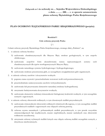 Załącznik nr 1 do uchwały nr.... Sejmiku Województwa Dolnośląskiego z dnia .......... 200…. r. w sprawie ustanowienia planu ochrony Ślężańskiego Parku Krajobrazowego PLAN OCHRONY ŚLĘŻAŃSKIEGO PARKU KRAJOBRAZOWEGO (projekt) Rozdział 1 Cele ochrony przyrody Parku § 1. Celami ochrony przyrody Ślężańskiego Parku Krajobrazowego, zwanego dalej „Parkiem”, są: 1. w zakresie ochrony litosfery: 1) zachowanie charakterystycznych dla Masywu Ślęży struktur geologicznych, w tym zespołu ofiolitowego; 2) zachowanie zespołów form ukształtowania terenu reprezentujących charakterystycznych dla typów morfogenetycznych Masywu Ślęży; zestawy cech 3) zachowanie naturalnego systemu hydrologicznego i hydrogeologicznego; 4) zachowanie struktury przestrzennej gleb, ze szczególnym uwzględnieniem gleb organicznych. 2. w zakresie ochrony zasobów i ekosystemów wodnych: 1) poprawa stanu czystości i przeciwdziałanie wzrostowi trofii wód powierzchniowych; 2) przeciwdziałanie zanieczyszczeniu zasobów wód podziemnych; 3) zachowanie lub przywracanie elementów naturalnej struktury hydrograficznej; 4) utrzymanie funkcjonowania ekosystemów wodnych; 5) zachowanie elementów rodzimej różnorodności biologicznej środowisk wodnych, w tym szczególnie cennych i zagrożonych. 3. w zakresie ochrony zbiorowisk roślinnych, w tym chronionych siedlisk przyrodniczych: 1) zachowanie różnorodności zbiorowisk roślinnych właściwych dla regionu, w tym szczególnie siedlisk przyrodniczych rzadkich i zagrożonych oraz objętych ochroną prawną; 2) ochrona czynna naturalnych i półnaturalnych siedlisk przyrodniczych, w tym przede wszystkim zmiennowilgotnych łąk trzęślicowych, muraw ciepłolubnych, muraw naskalnych oraz zbiorowisk roślinności szczelinowej; 3) utrzymanie ochrony wybranych siedlisk leśnych oraz objęcie ochroną siedlisk szczególnie cennych, a dotychczas niechronionych; 1 4) odtwarzanie ekosystemów leśnych o składzie gatunkowym zgodnym z siedliskiem. Przebudowa drzewostanów monokulturowych całkowicie niezgodnych z siedliskiem w trakcie użytkowania rębnego oraz dobór właściwego składu gatunkowego odnowienia; 5) zachowanie i podtrzymanie możliwości trwałego funkcjonowania zbiorowisk roślinnych, w tym szczególnie chronionych siedlisk przyrodniczych poprzez zachowanie właściwego stanu ich ochrony oraz zachowanie łączących je liniowych struktur pełniących funkcje korytarzy ekologicznych. 4. w zakresie ochrony gatunków roślin i grzybów oraz ich siedlisk: 1) objęcie ochroną czynną wybranych stanowisk gatunków roślin naczyniowych takich jak: zanokcica serpentynowa Asplenium adulterinum, zanokcica ciemna Asplenium adiantum-nigrum, zanokcica klinowata Asplenium cuneifolium, przytulia stepowa Galium valdepilosum, leniec alpejski Thesium alpinum oraz, w przypadku potwierdzenia jego występowania; mieczyk błotny Gladiolus palustris ( 2) zwiększenie ilości martwego drewna, szczególnie pni stojących i leżących w obrębie siedlisk leśnych; 3) ograniczanie rozprzestrzeniania się populacji gatunków obcego geograficznie pochodzenia, w tym szczególnie zagrażających gatunkom rodzimym, takich jak robinia akacjowa Robinia pseudoacacia i czeremcha amerykańska Padus serotina, a także dąb czerwony Quercus rubra i daglezja Pseudotsuga taxifolia. 5. w zakresie ochrony gatunków zwierząt i ich siedlisk: 1) zachowanie rodzimej różnorodności gatunkowej zwierząt, właściwej dla regionu, w tym szczególnie gatunków rzadkich, zagrożonych i chronionych; 2) zachowanie istniejących stanowisk, ostoi i siedlisk rzadkich, zagrożonych i chronionych gatunków zwierząt oraz przywracanie utraconych składników bogactwa gatunkowego; 3) utrzymanie powierzchni dotychczas występującej mozaikowatości środowiskowej z dużym udziałem ekotonów, warunkującej bogactwo i różnorodność zgrupowań zwierzęcych; 4) utrzymanie lub odtwarzanie korytarzy ekologicznych umożliwiających migrację zwierząt; 5) ograniczenie wprowadzania i kontrola liczebności gatunków obcego pochodzenia, w szczególności gatunków inwazyjnych, mogących stanowić zagrożenie dla rodzimej fauny. 6. w zakresie ochrony krajobrazów, w tym krajobrazów kulturowych: 1) wzmocnienie ochrony prawnej zachowanych obiektów dziedzictwa kulturowego oraz rewaloryzacja obiektów zdegradowanych, przy dopuszczeniu ich adaptacji do pełnienia nowych funkcji; 2) zapobieganie zagrożeniom mogącym spowodować uszczerbek dla wartości obiektów dziedzictwa kulturowego; 3) uwzględnianie zasad ochrony krajobrazów, w tym krajobrazów kulturowych w planowaniu i zagospodarowaniu przestrzennym, w tym: a) - zachowanie osi krajobrazowych i powiązań widokowych, b) - zapewnienie właściwej ekspozycji zabytkom, c) - zachowanie historycznych cech zabudowy regionalnej, d) - zachowanie charakterystycznych, historycznych układów urbanistycznych i ruralistycznych, 2 e) - zachowanie i odtwarzanie charakterystycznych układów zadrzewień, w tym zwłaszcza alei przydrożnych; 4) zachowanie elementów kultury ludowej; 5) poprawa dostępności do obiektów dziedzictwa kulturowego; 6) aktywizacja działań na rzecz powstawania projektów i wspierania inicjatyw dotyczących kreowania nowych form opieki nad zabytkami i krajobrazem kulturowym oraz wykorzystywania ich na rzecz rozwoju regionalnego. Rozdział 2 Przyrodnicze, społeczne i gospodarcze uwarunkowania realizacji celów ochrony przyrody § 2. Przyrodniczymi, społecznymi i gospodarczymi uwarunkowaniami realizacji celów ochrony przyrody Parku są: 1. umożliwianie zachowania i wzbogacania oraz popularyzacji wartości przyrodniczych, w tym krajobrazowych Parku w warunkach zrównoważonego rozwoju. 2. podejmowanie działań na rzecz ochrony i kształtowania wartości krajobrazowych, które powinny dotyczyć zarówno krajobrazów naturalnych jak i historycznie ukształtowanych i tradycyjnych krajobrazów kulturowych. 3. preferowanie form działalnośc