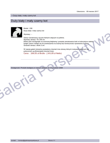Utworzono : 09 marzec 2017 > Duży biały i mały czarny kot Duży biały i mały czarny kot Model : 238 Duży biały i mały czarny kot a w ty Wymiary : - Obraz namalowany ręcznie farbami olejnymi na płótnie. Wymiary obrazu: 70 x 85 cm. Płótno jest naciagnięte na sosnową blejtramę i posiada zamalowane boki w kolorystyce całości. Dzięki czemu nadaje sie do powieszenia na ścianę bez konieczności oprawiania w ramę. Grubość obrazu: około 2 cm. k e W naszej galerii obrazów posiadamy również inne obrazy których motywem głównym lub pobocznym są [Zwierzęta] (również koty). p rs Cena : 299,00 zł Brutto ( 243,09 zł Netto) e P Dostępność: Produkt dostępny w naszym sklepie od 19 grudzień 2008 a i r e l a G kontakt : - [email protected] Strona 1/1