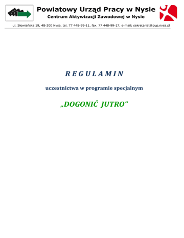 REGULAMIN uczestnictwa w programie specjalnym „DOGONIĆ JUTRO” §1 POSTANOWIENIA OGÓLNE 1. Podstawa prawna: − Ustawa z dnia 20 kwietnia 2004 r. o promocji zatrudnienia i instytucjach rynku pracy (Dz. U. z 2008 Nr 69 poz. 415 z późn. zm.) − Rozporządzenie Ministra Pracy i Polityki Społecznej z dnia 23 marca 2009 r. w sprawie programów specjalnych (Dz. U. z 2009 Nr 50 poz. 401 z późn. zm.) − Rozporządzenie Komisji (WE) nr 1998/2006 z dnia 15 grudnia 2006 r. w sprawie stosowania art. 87 i 88 Traktatu do pomocy de minimis /Dz. Urz. UE L 379 z dnia 28.12.2006 r./. 2. Regulamin określa warunki uczestnictwa w programie specjalnym, zakres i warunki udzielenia wsparcia oraz prawa i obowiązki Uczestników programu specjalnego „DOGONIĆ JUTRO” realizowanego w ramach środków algorytmicznych Funduszu Pracy. 3. Projekt realizowany jest przez Powiatowy Urząd Pracy w Nysie w okresie od 2 kwietnia 2012 roku do 31 grudnia 2012 roku na terenie powiatu nyskiego. 4. Uczestnicy programu nie ponoszą żadnych kosztów związanych z udziałem w programie. §2 SŁOWNIK POJĘĆ Użyte w niniejszym Regulaminie pojęcia oznaczają: • Program – program specjalny „DOGONIĆ JUTRO”, • Realizator programu – Powiatowy Urząd Pracy Nysie, • Uczestnik programu – osoba bezrobotna zarejestrowana w Powiatowym Urzędzie Pracy w Nysie, • Strona internetowa– strona Powiatowego Urzędu Pracy w Nysie, na której będą umieszczane informacje dotyczące projektu, tj. www.pup.nysa.pl §3 UCZESTNICY PROGRAMU Uczestnikami programu mogą być wyłącznie osoby bezrobotne spełniające poniższe kryteria łącznie: • osoba długotrwale bezrobotna (zgodnie z definicją zawartą w art. 49 ustawy o promocji zatrudnienia i instytucjach rynku pracy), tj. oznacza to bezrobotnego pozostającego w rejestrze powiatowego urzędu pracy łącznie przez okres ponad 12 miesięcy w okresie ostatnich 2 lat, z wyłączeniem okresów odbywania stażu i przygotowania zawodowego dorosłych, • osoba z wykształceniem nie wyższym niż gimnazjalne, • osoba w stosunku do której prowadzone wcześniej działania aktywizacyjne nie przyniosły trwałego efektu. 2 §4 CEL PROGRAMU Głównym celem programu jest aktywizacja i doprowadzenie do zatrudnienia minimum 65% uczestników programu specjalnego. §5 WARUNKI UCZESTNICTWA W PROGRAMIE Uczestnicy programu zobowiązani są do: 1) wypełnienia ankiet związanych z realizacją programu oraz udzielania niezbędnych informacji dla celów monitoringu, kontroli i ewaluacji programu, 2) podpisania deklaracji uczestnictwa w programie oraz zgody na przetwarzanie danych osobowych w zakresie objętym programem, 3) ścisłej współpracy z Powiatowym Urzędem Pracy w Nysie - dostarczania wszelkich niezbędnych dokumentów związanych z realizacją programu, 4) wypełniania obowiązków wynikających z uczestnictwa w programie, 5) informowania Powiatowego Urzędu Pracy w Nysie o ewentualnych zmianach istotnych z punktu widzenia programu (np. podjęcie pracy). §6 ZAKRES WSPARCIA Program „DOGONIĆ JUTRO” przewiduje następujące wsparcie dla jego uczestników: 1. Warsztaty z doradca zawodowym „Gotowość do zmian” – 12 os., 30 godz. Uczestnicy warsztatów zostaną zapoznani z aktualną sytuacją na rynku pracy, odkryją swój potencjał zawodowy, głębiej zrozumieją swoje potrzeby. Nauczą się aktywnej postawy w stosunku do przemian, które zachodzą na rynku pracy. Nabędą umiejętności pokonywania psychicznych barier, łamania utartych schematów myślenia, stawiania czoła wyzwaniom dynamicznie rozwijającego się społeczeństwa i elastycznego rynku pracy. Udoskonalą własne umiejętności w podejmowaniu decyzji, ich realizacji i brania odpowiedzialności za nie. Wzbudzą kreatywność oraz nowy, pozytywny sposób myślenia. 2. Warsztaty z kompetencji informatycznych – 11 os., 80 godz. Warsztaty będę miały na celu nabycie odpowiednich kwalifikacji i umiejętności w korzystaniu z nowoczesnych technologii, w tym informacyjno-komunikacyjnych, szkolenia z obsługi komputera połączone z wykorzystaniem Internetu do kontaktu z pracodawcami oraz obsługa standardowych programów wykorzystywanych w pracy. 3. Szkolenie zawodowe – 11 os. Szkolenia zawodowe będą indywidualnie dostosowane do potrzeb uczestników programu, pozwolą uczestnikom zdobyć, odpowiednie kwalifikacje zawodowe do wykonywania zawodu. 4. Staże zawodowe. 5. Doposażenia nowych miejsc pracy. 3 6. Prace interwencyjne. 7. Pośrednictwo pracy Wsparcie uczestników programu przez 2 osobowe zespoły zadaniowe (pośrednik pracy i doradcy zawodowego) w trakcie poszukiwania pracy, pozyskiwanie ofert pracy oraz adaptacji uczestnika w miejscu pracy. §7 WSPARCIE FINANSOWE – OGÓLNE WARUNKI 1. Stypendium Uczestnikom w okresie udziału w warsztatach z doradcą zawodowym pt.”Gotowość do zmian”, w warsztatach z kompetencji informatycznych, odbywania szkolenia i stażu przysługiwać będzie stypendium w wysokości przewidzianej ustawą o promocji zatrudnienia i instytucjach rynku pracy. 2. Zwrot kosztów dojazdu Uczestnikom programu przysługuje zwrot kosztów dojazdu na poszczególne formy wsparcia. Zwrot będzie obejmował koszty przejazdu, zgodnie z ustawą o promocji zatrudnienia i instytucjach rynku pracy: a) na warsztaty z doradcą zawodowym „Gotowość do zmian”, b) na warsztaty z kompetencji informatycznych, c) na szkolenie zawodowe, d) na staż – zwrot będzie przysługiwał przez okres do 6 m-cy od momentu zatrudnienia, nie dłużej jednak niż do 30.11.2012 r., e) na prace interwencyjne – zwrot będzie przysługiwał przez okres do 6 m-cy od momentu zatrudnienia, nie dłużej jednak niż do 30.11.2012 r., f) na doposażenia nowych miejsc pracy – zwrot będzie przysługiwał przez okres do 6 m-cy od momentu zatrudnienia, nie dłużej jednak niż do 30.11.2012 r., Zasady obowiązujące przy zwrocie kosztów dojazdu. Koszty dojazdu będą rozliczane na podstawie: − wnios