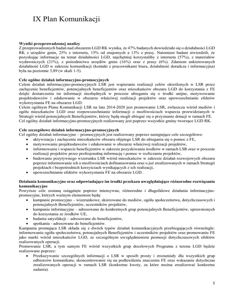 IX Plan Komunikacji Wyniki przeprowadzonej analizy Z przeprowadzonych badań nad obszarem LGD RK wynika, że 47% badanych dowiedziało się o działalności LGD RK z urzędów gmin, 25% z internetu, 15% od znajomych a 13% z prasy. Natomiast badani stwierdzili, że pozyskując informacje na temat działalności LGD, najchętniej korzystaliby z internetu (57%), z materiałów wydawniczych (21%), z pośrednictwa urzędów gmin (16%) oraz z prasy (6%). Zdaniem ankietowanych działalność LGD w zakresie komunikacji (kontakt z pracownikami biura, działalność doradcza i informacyjna) była na poziomie 3,89 (w skali 1-5). Cele ogólne działań informacyjno-promocyjnych Celem działań informacyjno-promocyjnych LSR jest wspieranie realizacji celów określonych w LSR przez zachęcenie beneficjentów, potencjalnych beneficjentów oraz mieszkańców obszaru LGD do korzystania z FE dzięki dostarczeniu im informacji niezbędnych w procesie ubiegania się o środki unijne, motywowanie projektodawców i edukowanie w obszarze właściwej realizacji projektów oraz upowszechnianie efektów wykorzystania FE na obszarze LGD. Celem ogólnym Planu Komunikacji LSR na lata 2014-2020 jest promowanie LSR, zwłaszcza wśród mediów i ogółu mieszkańców LGD oraz rozpowszechnianie informacji o możliwościach wsparcia przewidzianych w Strategii wśród potencjalnych Beneficjentów, którzy będą mogli ubiegać się o przyznanie dotacji w ramach FE. Cel ogólny działań informacyjno-promocyjnych realizowany jest poprzez wszystkie gminy tworzące LGD RK. Cele szczegółowe działań informacyjno-promocyjnych Cel ogólny działań informacyjno – promocyjnych jest realizowany poprzez następujące cele szczegółowe: aktywizacja i zachęcenie mieszkańców obszaru objętego LSR do ubiegania się o pomoc z FE, motywowanie projektodawców i edukowanie w obszarze właściwej realizacji projektów, informowanie i wsparcie beneficjentów w zakresie pozyskiwania środków w ramach LSR oraz w procesie realizacji projektów przez profesjonalną informację i pomoc w rozliczaniu projektów, budowanie pozytywnego wizerunku LSR wśród mieszkańców w zakresie działań rozwojowych obszaru poprzez informowanie ich o możliwościach dofinansowania oraz o już zrealizowanych w ramach Strategii projektach i bezpośrednich korzyściach wynikających z ich realizacji, upowszechnianie efektów wykorzystania FE na obszarze LGD. Działania komunikacyjne oraz odpowiadające im środki przekazu uwzględniające różnorodne rozwiązania komunikacyjne Powyższe cele zostaną osiągnięte poprzez intensywne, różnorodne i długofalowe działania informacyjnopromocyjne, których ważnym elementem będą: kampanie promocyjno – wizerunkowe, skierowane do mediów, ogółu społeczeństwa, dotychczasowych i potencjalnych Beneficjentów, uczestników projektów, kampanie informacyjne – adresowane do konkretnych grup potencjalnych Beneficjentów, uprawnionych do korzystania ze środków UE, badania satysfakcji – adresowane do beneficjentów, spotkania - adresowane do beneficjentów. Kampania promująca LSR składa się z dwóch typów działań komunikacyjnych przebiegających równolegle: informowaniu ogółu społeczeństwa, potencjalnych Beneficjentów i uczestników projektów oraz promowaniu FE jako marki wśród mieszkańców LGD, ze szczególnym uwzględnieniem promocji dotychczasowych efektów realizowanych operacji. Promowanie LSR, a tym samym FE wśród wszystkich grup docelowych Programu z terenu LGD będzie realizowane poprzez: Przekazywanie szczególnych informacji o LSR w sposób prosty i zrozumiały dla wszystkich grup odbiorców komunikatu; skoncentrowanie się na podkreśleniu znaczenia FE oraz wskazanie dotychczas zrealizowanych operacji w ramach LSR (konkretne kwoty, za które można zrealizować konkretne zadania). 1 Stałe podkreślanie możliwości otrzymywania znacznej kwoty FE na realizację projektów, dzięki czemu zmniejszy się dystans dzielący poszczególne gminy LGD oraz LGD do pozostałych grup, Stosowanie jednolitego systemu wizualizacji działań informacyjno-promocyjnych, Wykreowanie wizerunku obszaru LGD jako obszaru potrafiącego w efektywny sposób zarządzać i wykorzystywać FE. W kolejnych fazach promocji LSR będzie podkreślana aktywność instytucji i przedsiębiorców w pozyskiwaniu środków poprzez informowanie o liczbie wniosków i zrealizowanych inwestycjach ze środków UE. Dla podkreślenia znaczenia FE pokazane będą mocne strony ich wdrażania, w tym dokonane porównania LGD z wynikami innych grup (dane dotyczące zrealizowanych operacji przy wsparciu ze strony środków unijnych). Rozwój LGD ukazywany będzie za pomocą prostych i pozytywnych przesłań medialnych np.: przydatności zrealizowanych projektów dla: młodzieży, która może czynnie spędzić wolny czas; osoby starszej, która zdobyła nowe umiejętności. Rozwój LGD podkreślany będzie również poprzez upowszechnianie licznych przykładów zrealizowanych lub realizowanych projektów oraz wynikających z nich korzyści dla różnych grup docelowych wraz z podawaniem do publicznej wiadomości wykazu Beneficjentów, tytułów projektów i przyznanych im kwot dofinansowania. Treść komunikatów dostosowana będzie do prowadzonych działań promocyjnych: informacyjne – w ramach Kampanii Informacyjnej (KI) – treści czysto merytoryczne i informacyjne – narzędzia: biuletyn, ulotki, dokumenty programowe, wizerunkowe – reklama na materiałach promocyjnych, perswazyjne – wszelkie reklamy prasowe, na plakatach. W całym kilkuletnim procesie komunikacji konieczne jest utrzymanie mobilizacji społecznej. Będzie to zrealizowane poprzez zapewnienie wielokanałowego i użytecznego dostępu do informacji i promocji. Informacja wielokanałowa jest przekazywana beneficjentom za pośrednictwem wielu kanałów, co maksymalizuje możliwość jej uzyskania. Główne kanały przekazywania informacji to: Prasa, Mater