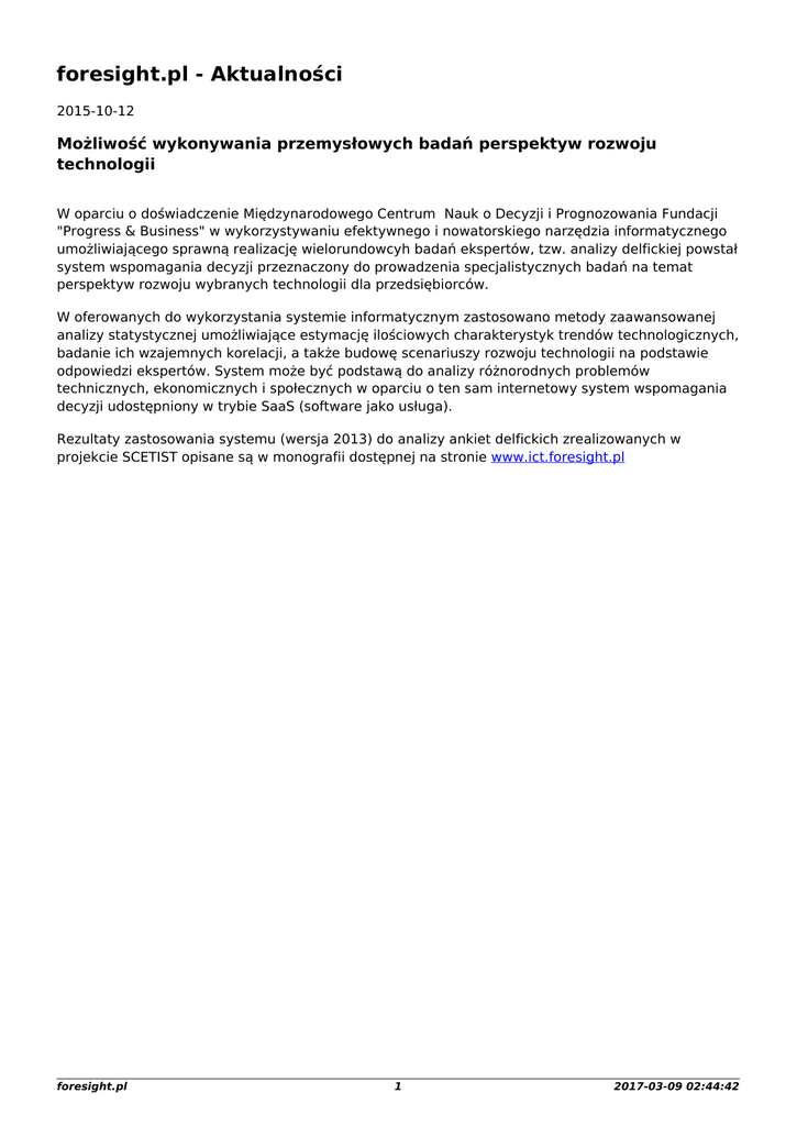 foresight.pl - Aktualności 2015-10-12 Możliwość wykonywania przemysłowych badań perspektyw rozwoju technologii W oparciu o doświadczenie Międzynarodowego Centrum Nauk o Decyzji i Prognozowania Fundacji "Progress & Business" w wykorzystywaniu efektywnego i nowatorskiego narzędzia informatycznego umożliwiającego sprawną realizację wielorundowcyh badań ekspertów, tzw. analizy delfickiej powstał system wspomagania decyzji przeznaczony do prowadzenia specjalistycznych badań na temat perspektyw rozwoju wybranych technologii dla przedsiębiorców. W oferowanych do wykorzystania systemie informatycznym zastosowano metody zaawansowanej analizy statystycznej umożliwiające estymację ilościowych charakterystyk trendów technologicznych, badanie ich wzajemnych korelacji, a także budowę scenariuszy rozwoju technologii na podstawie odpowiedzi ekspertów. System może być podstawą do analizy różnorodnych problemów technicznych, ekonomicznych i społecznych w oparciu o ten sam internetowy system wspomagania decyzji udostępniony w trybie SaaS (software jako usługa). Rezultaty zastosowania systemu (wersja 2013) do analizy ankiet delfickich zrealizowanych w projekcie SCETIST opisane są w monografii dostępnej na stronie www.ict.foresight.pl foresight.pl 1 2017-03-09 02:44:42