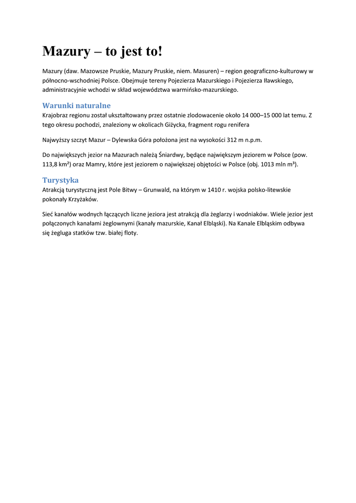 Mazury – to jest to! Mazury (daw. Mazowsze Pruskie, Mazury Pruskie, niem. Masuren) – region geograficzno-kulturowy w północno-wschodniej Polsce. Obejmuje tereny Pojezierza Mazurskiego i Pojezierza Iławskiego, administracyjnie wchodzi w skład województwa warmińsko-mazurskiego. Warunki naturalne Krajobraz regionu został ukształtowany przez ostatnie zlodowacenie około 14 000–15 000 lat temu. Z tego okresu pochodzi, znaleziony w okolicach Giżycka, fragment rogu renifera Najwyższy szczyt Mazur – Dylewska Góra położona jest na wysokości 312 m n.p.m. Do największych jezior na Mazurach należą Śniardwy, będące największym jeziorem w Polsce (pow. 113,8 km²) oraz Mamry, które jest jeziorem o największej objętości w Polsce (obj. 1013 mln m³). Turystyka Atrakcją turystyczną jest Pole Bitwy – Grunwald, na którym w 1410 r. wojska polsko-litewskie pokonały Krzyżaków. Sieć kanałów wodnych łączących liczne jeziora jest atrakcją dla żeglarzy i wodniaków. Wiele jezior jest połączonych kanałami żeglownymi (kanały mazurskie, Kanał Elbląski). Na Kanale Elbląskim odbywa się żegluga statków tzw. białej floty.