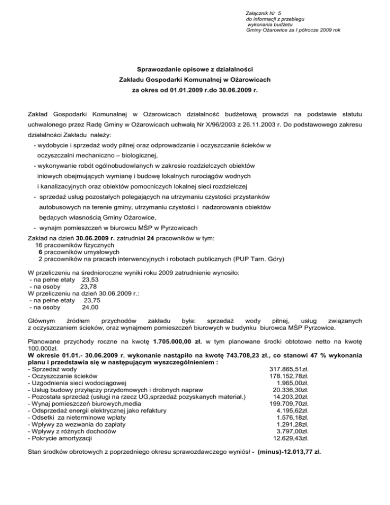 Załącznik Nr 5 do informacji z przebiegu wykonania budŜetu Gminy OŜarowice za I półrocze 2009 rok Sprawozdanie opisowe z działalności Zakładu Gospodarki Komunalnej w OŜarowicach za okres od 01.01.2009 r.do 30.06.2009 r. Zakład Gospodarki Komunalnej w OŜarowicach działalność budŜetową prowadzi na podstawie statutu uchwalonego przez Radę Gminy w OŜarowicach uchwałą Nr X/96/2003 z 26.11.2003 r. Do podstawowego zakresu działalności Zakładu naleŜy: - wydobycie i sprzedaŜ wody pitnej oraz odprowadzanie i oczyszczanie ścieków w oczyszczalni mechaniczno – biologicznej, - wykonywanie robót ogólnobudowlanych w zakresie rozdzielczych obiektów iniowych obejmujących wymianę i budowę lokalnych rurociągów wodnych i kanalizacyjnych oraz obiektów pomocniczych lokalnej sieci rozdzielczej - sprzedaŜ usług pozostałych polegających na utrzymaniu czystości przystanków autobusowych na terenie gminy, utrzymaniu czystości i nadzorowania obiektów będących własnością Gminy OŜarowice, - wynajm pomieszczeń w biurowcu MŚP w Pyrzowicach Zakład na dzień 30.06.2009 r. zatrudniał 24 pracowników w tym: 16 pracowników fizycznych 6 pracowników umysłowych 2 pracowników na pracach interwencyjnych i robotach publicznych (PUP Tarn. Góry) W przeliczeniu na średnioroczne wyniki roku 2009 zatrudnienie wynosiło: - na pełne etaty 23,53 - na osoby 23,78 W przeliczeniu na dzień 30.06.2009 r.: - na pełne etaty 23,75 - na osoby 24,00 Głównym źródłem przychodów zakładu była: sprzedaŜ wody pitnej, usług związanych z oczyszczaniem ścieków, oraz wynajmem pomieszczeń biurowych w budynku biurowca MŚP Pyrzowice. Planowane przychody roczne na kwotę 1.705.000,00 zł. w tym planowane środki obtotowe netto na kwotę 100.000zł. W okresie 01.01.- 30.06.2009 r. wykonanie nastąpiło na kwotę 743.708,23 zł., co stanowi 47 % wykonania planu i przedstawia się w następującym wyszczególnieniem : - SprzedaŜ wody 317.865,51zł. - Oczyszczanie ścieków 178.152,78zł. - Uzgodnienia sieci wodociągowej 1.965,00zł. - Usług budowy przyłączy przydomowych i drobnych napraw 20.336,30zł. - Pozostała sprzedaŜ (usługi na rzecz UG,sprzedaŜ pozyskanych materiał.) 14.203,20zł. - Wynaj pomieszczeń biurowych,media 199.709,70zł. - OdsprzedaŜ energii elektrycznej jako refaktury 4.195,62zł. - Odsetki za nieterminowe wpłaty 1.576,18zł. - Wpływy za wezwania do zapłaty 1.291,28zł. - Wpływy z róŜnych dochodów 3.797,00zł. - Pokrycie amortyzacji 12.629,43zł. Stan środków obrotowych z poprzedniego okresu sprawozdawczego wyniósł - (minus)-12.013,77 zł. Wykonanie kosztów i innych obciąŜeń jest realizowane zgodnie ze statutem zakładu z przeznaczeniem na działalność bieŜącą i wyniosło na kwotę 725.885,67 zł. , co stanowi 46 % wykonania planu. Wykonanie planu za rok 2009 r. jest następujące: 1.Wydatki osobowe nie zaliczane do wynagrodzeń wypłacono na pranie odzieŜy pracownikom fizycznym 2.Wynagrodzenia osobowe pracowników 3.Dodatkowe wynagrodzenie roczne 4.Składki na ubezpieczenie społ. 5.Składki na Fundusz Pracy 6.Wpłaty na PFRON 7.Wynagrodzenia bezosobowe realizacja umów o dzieło i umów zleceń plan 11.600 zł. wyk. 4.112,50zł. 35% plan plan plan plan plan plan 574.500zł. 53.500zł. 91.600zł. 15.500zł. 19.200zł. 38.200zł. wyk. 290.952,62zł. wyk. Bez.wyk.. wyk. 87.877,22zł. wyk. 7.392,59zł. wyk. Bez wyk. wyk. 17.105,00zł. 51% 0% 50% 48% 0% 45% Razem wynagrodzenia pracowników z pochodnymi Wynoszą : plan 804.100 zł. wyk. 365.406,95zł. 8. Zakup materiałów i wyposaŜenia plan 144.600zł. wyk. 70.917,13zł. 49% wyk. 164.022,71zł. 56% wyk. 37% W szczególności wydano na : Art. biurowe Literatura fachowa Art. bhp,ubrania rob.,woda pitna Paliwodo sam.Ŝuk Paliwo do maszyn i urządzeń Materiały wodociągowe Materiał na oczyszcz. ścieków Materiały elektryczny Materiały róŜne 3.291,70zł. 2.876,27zł. 1.178,11zł. 2.588,57zł. 736,50zł. 41.343,46zł. 1.531,13zł. 86,45zł. 6.739,86zł. w tym środek odtłuszczający 2.021,61zł. WyposaŜenie zakładu Części sam. śuk,Citroen Art. czystości MśP WyposaŜenie na MśP 2.626,00zł. 1.544,71zł. 3.886,86zł. 2.487,51zł. 9. Zakup energii Z tego: Na energię elektryczną Na wodę Za gaz plan 292.000zł. plan 45.700 zł. 81.457,06 zł. 61.466,51 zł. 21.099,14 zł. 10. Zakup usług remontowych 17.019,55 zł. W ramach usług wykonano usługi sprzętem specjalistycznym przy usuwaniu awarii sieci wodociągowych. 11. Zakup usług zdrowotnych Badania wstępne i okresowe pracowników,szczepienia plan 12. Zakup usług pozostałych plan 2 3.050zł. wyk. 320,00zł. 83.500zł. wyk. 43.259,25zł. 10% 52% W tym: Badania wody Badania ścieków 5.263,55zł. 1.475,00zł. Usługi pocztowe 2.185,45zł. Usługi komunalne-wywóz śmieci Usługi spedycyjne Usługi informatyczne Usługi prawnicze Usługi bankowe Szkolenia zawodowe Usługi inne-wynajm,obsł.hydrolog. wyk. dokumentacji specjalist. Usługi przegladu p-poŜarowe 1.930,00zł. 1.135,47zł. 10.050,00zł. 4.800,00zł. 3.146,00zł. 3.920,00zł. 9.086,78zł. 267,00zł 13.Opłaty za usługi internetowe 14.Opłaty za usługi telefonii komórkowej plan plan 3.350zł. wyk. 9.800zł. wyk. 758,69zł. 1.435,05zł. 23% 15% 15.Opłaty za usługi telefonii stacjonarnej 16.Zakup usług obejmujących wykonani ekspertyz,anali i opinii 17. PodróŜe słuŜbowe krajowe W tym : Delegacje krajowe Bilety autobusowe plan 5.080zł. wyk. 1.258,47zł. 25% plan 1.000zł. wyk. 500,00zł. 50% plan 8.400 zł. wyk. 5.002,64zł. 60% plan 46.000zł. wyk. 20.876,98zł. 45% plan plan 24.800zł. wyk. 5.200zł. wyk. 12.000,00zł. 0,03zł. 48% 0% 1.261,89zł. Bez wyk. 25% 0% 348,30zł. 1.890,60zł. Bez wyk. 6.978,00zł 5% 15% 0% 23% Ryczałt za wykorzystanie sam. do celów słuŜbowych 18.RóŜne opłaty i składki Opłata za gospodarcze korzystanie ze środowiska za pobór wody oraz za odprowadzanie ścieków Ubezpieczenie sam.śuk,Citroen w PZU Ubezpieczenie budynku M
