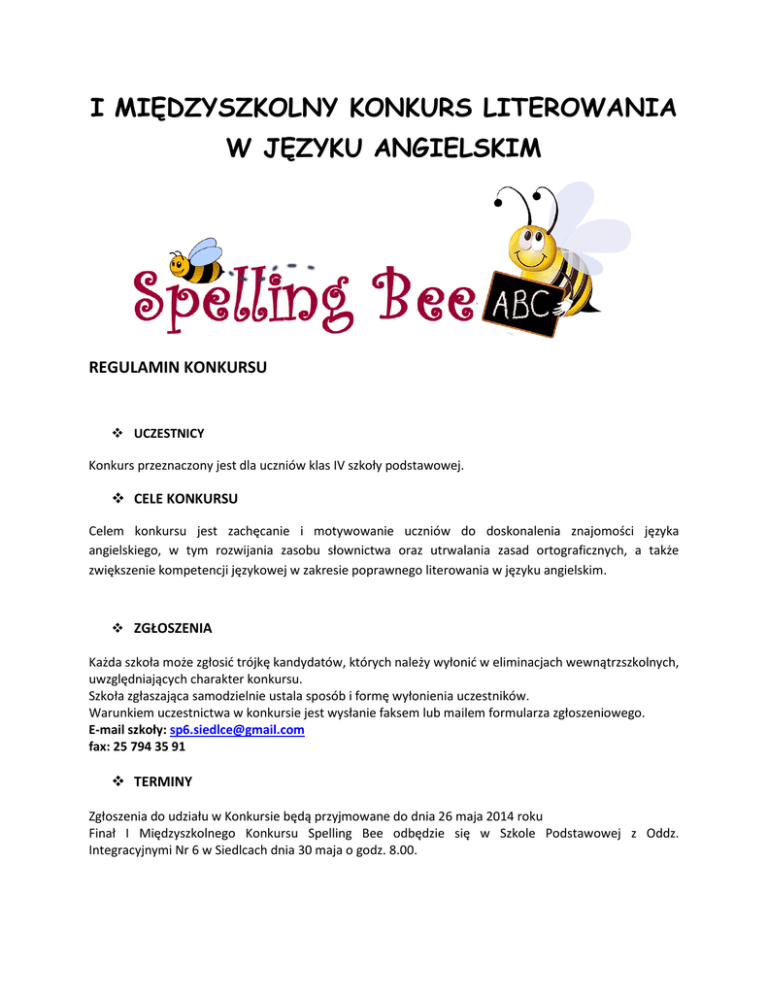 I MIĘDZYSZKOLNY KONKURS LITEROWANIA W JĘZYKU ANGIELSKIM REGULAMIN KONKURSU UCZESTNICY Konkurs przeznaczony jest dla uczniów klas IV szkoły podstawowej. CELE KONKURSU Celem konkursu jest zachęcanie i motywowanie uczniów do doskonalenia znajomości języka angielskiego, w tym rozwijania zasobu słownictwa oraz utrwalania zasad ortograficznych, a także zwiększenie kompetencji językowej w zakresie poprawnego literowania w języku angielskim. ZGŁOSZENIA Każda szkoła może zgłosić trójkę kandydatów, których należy wyłonić w eliminacjach wewnątrzszkolnych, uwzględniających charakter konkursu. Szkoła zgłaszająca samodzielnie ustala sposób i formę wyłonienia uczestników. Warunkiem uczestnictwa w konkursie jest wysłanie faksem lub mailem formularza zgłoszeniowego. E-mail szkoły: [email protected] fax: 25 794 35 91 TERMINY Zgłoszenia do udziału w Konkursie będą przyjmowane do dnia 26 maja 2014 roku Finał I Międzyszkolnego Konkursu Spelling Bee odbędzie się w Szkole Podstawowej z Oddz. Integracyjnymi Nr 6 w Siedlcach dnia 30 maja o godz. 8.00. PRZEBIEG KONKURSU Konkurs składa się z dwóch etapów. ETAP I - część ustna Uczestnicy konkursu będą mieli za zadanie przeliterować wylosowane i przeczytane przez lektora zestawy wyrazów 4-, 5- i 6- literowych. Na przeliterowanie każdego słowa uczeń ma do 30 sekund. Do etapu finałowego przechodzą uczestnicy, którzy popełnili jak najmniej błędów i zdobyli jak najwięcej punktów. FINAŁ - część ustna Uczestnicy losują słowa, które następnie muszą przetłumaczyć na język angielski i je przeliterować. Na przetłumaczenie i przeliterowanie każdego słowa uczeń ma 30 sekund. Zwycięzcą zastaje osoba, która popełniła jak najmniej błędów. PUNKTACJA - Uczeń ma prawo zapisać sobie słyszane sowo na kartce (kartki będą wcześniej przygotowane przez komisję). - W I Etapie konkursu uczeń ma prawo zapytać o znaczenie słowa do przeliterowania. - Za każde poprawnie przeliterowane słowa bez podpowiedzi (tłumaczenie/zapisanie) uczeń otrzymuje 2 punkty. - Za bezbłędne przeliterowanie słowa z jedną podpowiedzią uczeń otrzymuje 1 punkt, za dwie podpowiedzi , czyli tłumaczenie i zapisanie wyrazu w oryginale 0,5 punkta. UWAGI Organizatorzy konkursu w wyjątkowych sytuacjach zastrzegają sobie prawo do zmian w regulaminie po wcześniejszym poinformowaniu o tym uczestników. NAGRODY Zdobywcy I, II i III miejsca otrzymają nagrody rzeczowe oraz dyplomy. Pozostali uczestnicy otrzymają nagrody pocieszenia oraz dyplomy uczestnictwa. SPONSORZY Wydawnictwo MacMillan Wydawnictwo Oxford Organizatorzy konkursu: mgr Anna Bareja mgr Monika Szostek