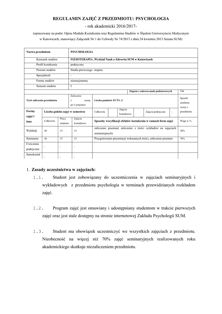 REGULAMIN ZAJĘĆ Z PRZEDMIOTU: PSYCHOLOGIA - rok akademicki 2016/2017(opracowany na podst. Opisu Modułu Kształcenia oraz Regulaminu Studiów w Śląskim Uniwersytecie Medycznym w Katowicach, stanowiący Załącznik Nr 1 do Uchwały Nr 74/2013 z dnia 24 kwietnia 2013 Senatu SUM) Nazwa przedmiotu PSYCHOLOGIA Kierunek studiów FIZJOTERAPIA ,Wydział Nauk o Zdrowiu SUM w Katowicach Profil kształcenia praktyczny Poziom studiów Studia pierwszego stopnia Specjalność - Forma studiów niestacjonarny Semestr studiów I Zajęcia z zakresu nauk podstawowych Zaliczenie z Tryb zaliczenia przedmiotu oceną Sposób Liczba punktów ECTS -2 ustalania po I semestrze Liczba godzin zajęć w semestrze Formy zajęć i Pracy Zajęcia studenta kontaktowe 30 15 15 30 15 15 - - - - - - 60 30 30 inne Całkowita Wykłady Seminaria Całkowita Zajęcia Tak oceny z Zajęcia praktyczne - przedmiotu Sposoby weryfikacji efektów kształcenia w ramach form zajęć Waga w % kontaktowe zaliczenie pisemne( zaliczenie z treści wykładów na zajęciach 30% seminaryjnych) Przygotowanie prezentacji wskazanych treści, zaliczenie pisemne. 70% Ćwiczenia praktyczne Samokształ cenie Razem: Razem 100 % Zasady uczestnictwa Organizacja i prowadzenie zajęć: w zajęciach: Zakład Psychologii, Katedra Filozofii i Nauk Humanistycznych, Wydział Nauk o Zdrowiu, Śląski Medyczny w Katowicach 1.1. Student jest zobowiązany do uczestniczenia w Uniwersytet zajęciach seminaryjnych i wykładowych z przedmiotu psychologia w terminach przewidzianych rozkładem zajęć. 1.2. Program zajęć jest omawiany i udostępniany studentom w trakcie pierwszych zajęć oraz jest stale dostępny na stronie internetowej Zakładu Psychologii SUM. 1.3. Student ma obowiązek uczestniczyć we wszystkich zajęciach z przedmiotu. Nieobecność na więcej niż 70% zajęć seminaryjnych realizowanych roku akademickiego skutkuje niezaliczeniem przedmiotu. Zasady usprawiedliwiania nieobecności na zajęciach: 2.1. W przypadku nieobecności na zajęciach seminaryjnych, każdą nieobecność student musi zaliczyć u osoby prowadzącej. 2.2. Forma zaliczenia nieobecności zależy od prowadzącego seminarium. 2.3. Zaliczenie nieobecności odbywa się w terminie wyznaczonym przez prowadzącego zajęcia. Student może przystąpić do zaliczenia nieobecności w innym terminie wyłącznie za zgodą Dziekana. Zasady, tryb, forma i terminarz zaliczania 3.1. Na ocenę końcową składają się następujące elementy: obowiązkowe zaliczenie pisemne na min 60% - zaliczenie na seminarium (treści z seminarium), 3.2. przygotowanie i prezentacja wybranego tematu podczas zajęć seminaryjnych Zaliczenie pisemne w formie otwartych pytań ustrukturyzowanych oraz testu obejmuje treści programowe przedmiotu w zakresie wykładów i seminarium. Wymagane minimum do zaliczenia pisemnego to 60%. 3.3. O terminie zaliczenia pisemnego decydują prowadzący zajęcia, uwzględniając harmonogram zajęć z przedmiotu i szczegółową organizację studiów w danym roku akademickim. 3.4. Nieobecność na zaliczeniu pisemnym traktowana jest jak niezaliczenie w pierwszym terminie. Usprawiedliwienie nieobecności na zaliczeniu pisemnym w pierwszym terminie może odbyć się jedynie w oparciu o zgodę Dziekana. 3.5. Studenci są informowani o terminie zaliczenia pisemnego z co najmniej 4 tygodniowym wyprzedzeniem. 3.6. Brak zaliczenia pisemnego na co najmniej 60% wiąże się z koniecznością zaliczenia poprawkowego w terminie podanym przez prowadzącego zajęcia. 3.7. Zaliczenie poprawkowe nastąpi w terminie do 21 dni od ogłoszenia wyników. 3.8. W przypadku zaliczenia poprawkowego ostateczna liczba punktów za zaliczenie pisemne stanowi średnią arytmetyczną uzyskanych punktów ( z pierwszego oraz poprawkowego terminu). 3.9. Zaliczenie prezentacji odbywa się na wybranych zajęciach seminaryjnych, zgodnie z podziałem i wyborem tematycznym dokonywanym podczas pierwszych zajęć seminaryjnych. 3.10. Brak zaliczenia prezentacji wiąże się z koniecznością zaliczenia jej w formie i terminie wyznaczonym przez osobę prowadzącą. Zasady ustalania oceny z przedmiotu 4.1. Student w trakcie trwania zajęć z przedmiotu może uzyskać maksymalnie 20 pkt, w tym: : max. 8 pkt na zaliczenie pisemne na seminarium max 4 pkt odpowiedź pisemna na zagadnienie z treści wykładu (za każdy wykład 1 punkt) max 8 pkt za prezentację wybranego tematu na zajęciach seminaryjnych. 4.2. Kryteria oceny prezentacji wykazanie źródeł poprzez sporządzenie dokładnego opisu bibliograficznego dla studentów (do 1 pkt), przygotowanie streszczenia treści zawartych w prezentacji wraz z wyjaśnieniem w najistotniejszych pojęć, pytań do prezentacji (do 1 pkt), nawiązanie kontaktu ze słuchaczami (do 1 pkt), przygotowanie prezentacji multimedialnej, posteru, psychodramy (do 1 pkt), zadbanie o walory estetyczne prezentacji (do 1pkt), przygotowanie ciekawostki naukowej lub ćwiczenia do prezentacji (do 1pkt ), rozumienie prezentowanych treści, poprzez wyjaśnianie pojęć, podawanie przykładów itp. (do 1pkt), spełnienie kryterium minimalnego czasu prezentacji, wynoszącego 30 min. (do 1 pkt). 4.3. Przy ustalaniu oceny z przedmiotu będzie brana pod uwagę następująca skala: liczba punktów ocena słownie 18-20 5,0 bardzo dobry 17 4,5 ponad dobry 15-16 4,0 dobry 14 3,5 dość dobry 12-13 3,0 dostateczny 0-11 2,0 niedostateczny Sposób informowania studentów o uzyskanych wynikach zaliczeń i ocenie 5.1. Informacja o wynikach zostanie przekazana pod koniec zajęć. Informacja dostępna będzie również poprzez kontakt mailowy z prowadzącym zajęcia lub w trakcie dyżurów prowadzącego zajęcia seminaryjne. Możliwość wglądu do prac pisemnych studenta 6.1. Student ma prawo wglądu do swojej pracy zaliczeniowej oraz wykazu zdobytych pkt podczas ostatnich zajęć seminaryjnych oraz podczas dyżurów osoby prowadzącej (do 14 dni od ogłoszenia wyników zaliczenia pisemnego). Sposób konsultacji z nauczy