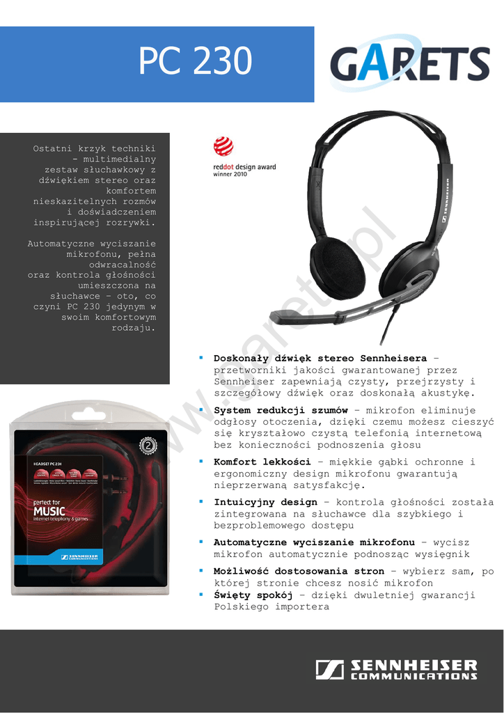 PC 230 pl Ostatni krzyk techniki - multimedialny zestaw słuchawkowy z dźwiękiem stereo oraz komfortem nieskazitelnych rozmów i doświadczeniem inspirującej rozrywki. ar et s. Automatyczne wyciszanie mikrofonu, pełna odwracalność oraz kontrola głośności umieszczona na słuchawce – oto, co czyni PC 230 jedynym w swoim komfortowym rodzaju. Doskonały dźwięk stereo Sennheisera – przetworniki jakości gwarantowanej przez Sennheiser zapewniają czysty, przejrzysty i szczegółowy dźwięk oraz doskonałą akustykę. .g System redukcji szumów – mikrofon eliminuje odgłosy otoczenia, dzięki czemu możesz cieszyć się kryształowo czystą telefonią internetową bez konieczności podnoszenia głosu Komfort lekkości – miękkie gąbki ochronne i ergonomiczny design mikrofonu gwarantują nieprzerwaną satysfakcję. Intuicyjny design – kontrola głośności została zintegrowana na słuchawce dla szybkiego i bezproblemowego dostępu Automatyczne wyciszanie mikrofonu – wycisz mikrofon automatycznie podnosząc wysięgnik Możliwość dostosowania stron – wybierz sam, po której stronie chcesz nosić mikrofon Święty spokój – dzięki dwuletniej gwarancji Polskiego importera w w w s. pl Dane Techniczne PC 230 40 44155 04777 6 6 15104 17506 8 504119 Połączenie w w Waga .g Informacje ogólne Długość kabla ar et Słuchawka Nr EAN Nr UPC P/N 3m / 9.8ft 2 x 3.5 mm dla komputera stacjonarnego/laptopa 85 g 18–22,000Hz Impedancja Dynamika 32Ω 113dB Mikrofon Pasmo przenoszenia Typ 80–15,000Hz Redukcja szumów NC Impedancja 2kΩ Czułość -40dBV/PA w Słuchawki Pasmo przenoszenia