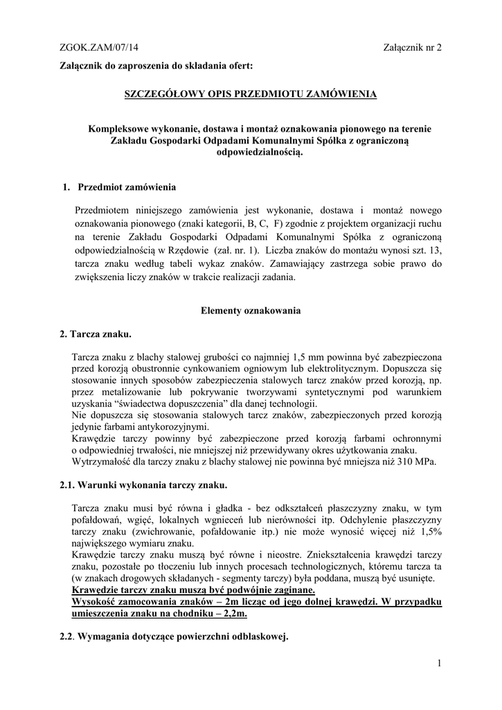 ZGOK.ZAM/07/14 Załącznik nr 2 1 Załącznik do zaproszenia do