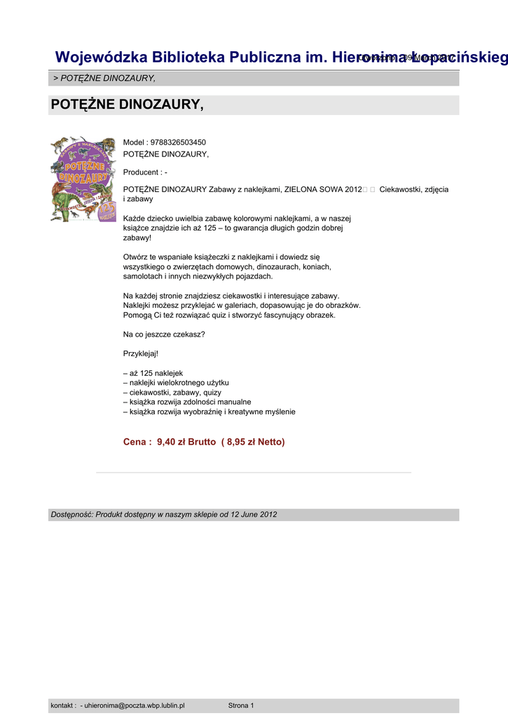 Utworzono : 09Łopacińskieg March 2017 Wojewódzka Biblioteka Publiczna im. Hieronima > POTĘŻNE DINOZAURY, POTĘŻNE DINOZAURY, Model : 9788326503450 POTĘŻNE DINOZAURY, Producent : POTĘŻNE DINOZAURY Zabawy z naklejkami, ZIELONA SOWA 2012�� Ciekawostki, zdjęcia i zabawy Każde dziecko uwielbia zabawę kolorowymi naklejkami, a w naszej książce znajdzie ich aż 125 – to gwarancja długich godzin dobrej zabawy! Otwórz te wspaniałe książeczki z naklejkami i dowiedz się wszystkiego o zwierzętach domowych, dinozaurach, koniach, samolotach i innych niezwykłych pojazdach. Na każdej stronie znajdziesz ciekawostki i interesujące zabawy. Naklejki możesz przyklejać w galeriach, dopasowując je do obrazków. Pomogą Ci też rozwiązać quiz i stworzyć fascynujący obrazek. Na co jeszcze czekasz? Przyklejaj! – aż 125 naklejek – naklejki wielokrotnego użytku – ciekawostki, zabawy, quizy – książka rozwija zdolności manualne – książka rozwija wyobraźnię i kreatywne myślenie Cena : 9,40 zł Brutto ( 8,95 zł Netto) Dostępność: Produkt dostępny w naszym sklepie od 12 June 2012 kontakt : - [email protected] Strona 1