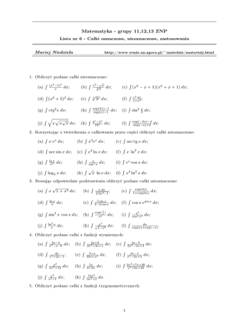 Matematyka - grupy 11,12,13 ZNP Lista nr 6 - Całki oznaczone, nieoznaczone, zastosowania http://www.wmie.uz.zgora.pl/∼ mniedzie/materialy.html Maciej Niedziela 1. Obliczyć podane całki nieoznaczone: (a) R (x2 −1)3 x dx; R (d) (x2 + 5)3 dx; ctg 2 x dx; (g) R (j) Rq p √ x x x dx; √ x2 − x √ 3x (b) R (e) R √ 4 (h) R exp(3x)−1 exp(x)−1 (k) R 2x −5x 10x R (c) (x2 − x + 1)(x2 + x + 1) dx; dx; 3x dx; dx; dx; (f) R x2 dx ; 1+x2 (i) R sin2 (l) R exp(−2x)−4 exp(−x)+2 x 2 dx; dx. 2. Korzystając z twierdzenia o całkowaniu przez części obliczyć całki nieoznaczone: R R R (a) x ex dx; (b) x3 ex dx; (c) arc tg x dx; R arc sin x dx; (e) R (g) R ln x x2 (h) R (j) R (k) R√ dx; log3 x dx; (f) R x ln2 x dx; dx; (i) R ex cos x dx; x ln x dx; (l) R x3 ln2 x dx. x2 ln x dx; (d) x sin2 x 3. Stosując odpowiednie podstawienia obliczyć podane całki nieoznaczone: √ (a) R x (d) R ln x x (g) R (j) R (c) R exp(3x) 1+exp(6x) (f) R cos x esin x dx; dx; (i) R x3 cos2 x4 dx; (l) R dx exp(x)+exp(−x) . x dx √ ; 3 2x2 −1 1 + x2 dx; (b) R dx; (e) R 5 sin x 3−2 cos x sin5 x cos x dx; (h) R exp( x1 ) x2 ln2 x x (k) R dx; 3 √x 1−x8 dx; 4. Obliczyć podane całki z funkcji wymiernych: R R R (a) x23x−4 dx; (b) 2x22x+6 dx; (c) −x−6 +3x+1 (d) R dx ; x2 +2x−1 (e) R 5+x 10x+x2 (g) R x2 5x2 +12 (h) R 5x 2+3x (j) R x4 x2 +1 (k) R 72x6 3x2 +2 dx; dx; dx; dx; dx; 4x−5 2x2 −5x+3 (f) R 2x−1 x2 −2x+5 (i) R 2x2 +7x+20 x2 +6x+25 dx. 5. Obliczyć podane całki z funkcji trygonometrycznych: 1 dx; dx; dx; dx; (a) R dx sin x ; (b) R sin2 x cos x dx; (c) R cos5 x 1+sin2 x (d) R sin x cos 3x dx; (e) R cos 2x sin 4x dx; (f) R tg5 x dx; (g) R sin3 x cos4 x dx; (h) R sin2 x cos2 x dx; (i) R cos x sin8 x (j) R cos3 x sin2 x dx; dx; dx. 6. Obliczyć podane całki oznaczone: (a) Re (d) R 1/2 (g) Rπ 1 x ln xdx; 0 0 √ dx dx; 1−x2 x sin xdx; (b) R1√ (e) (h) (c) R3 R2 (f) R1 R2 (i) R2 0 xdx; dx 0 x2 +4 ; dx −1 1+ex ; dx 2 1−x2 ; dx 0 x2 +2x+5 ; 1 ln xdx. 7. Obliczyć wartość średnią funkcji : (a) f (x) = x2 na przedziale [0, 2]; (b) g(x) = sin x na przedziale [0, π]; (c) h(x) = ln x na przedziale [1, e]. x+1 dla 1 dla 8. Niech f : [−1, 4] → R będzie funkcją określoną wzorem f (x) = x−1 dla 2 x dla Rx Wyznaczyć funkcję F określoną wzorem F (x) = −1 f (t)dt dla x ∈ [−1, 4]. −1 ≤ x < 0 0≤x<1 1≤x≤2 2<x≤4 9. Obliczyć podane całki oznaczone: (a) R5 (d) R1 (g) R π/2 x 3 x2 −4 dx; √ 2x−3 1/2 3+4x−4x2 0 dx; (x + 1) cos x dx; (b) R −2 (e) R2 (h) R π/2 dx −3 x2 +2x+1 ; (c) R 2/5 e2x 0 1+ex (f) R1 (i) R π/2 0 dx; sin 2x cos3 x dx; dx −2/5 4+25x2 ; 0 xe−x dx; 0 √ cos x 1+sin x dx. 10. Obliczyć pole obszaru ograniczonego krzywymi: (a) y = x2 i y 2 = x; (b) y 2 = x i x2 = 8; (c) y = 2x3 i y 2 = 4x; (d) y = x3 i y 2 = x; (e) y 2 = 2x i x2 + y 2 − 4x = 0; (f) y = x2 i 2x − y + 3 = 0; (g) xy = 4 i x + y = 5; (h) (x − 6)2 + y 2 = 36 i y 2 = 6x. 11. Obliczyć długości następujących łuków: (a) y 2 = 4x3 , y > 0, 0 ≤ x ≤ 89 ; (b) 9y 2 = 2x3 , 0 ≤ x ≤ 2; (c) 3y 2 = 4x3 , 0 ≤ x ≤ 1; √ (d) y = 2 x, A = (1, 2), B = (9, 6); (g) y 2 = 2x − x2 , 0 ≤ x ≤ 1; (h) y = 1 − ln cos x, 0 ≤ x ≤ π4 ; (j) x = t2 , y = t − 31 t3 , 0 ≤ t ≤ √ 3; (k) x = a cos4 t, y = a sin4 t, a > 0, 0 ≤ t ≤ π2 ; . 2 12. Obliczyć objętości brył powstałych z obrotu figur T wokół wskazanych osi: (a) T : − π2 ≤ x ≤ π2 , 0 ≤ y ≤ cos x, Ox; (b) T : 0 ≤ x ≤ 1, 0 ≤ y ≤ e−x , Oy; (c) T : −1 ≤ x ≤ e, ln2 x ≤ y ≤ ln x, Ox; (d) T : 0 ≤ x ≤ 1, x2 ≤ y ≤ √ x, Oy. 13. Obliczyć pola powierzchni powstałych z obrotu wykresów podanych funkcji wokół wskazanych osi: √ (a) f (x) = x3 , 0 ≤ x ≤ 1, Ox; (b) f (x) = 2 x, 0 ≤ x ≤ 1, Oy; (c) f (x) = √ 4 − x2 , −1 ≤ x ≤ 1, Ox; (d) f (x) = √ x(1 − x3 ), 1 ≤ x ≤ 3, Oy. 2 14. Cena p pewnego towaru jest następującą funkcją podaży x tego towaru: p(x) = xe−x . Obliczyć średnią wartość ceny tego towaru przy wzroście podaży od 4 do 8. 15. Do magazynu dostarczamy towar. Dostawa rozpoczyna się o godz. 10 (t = 0) i jej natężenie w chwili t wynosi f (t) = 10 + te−t jednostek towaru na godzinę. Obliczyć, ile towaru zostanie dostarczone do magazynu od początku dostawy do godz. 18 tego samego dnia. 16. Zysk z eksploatacji pewnego urzędzenia zakupionego do przedsiębiorstwa wynosi Z(t) = 40 − t2 tys. zł na rok, gdzie t oznacza czas eksploatacji mierzony w latach. Koszty związane z eksploatacją urządzenia wyrażają się wzorem K(t) = t2 = 6t+4 tys. zł na rok. Obliczyć łączny zysk osiągnięty z eksploatacji tego urządzenia. 17. Krzywa popytu zadana jest wzorem p = −x2 + 11, a krzywa podaży wzorem p = x2 − 4x + 5. Wyznaczyć nadwyżkę (stratę) producenta i konsumenta. 3