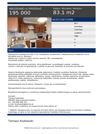MIESZKANIE na SPRZEDAŻ 195 000 Radom, Michałów, Mieszka I 83.1 m2 60357/3877/OMS 83.1 Secondary 2 347 PLN LowBlock 1989 4 4 4 Opis Mieszkanie o powierzchni 83,1 m2, rozkładowe, przestronne, zlokalizowane w Radomiu na os. Michałów przy ul. Mieszka I. Składa się z czterech pokoi, kuchni, łazienki, WC i przedpokoju. Przynależy balkon i piwnica. Mieszkanie do własnej aranżacji, okna plastikowe, na podłogach panele i terakota. Czynsz z zaliczką na ogrzewanie, z opłatą za gaz jest niewysoki w stosunku do metrażu. Idealna lokalizacja zapewnia doskonałe połączenie z każdym punktem Radomia. Położenie gwarantuje bliską odległość licznych punktów rekreacyjnych i usługowych takich jak: apteka, bank, bankomat, bazarek, cukiernia, delikatesy, fryzjer, kwiaciarnia, market, piekarnia, przychodnia, sklep 24 h, sklep spożywczy. Instytucje: biblioteka, kościół, poczta, przedszkole, szkoła podstawowa, szpital, rehabilitacja. Zainteresowała Cię ta oferta? Zadzwoń i umów się na prezentację ! Wynagrodzenie biura pokrywa sprzedający. Bezpłatnie pomagamy w uzyskaniu najlepszego kredytu hipotecznego na zakup nieruchomości. Kontakt: Tomasz Kozłowski PÓŁNOC Nieruchomości Radom tel: +48 608-269-761 e-mail: [email protected] Więcej ofert znajdziesz na naszej stronie www.polnoc.pl * UWAGA! Zamieszczone na naszych stronach oferty nie stanowią oferty w rozumieniu Kodeksu Cywilnego, a dane w nich zawarte mają jedynie charakter informacyjny. Tomasz Kozłowski PÓŁNOC Nieruchomości - ogólnopolska sieć biur nieruchomości www.polnoc.pl tel. 608-269-761 email: [email protected] PÓŁNOC Nieruchomości - ogólnopolska sieć biur nieruchomości www.polnoc.pl Powered by TCPDF (www.tcpdf.org)